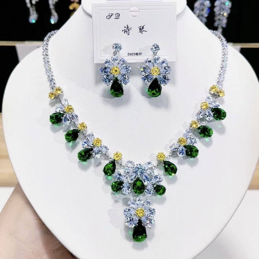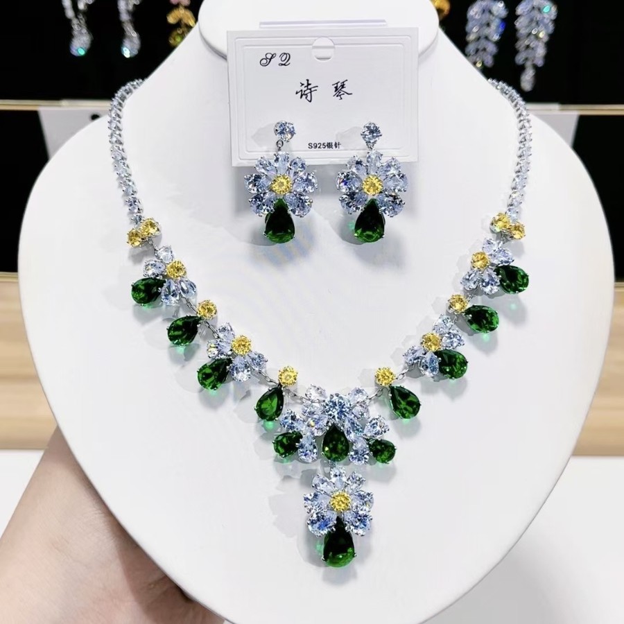 European and American Style Heavy Industry Zircon Luxury Necklace Earrings suit Green Bee Flower Necklace Versatile Temperament High-grade Necklace