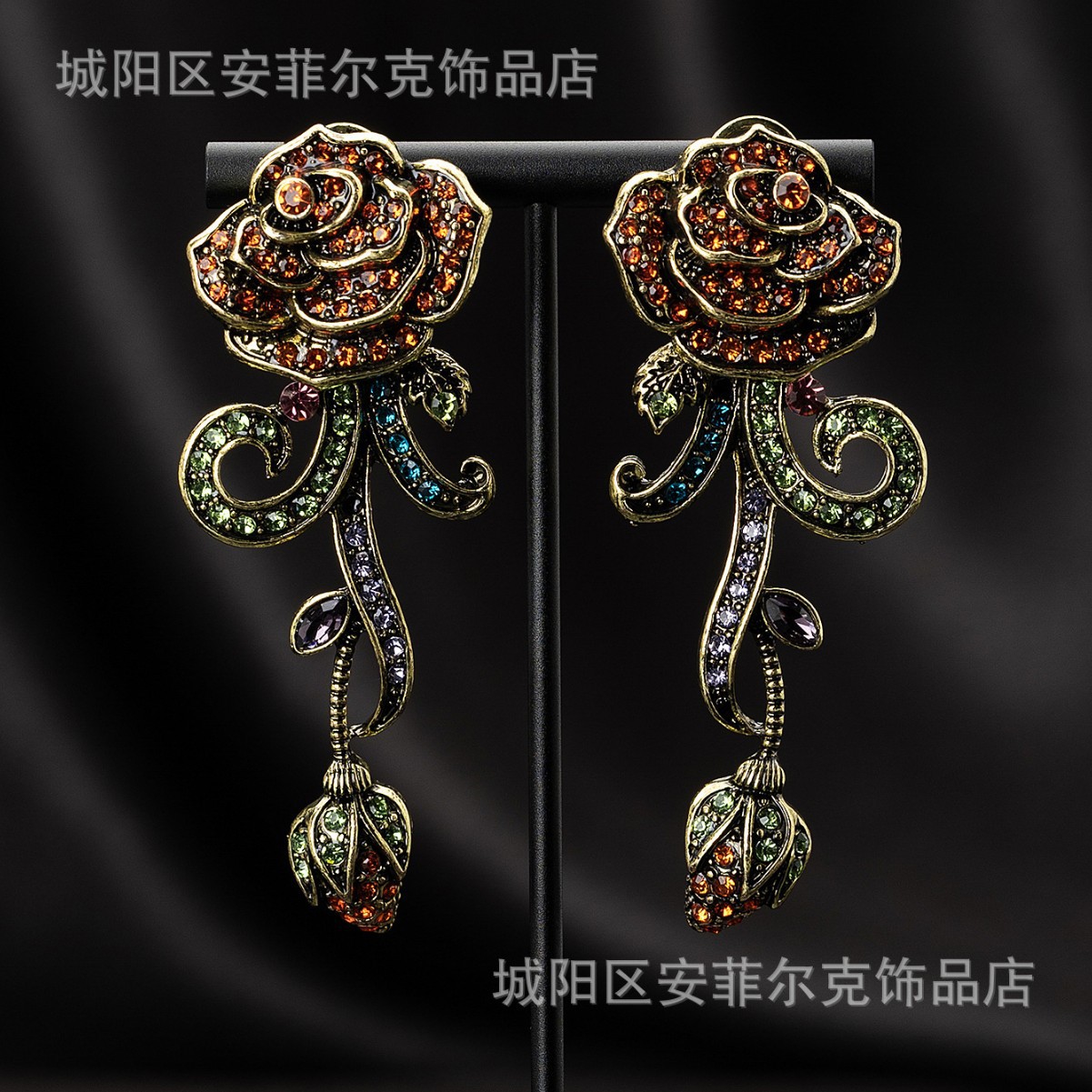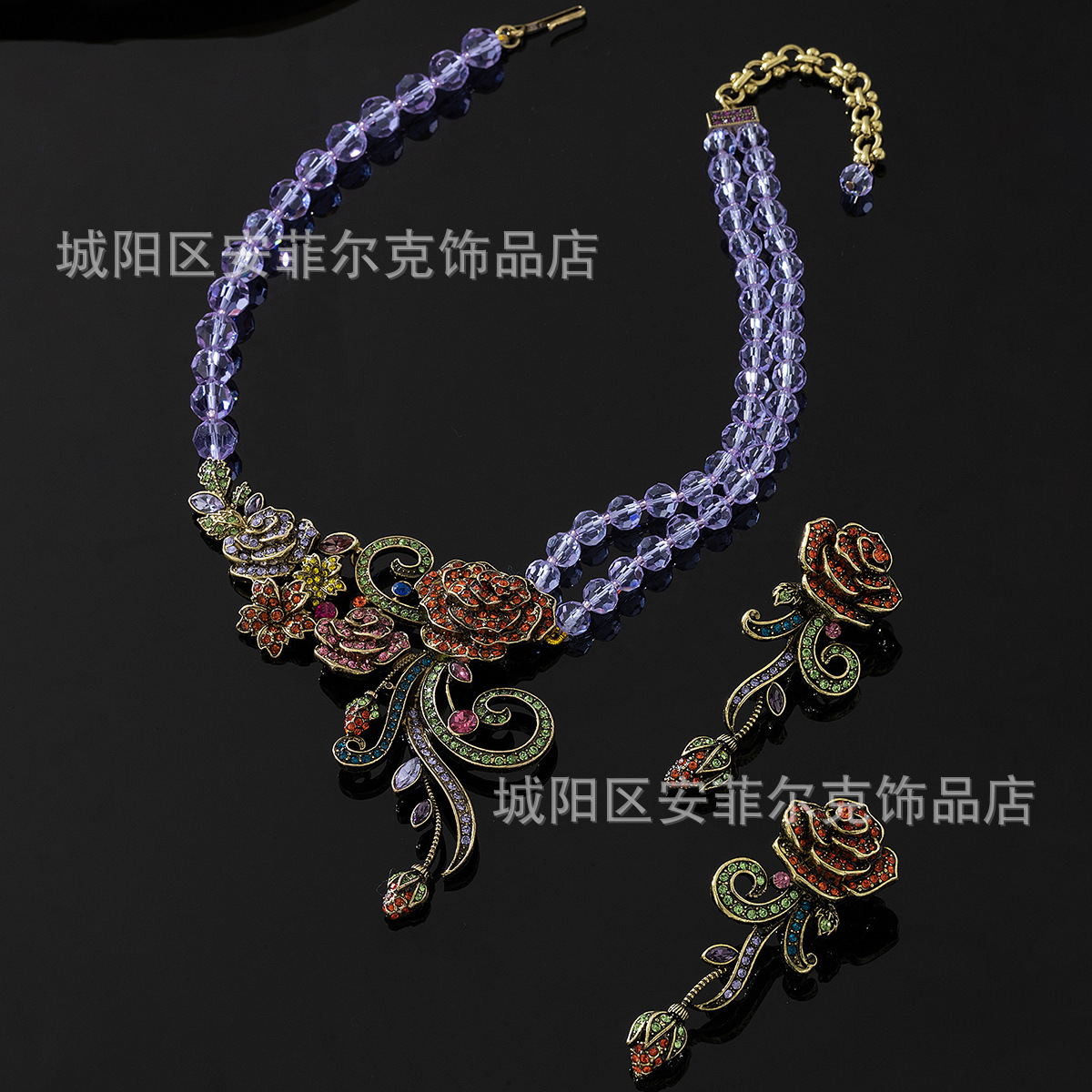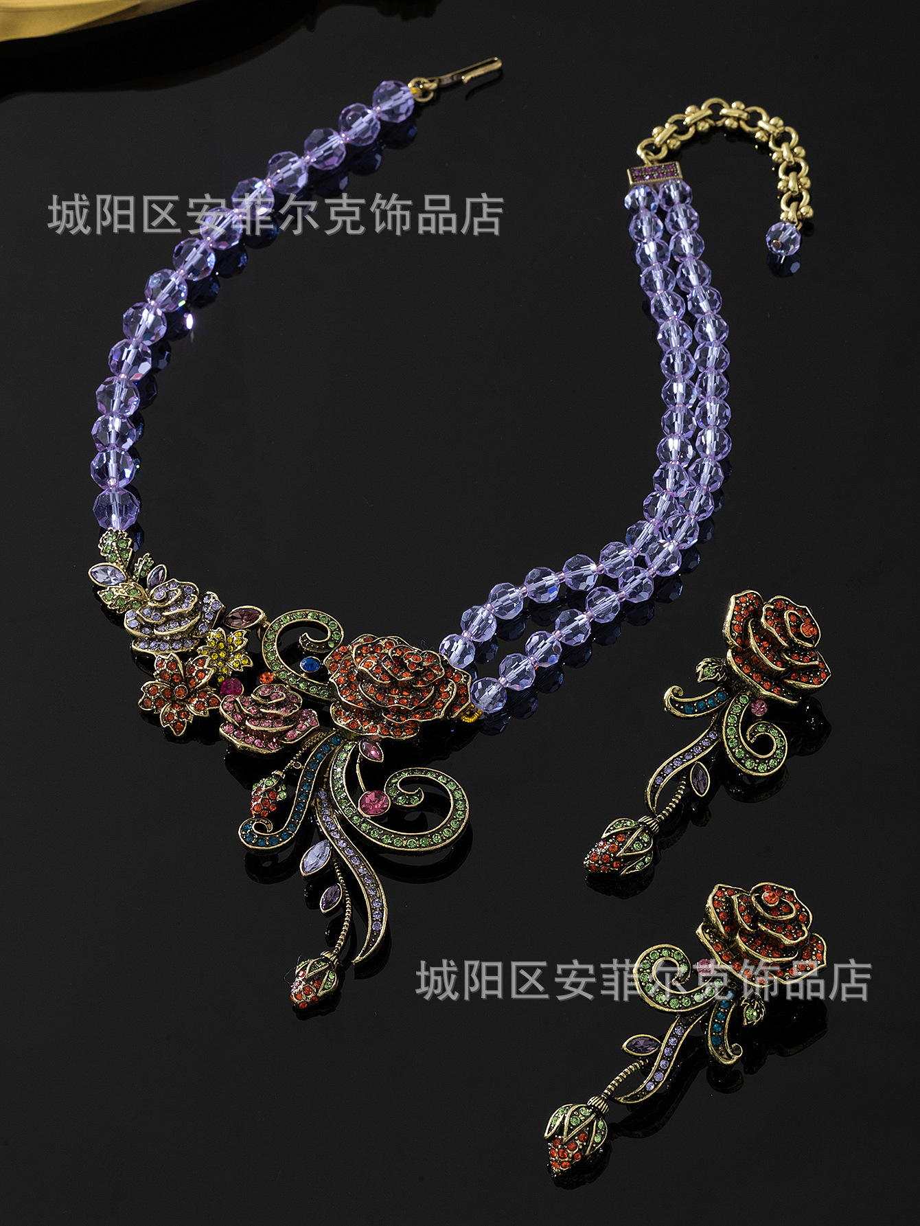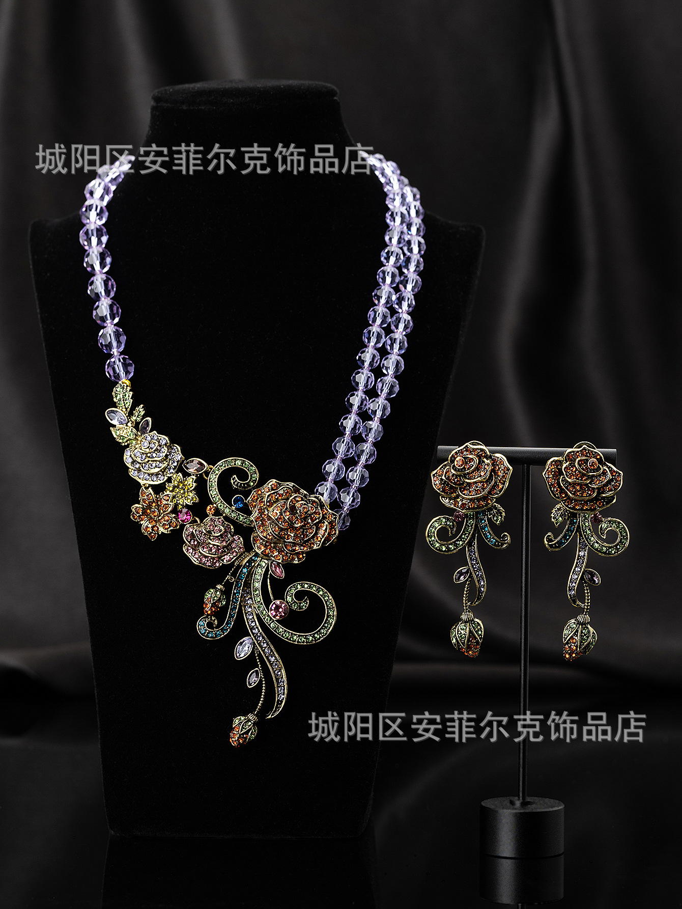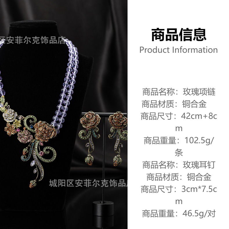 Qingdao Vintage Set of European and American Retro Full Diamond Red Gemstone Earrings, Elegant and Luxurious Rose Necklace and Earrings Set