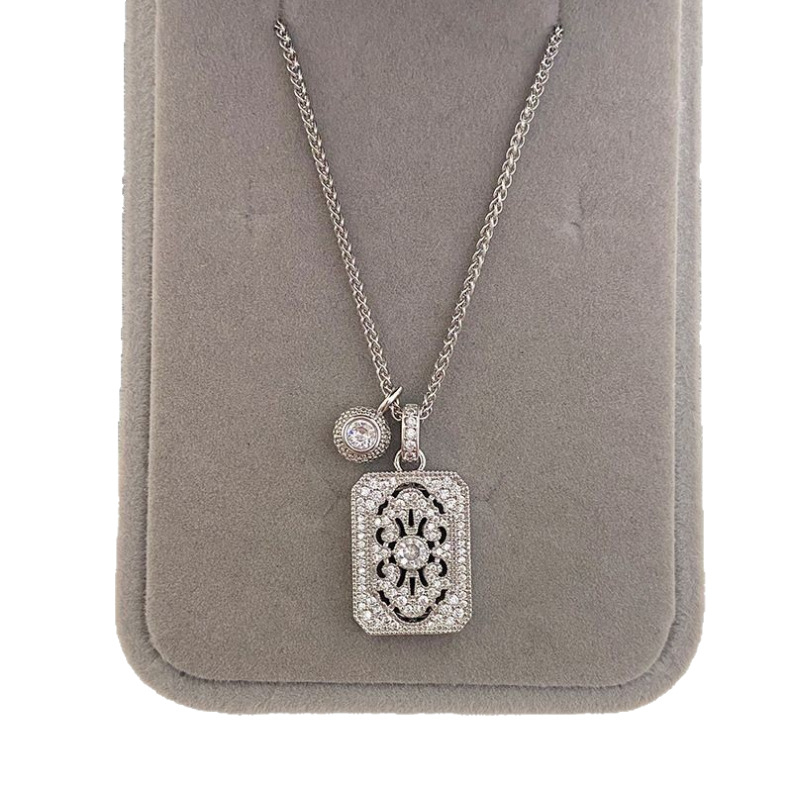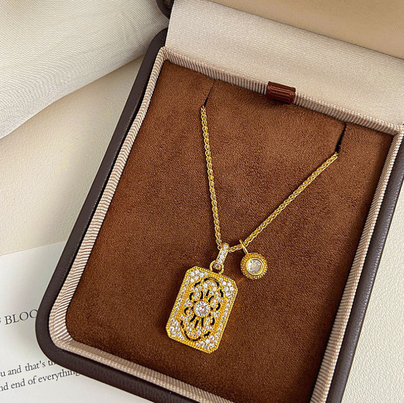 Light Luxury Full Diamond Zircon Square Necklace, Niche Vintage Plain Sweater Chain Pendant, Gold Clavicle Chain