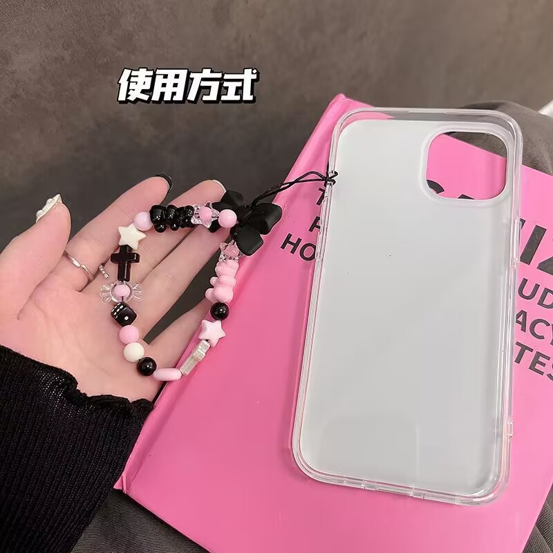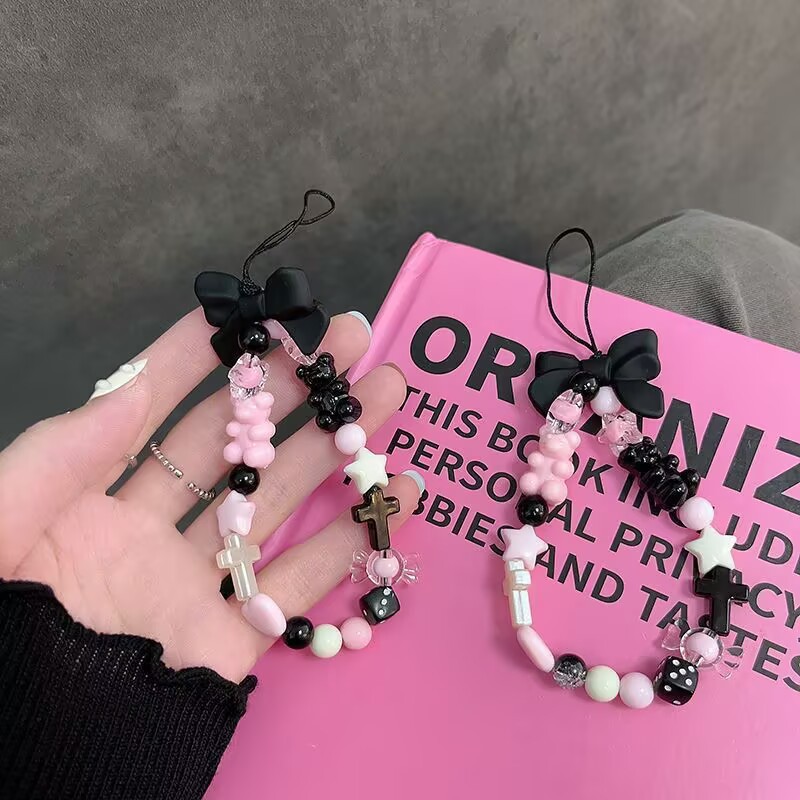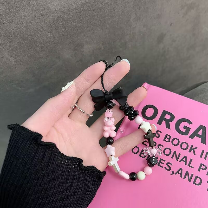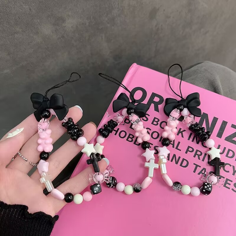 Girly Pink Mixed with Black Bow Bear Mobile Phone Hanging Chain Ccd Camera Pendant Hanging Chain Anti-Lost Hand Rope
