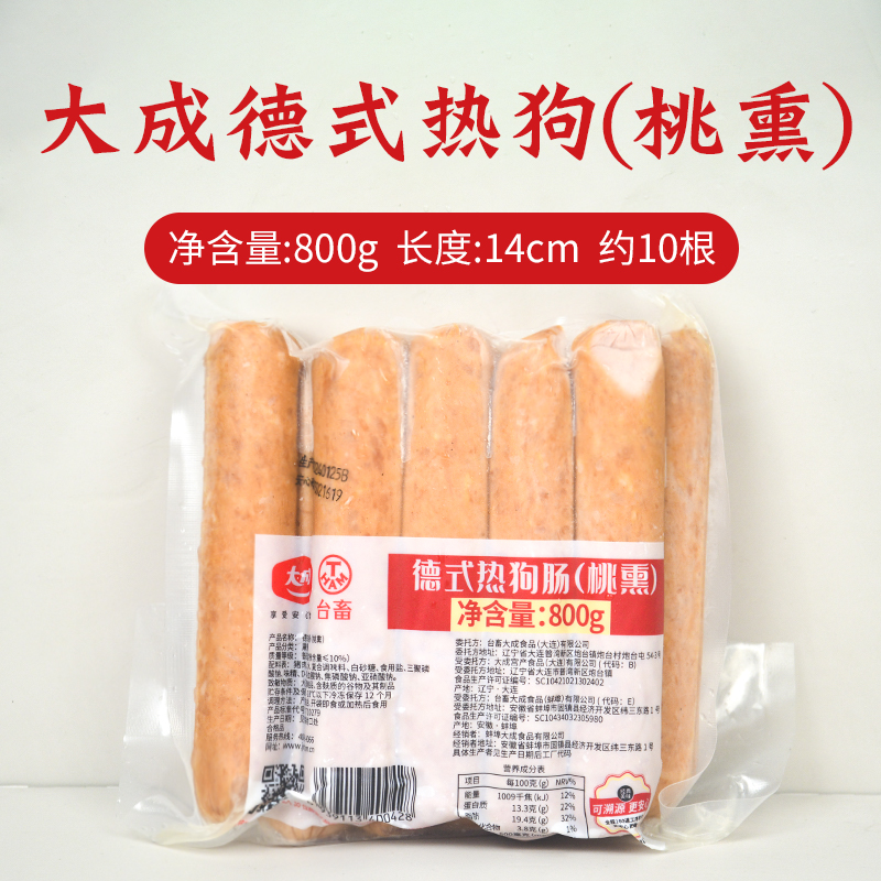 Packaging specifications: Dacheng 80g german hot dog sausage (peach smoked) 800g