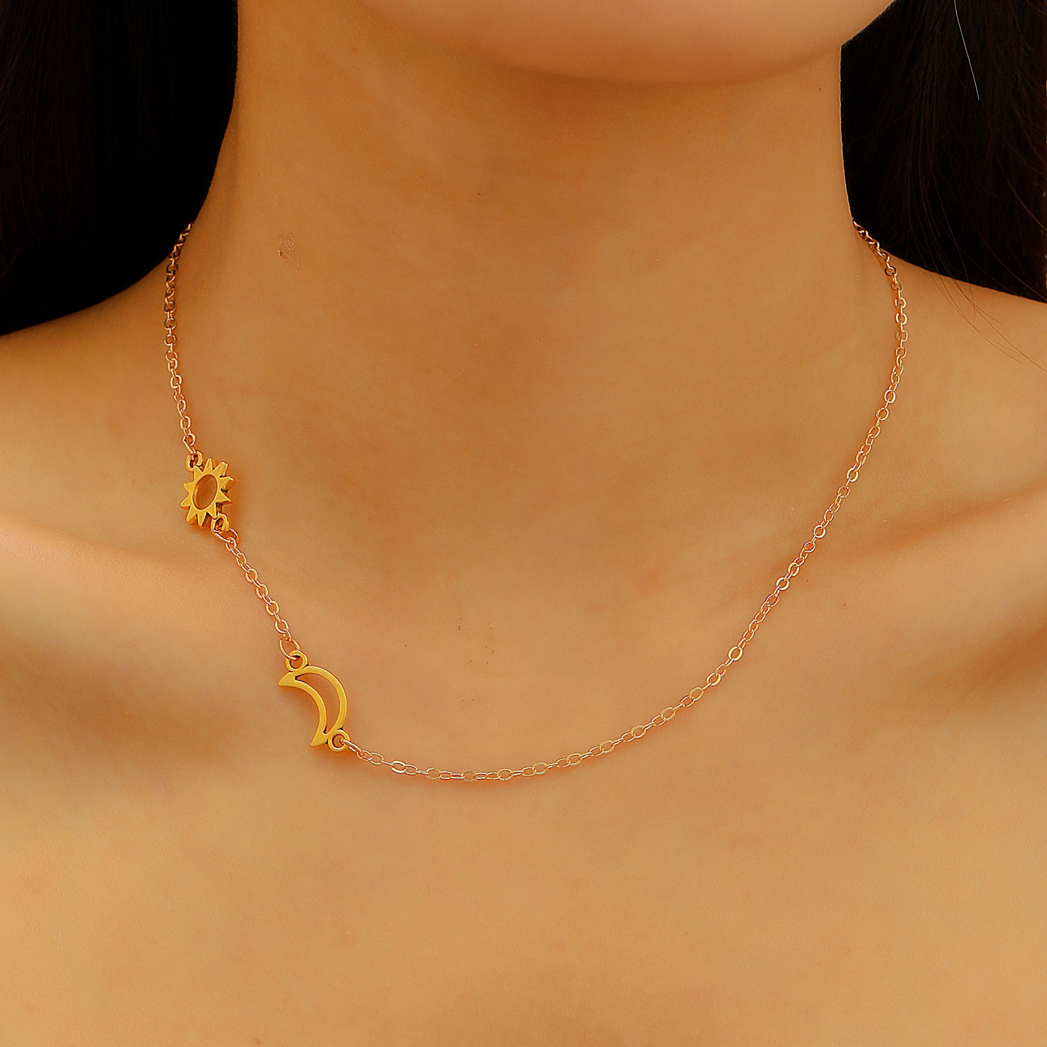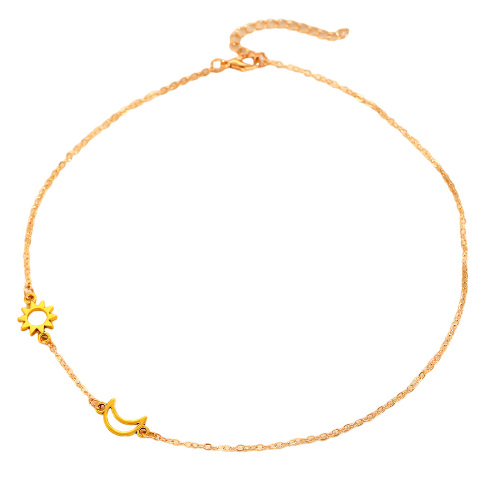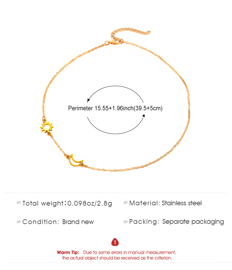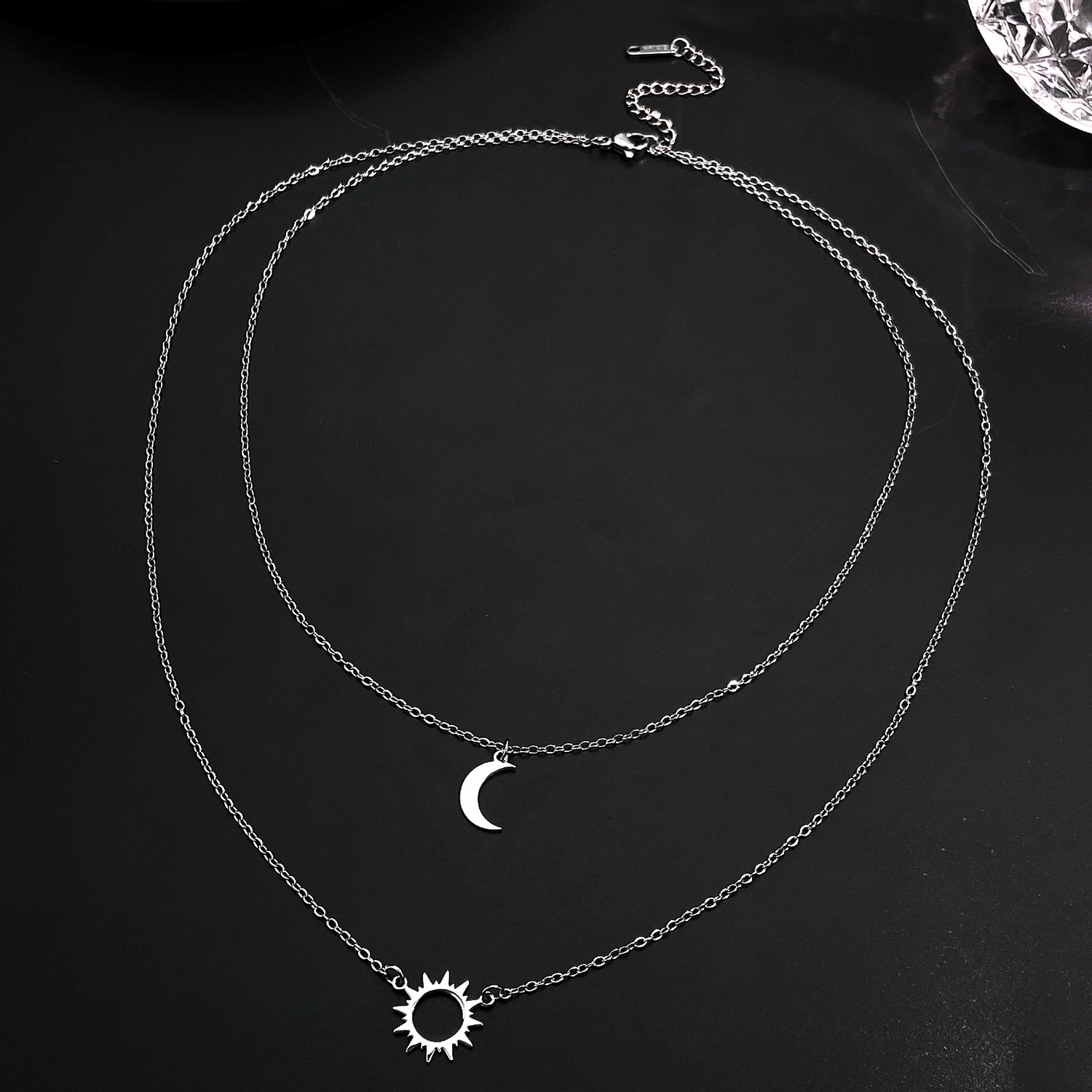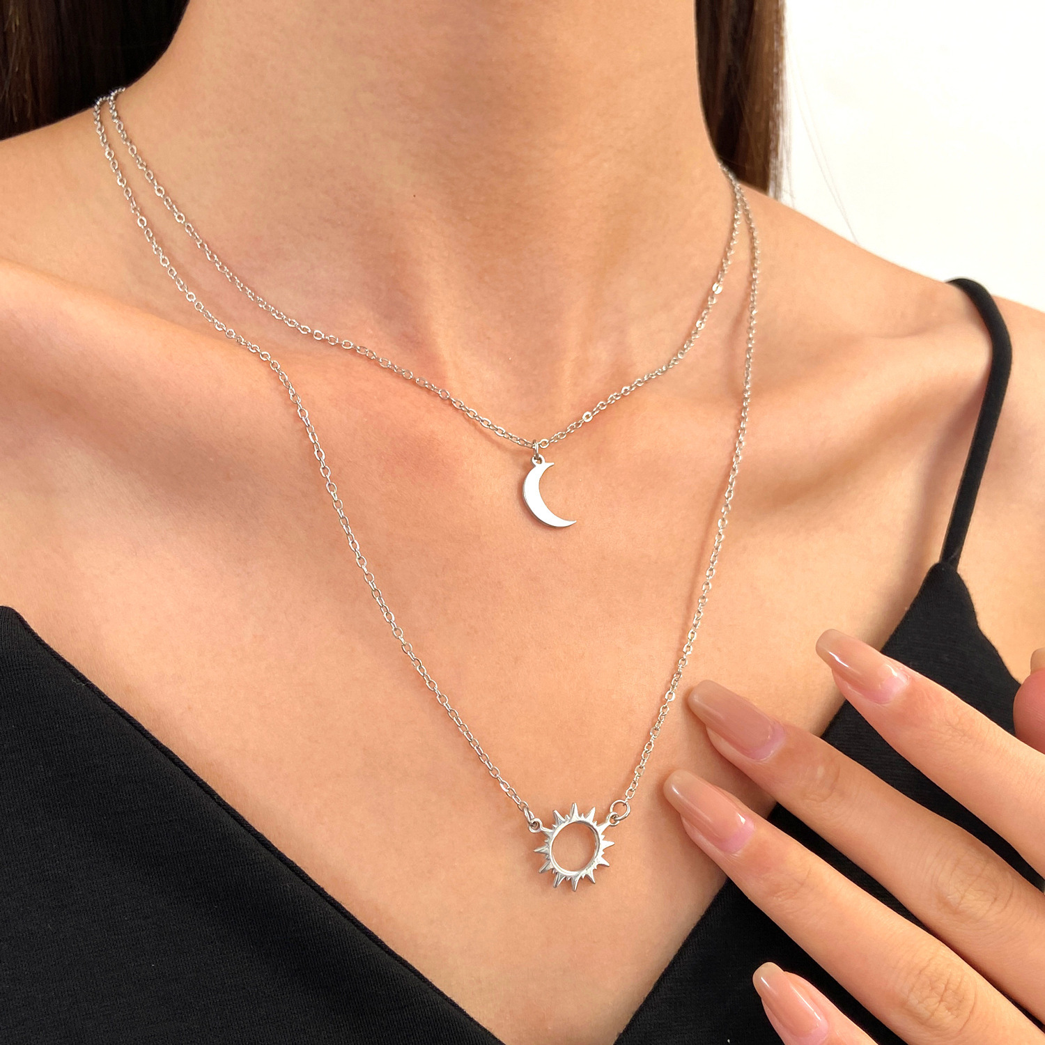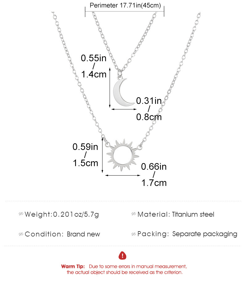 Double layered necklace: Cross-border new silver sun and moon necklace titanium steel simple geometric clavicle chain ins cold style sweater chain wholesale
