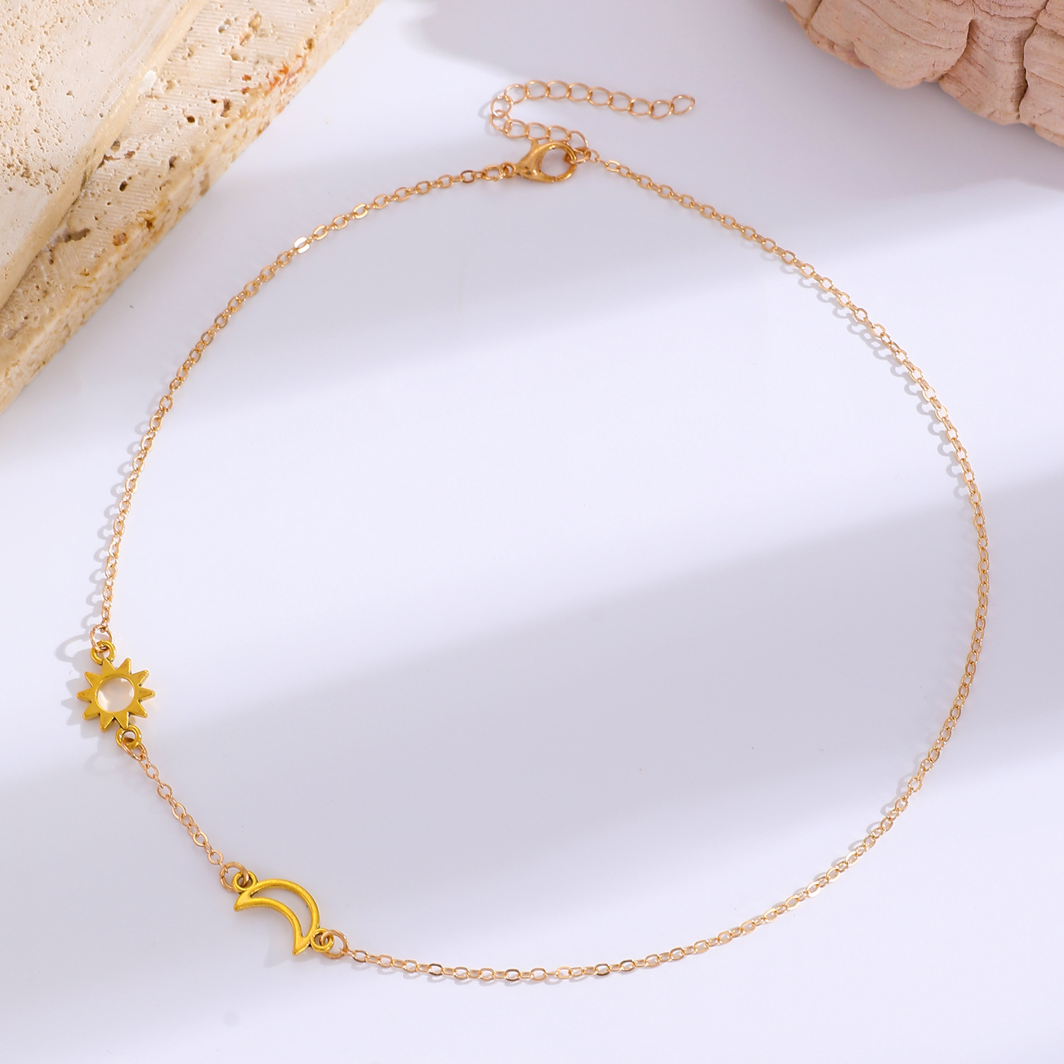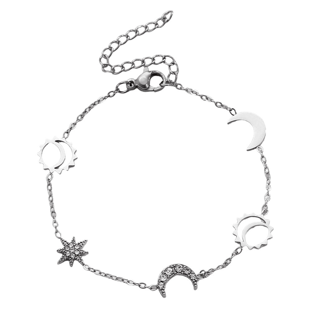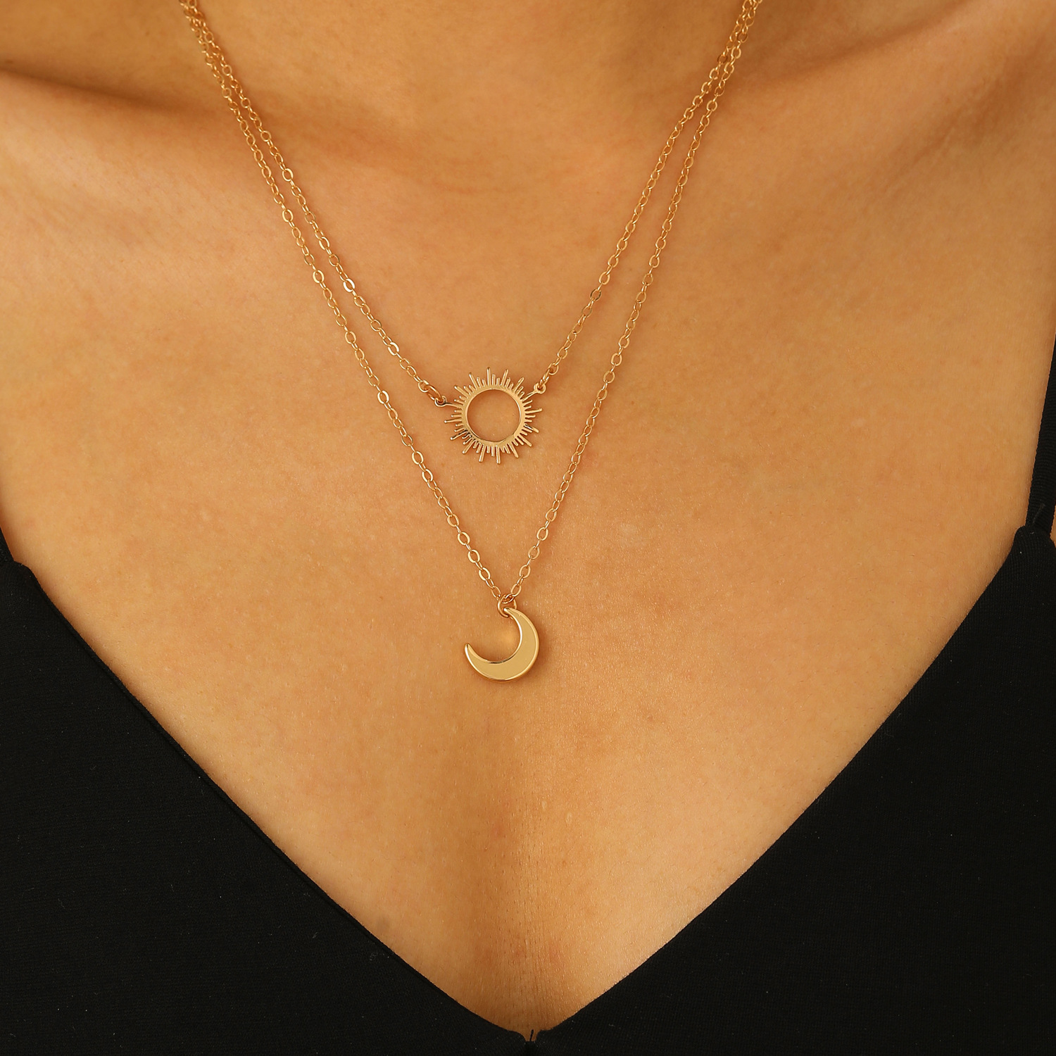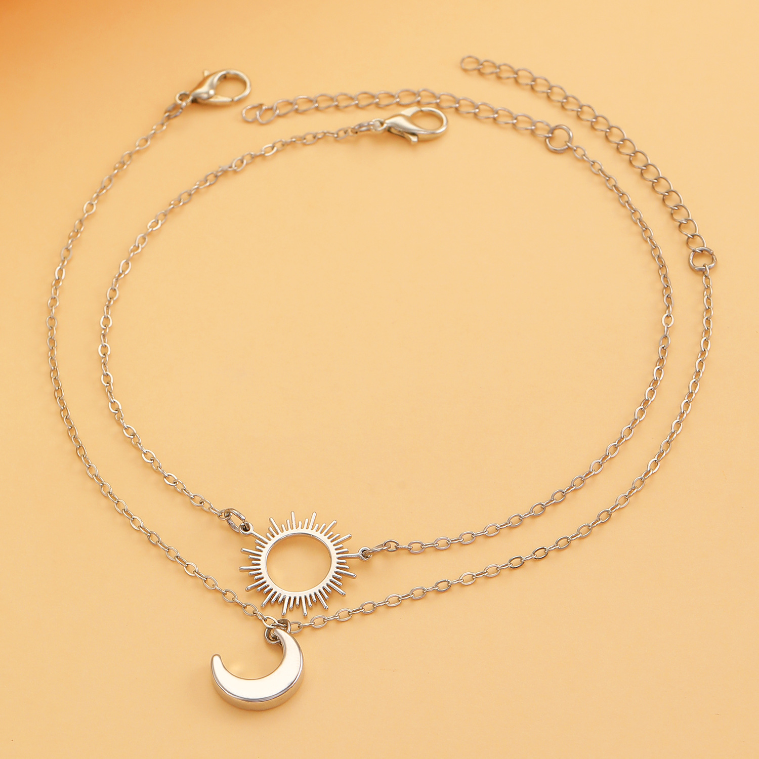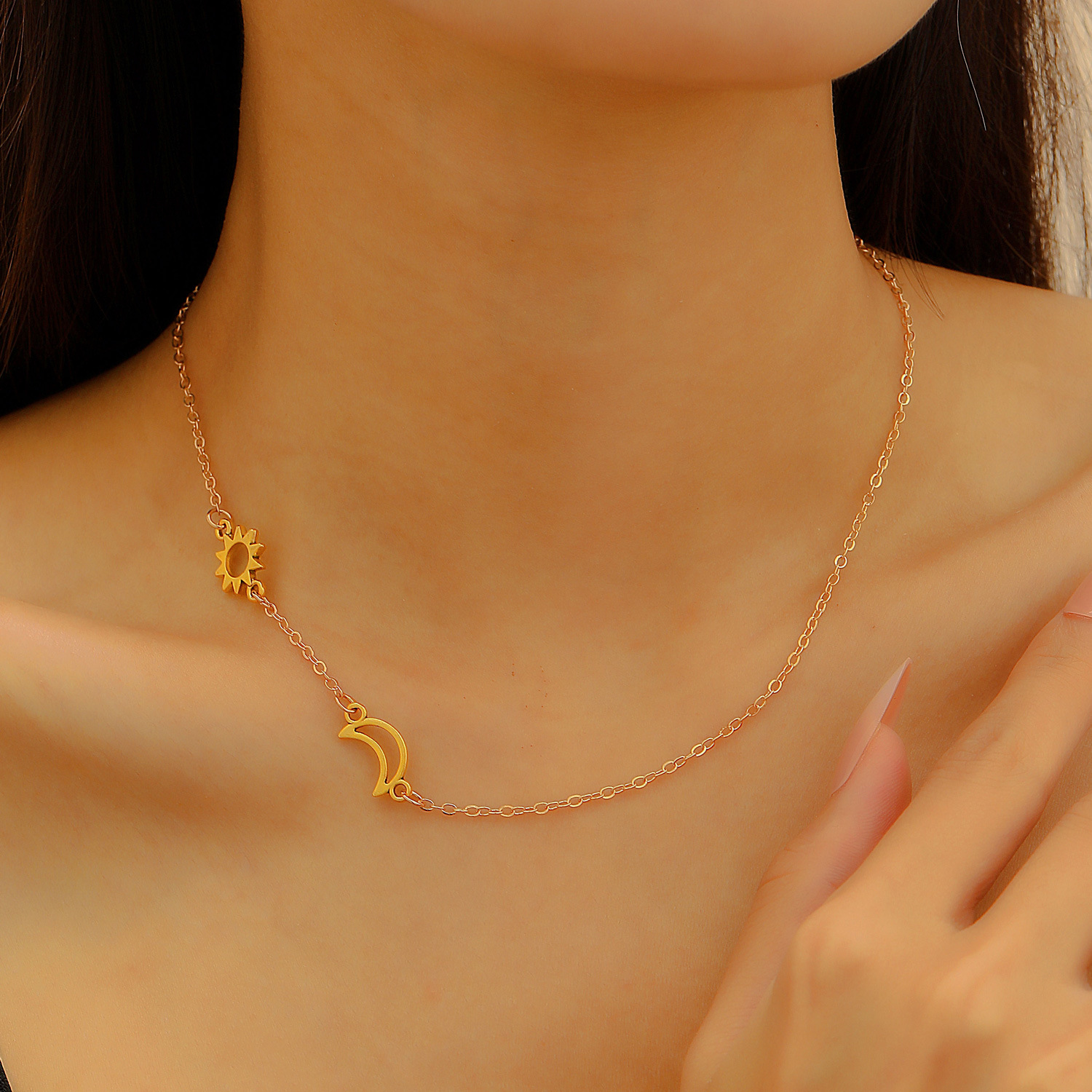 Double layered necklace: Cross-border new silver sun and moon necklace titanium steel simple geometric clavicle chain ins cold style sweater chain wholesale