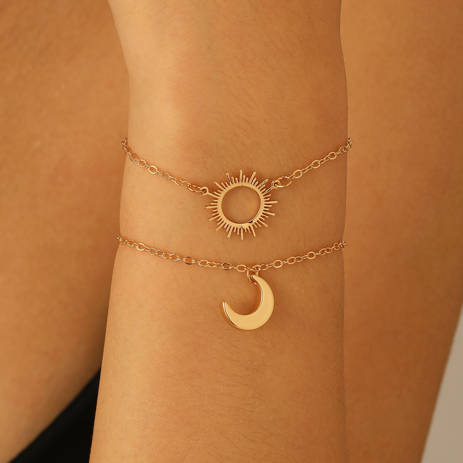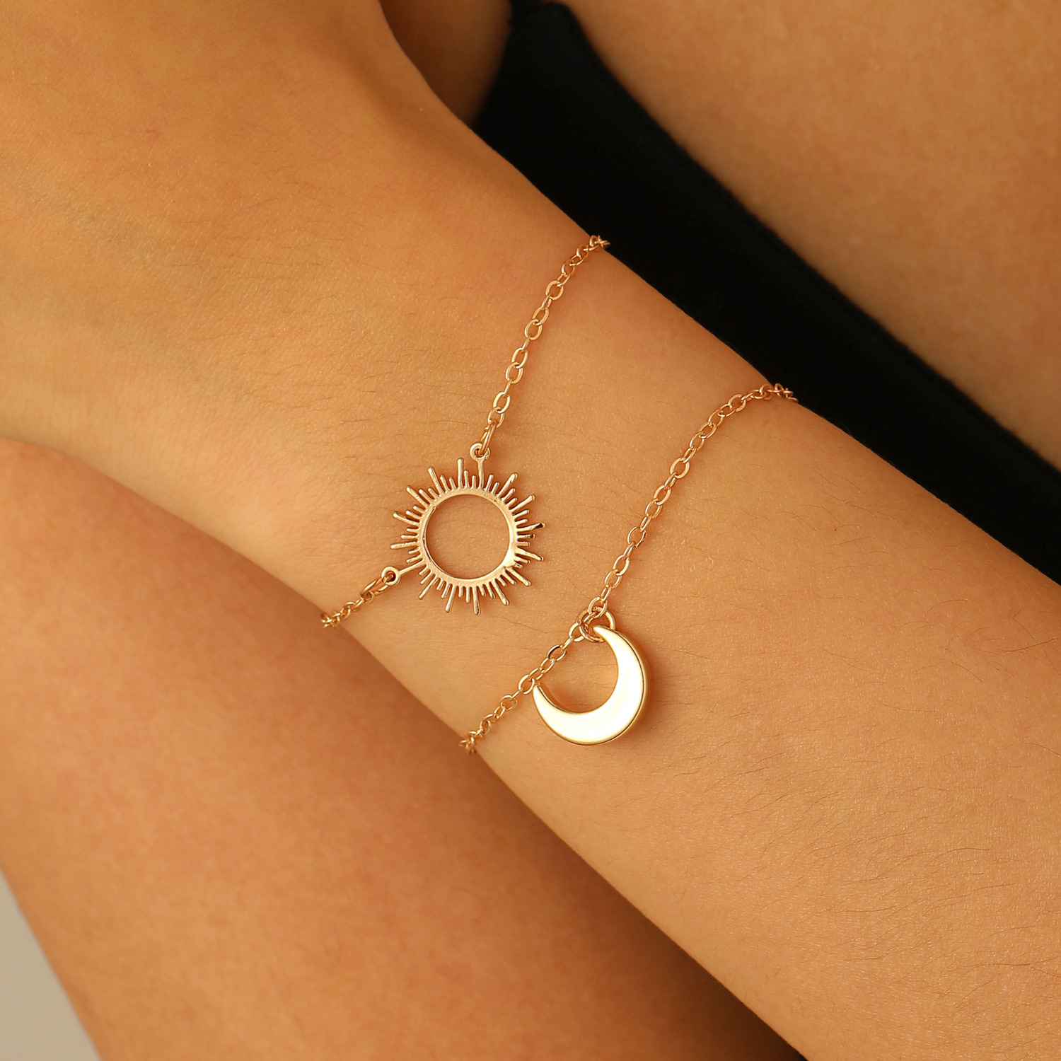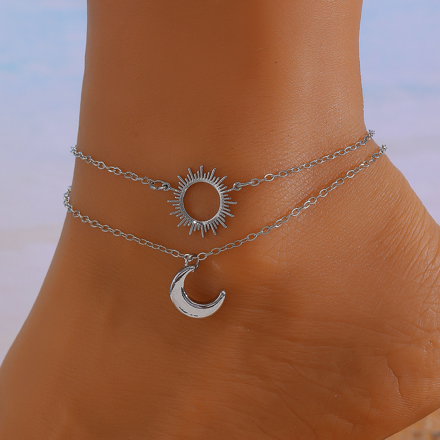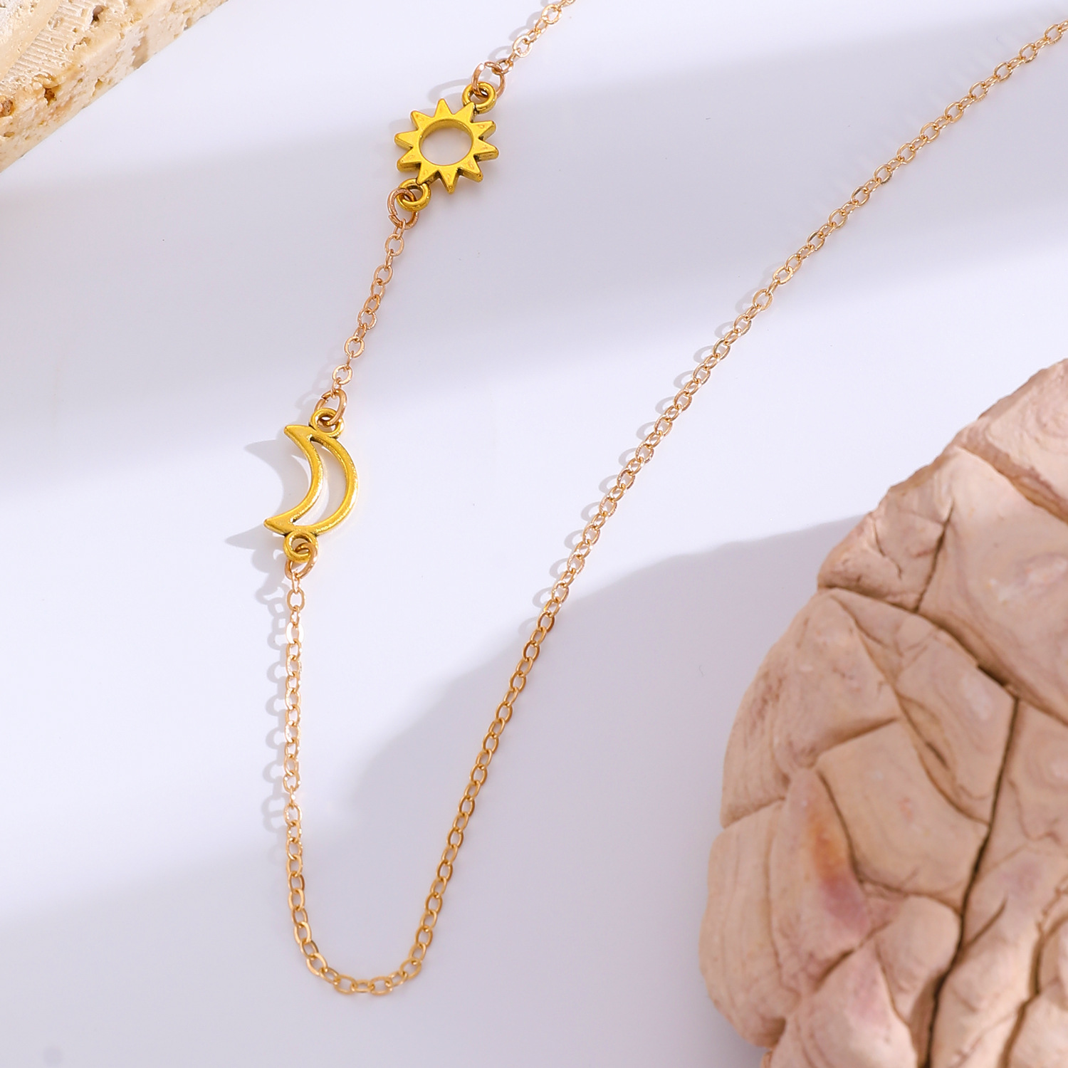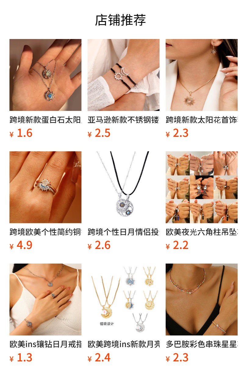 Double layered necklace: Cross-border new silver sun and moon necklace titanium steel simple geometric clavicle chain ins cold style sweater chain wholesale