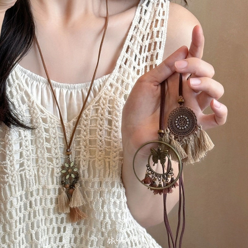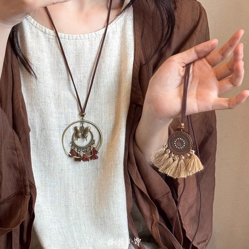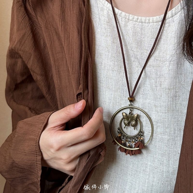 Bohemian brown Vintage Tassel Necklace Hippie Ethnic Style Niche 2025 New Butterfly Pendant Woolen Chain