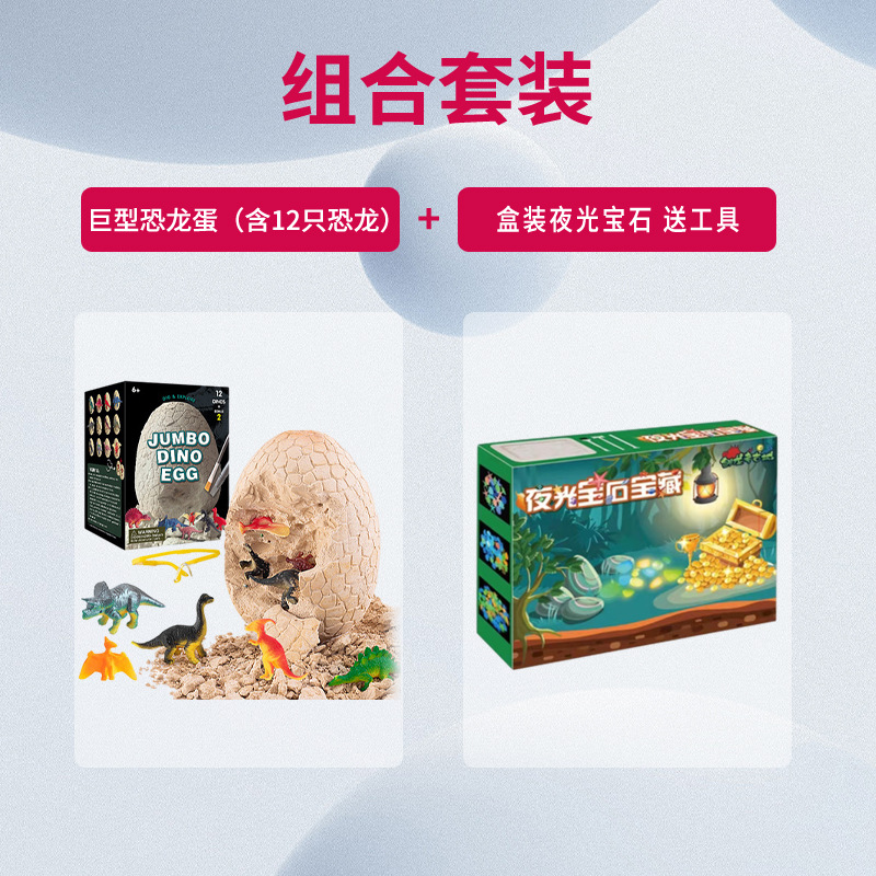 Color: Two boxes: giant dinosaur eggs + luminous gems, two sets of tools included