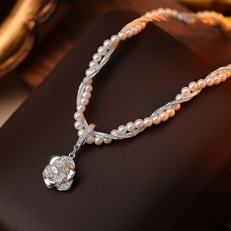 Color: Double-wrapped beads—silver diamond camellia pendant