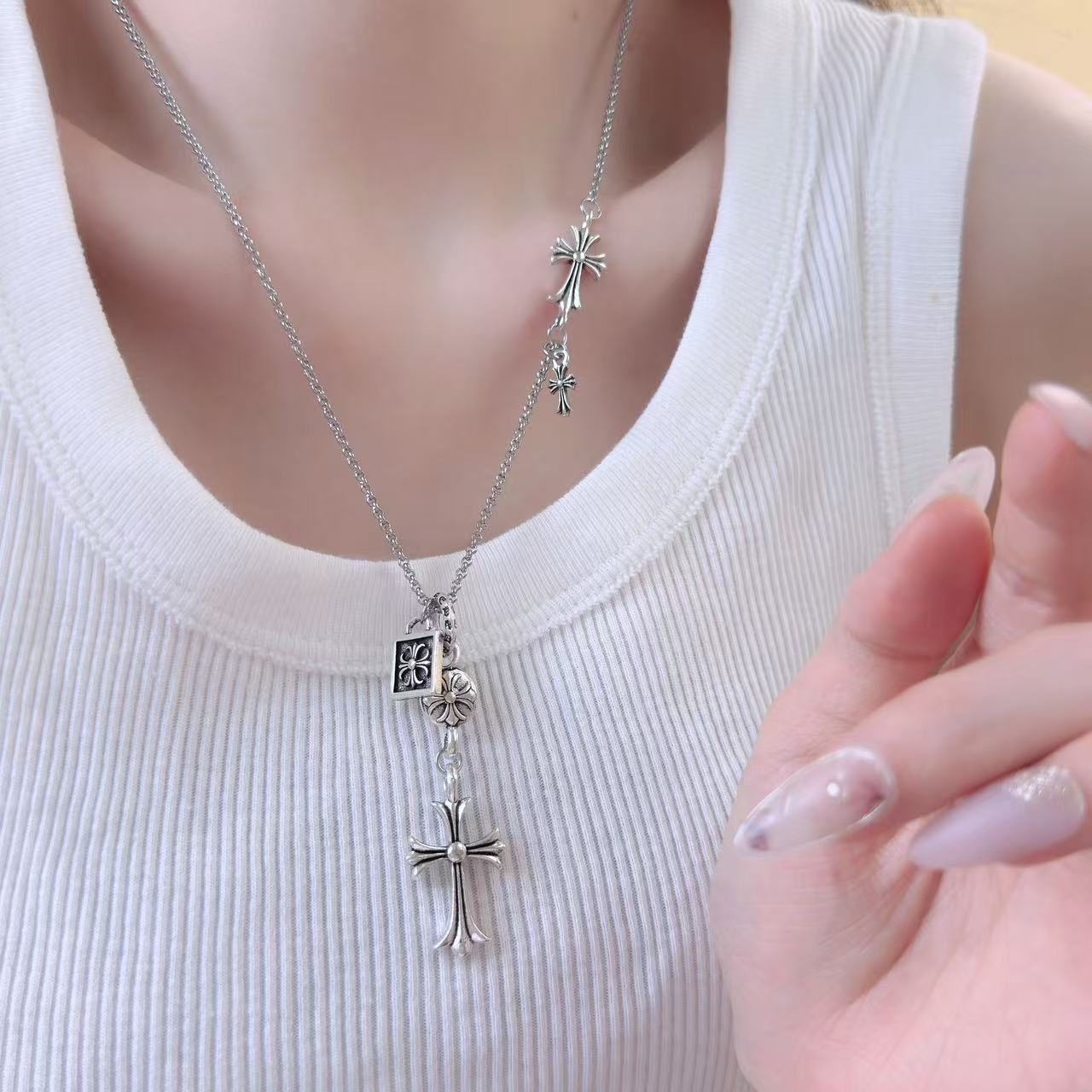 Tide Cool Hot Girl Personality Street Hip-Hop Ins Harajuku Style Cross Tassel Long Necklace Women Couple's Woolen Chain