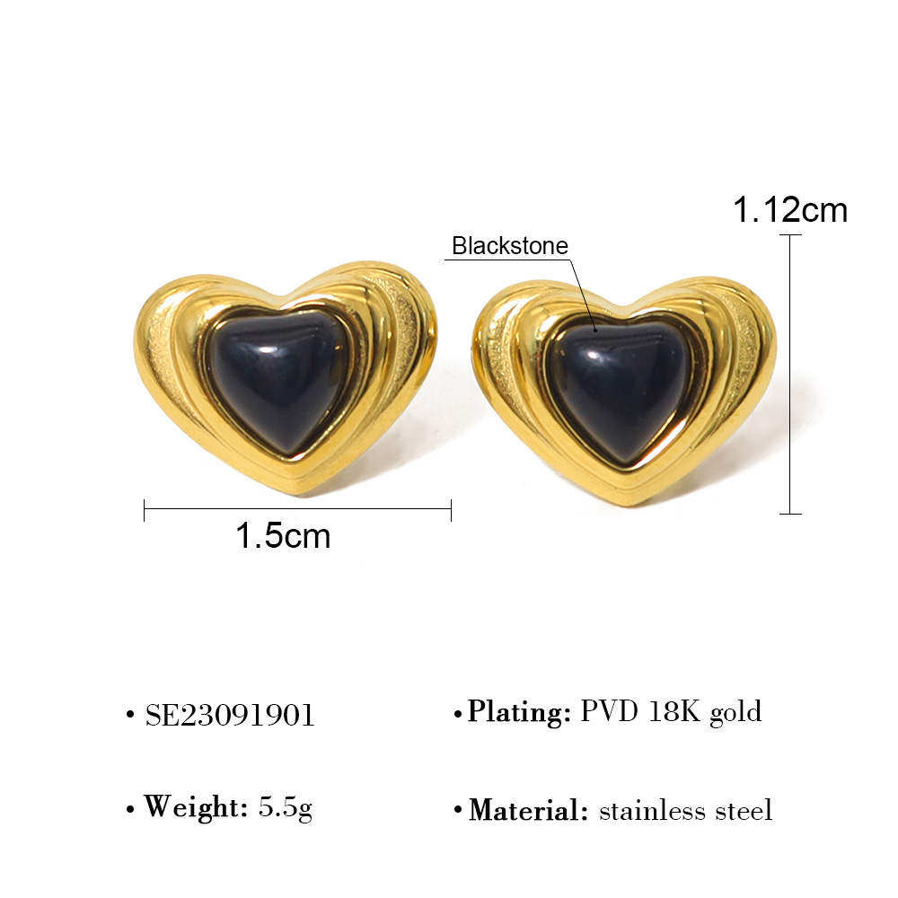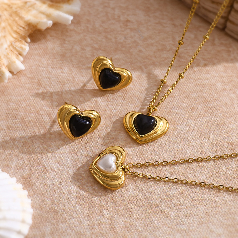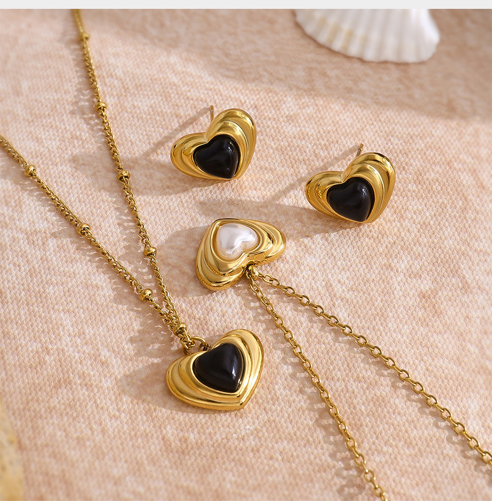 French Retro Heart Shape Inlaid Black Stone Necklace Earrings Set Titanium Steel Plated Real Gold Non-Fading Clavicle Chain for Women