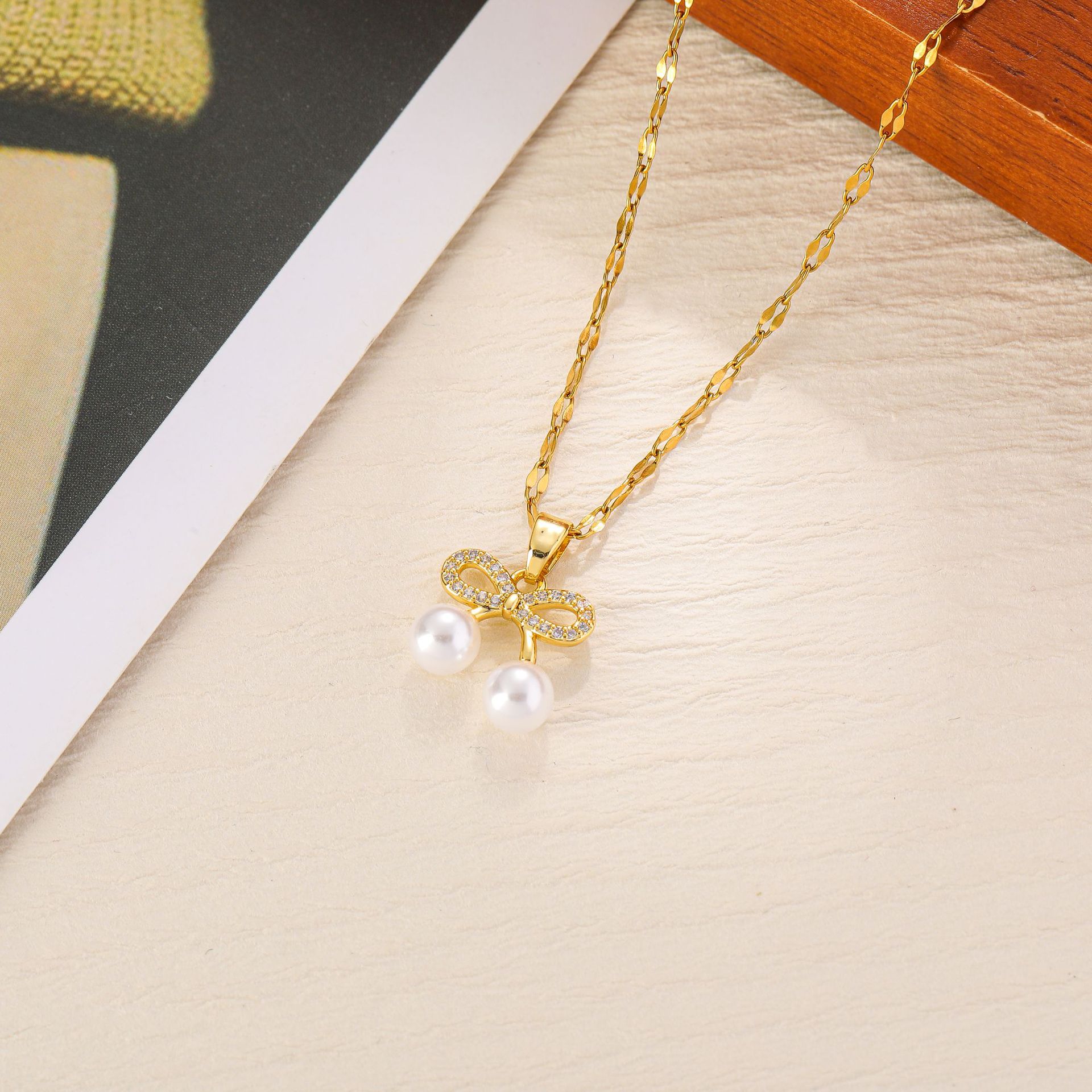 Cross-Border Bowknot Pearl Titanium Steel Necklace for Women, Mixed Color Niche High-End Earrings, Light Luxury Non-Fading Jewelry Set