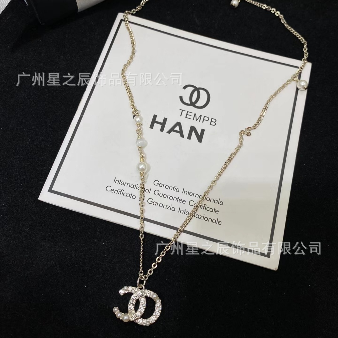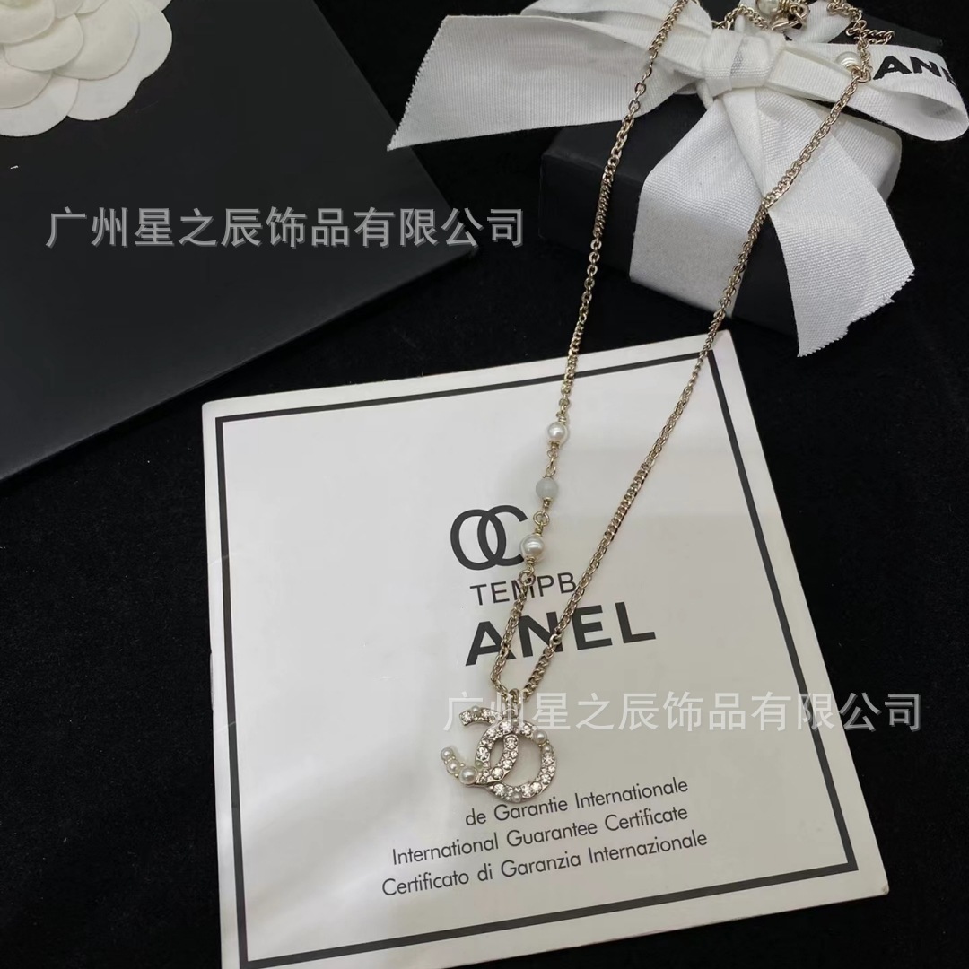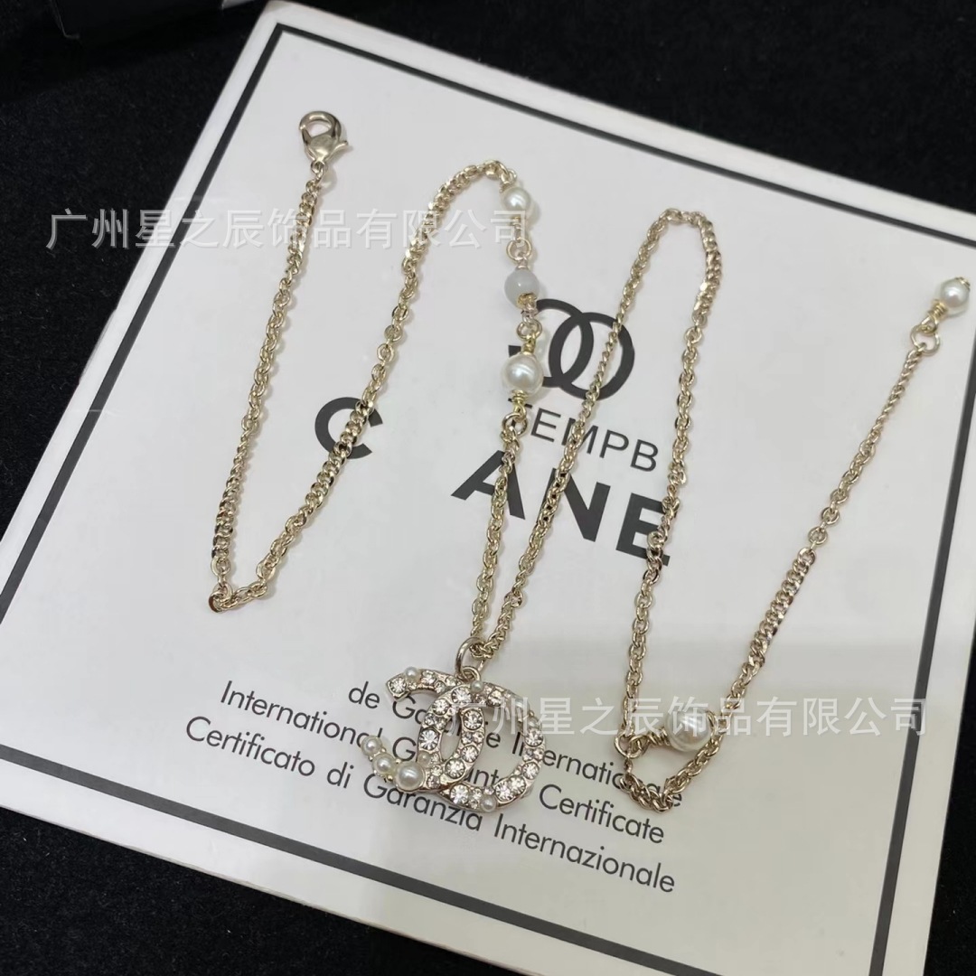 Real Shot of Xiangjia's Double C Size Pearl Necklace with Label, Female Fragrance Grandma Full Diamond Clavicle Chain, Female Factory Wholesale