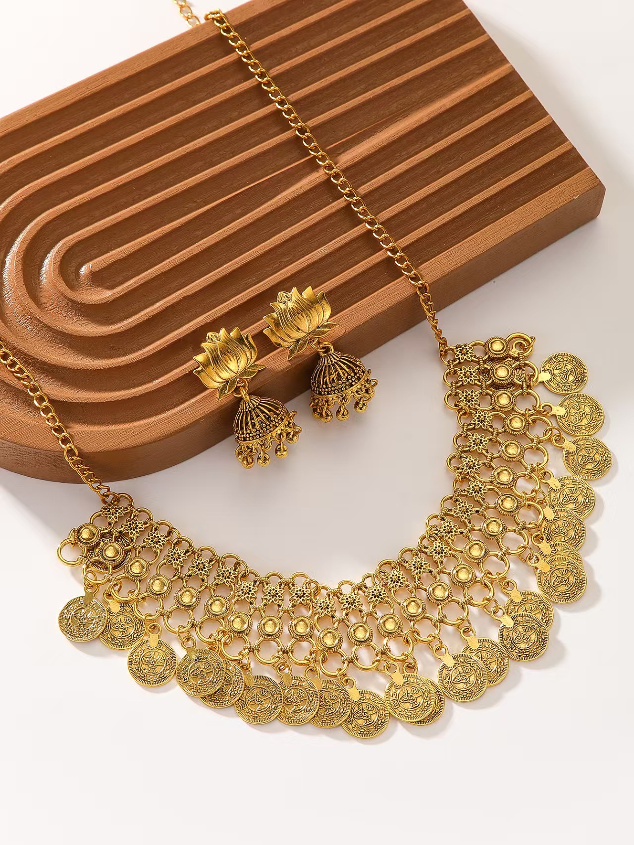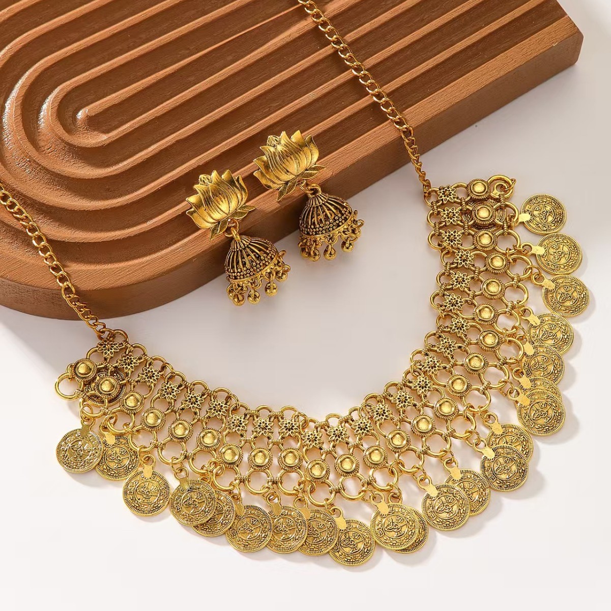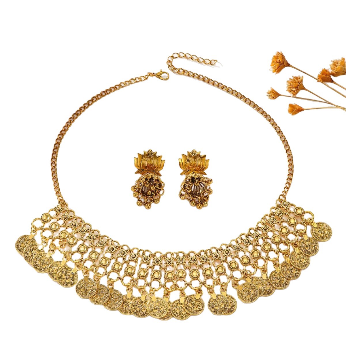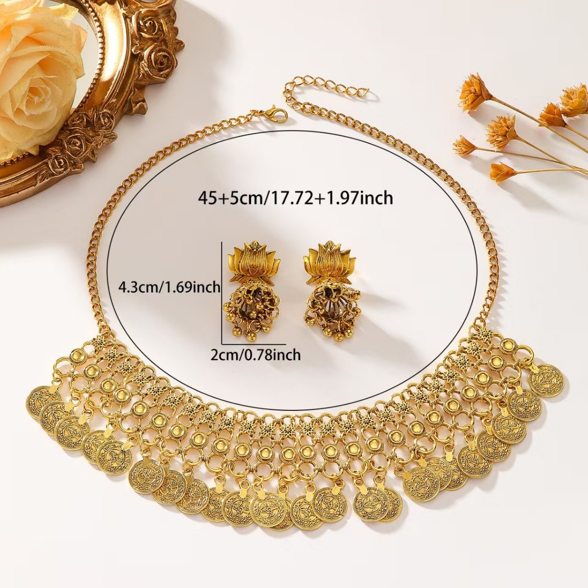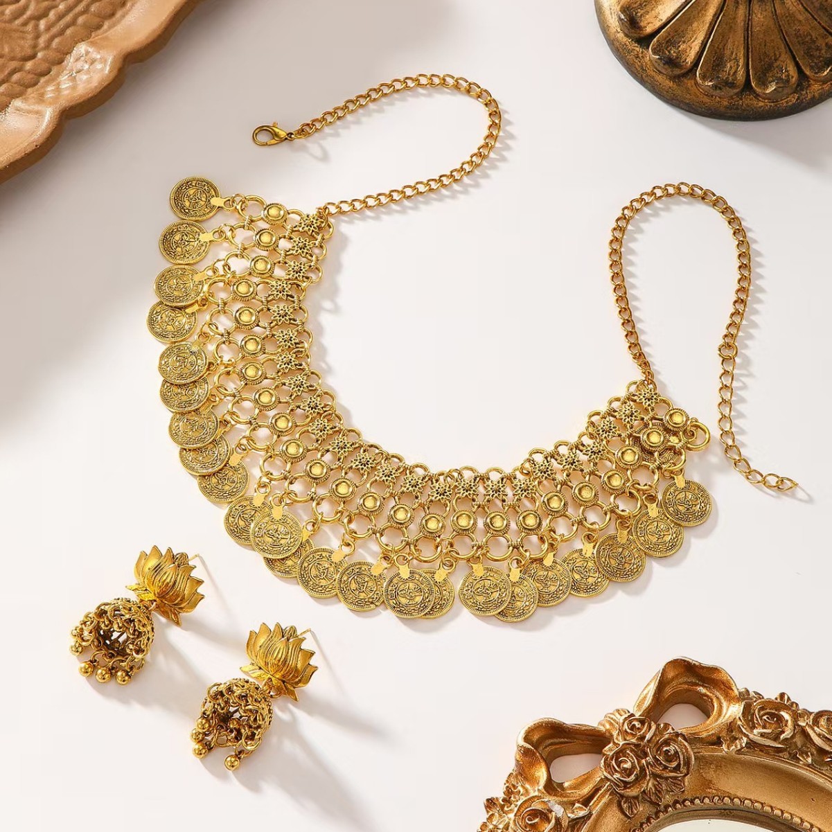 European and American Ethnic Style Fashion Coin Bohemian Style Exaggerated Elegant Niche Indian Style Necklace and Earrings Set