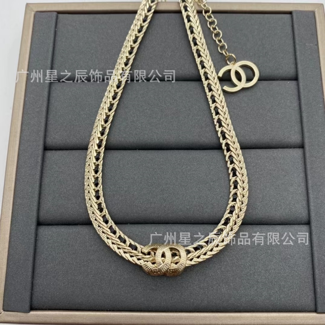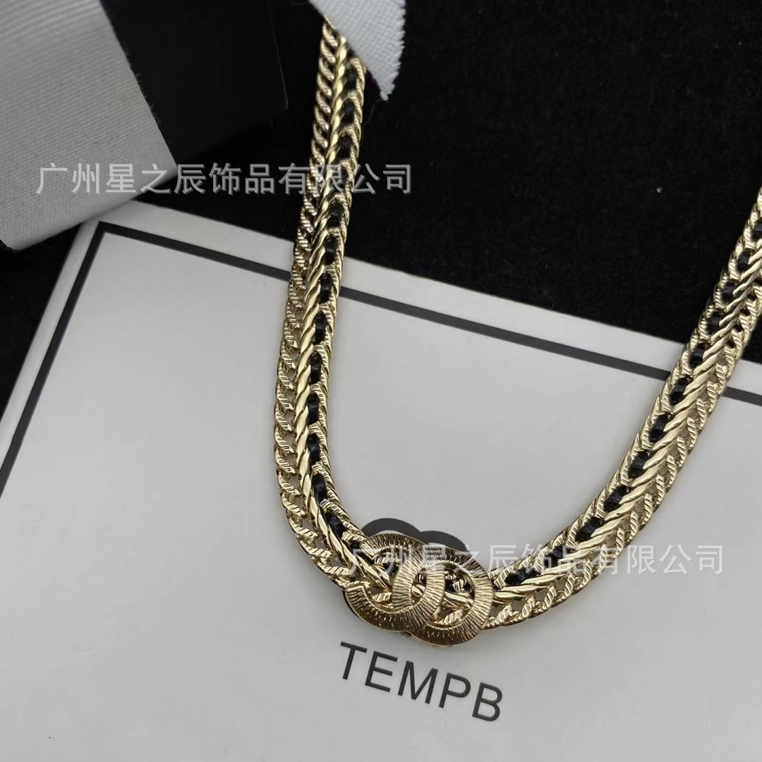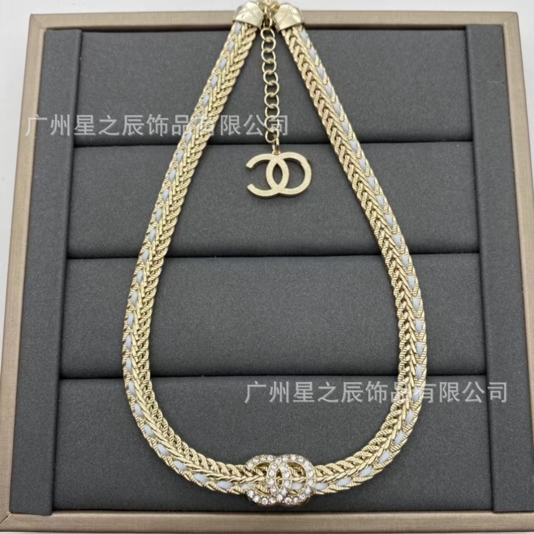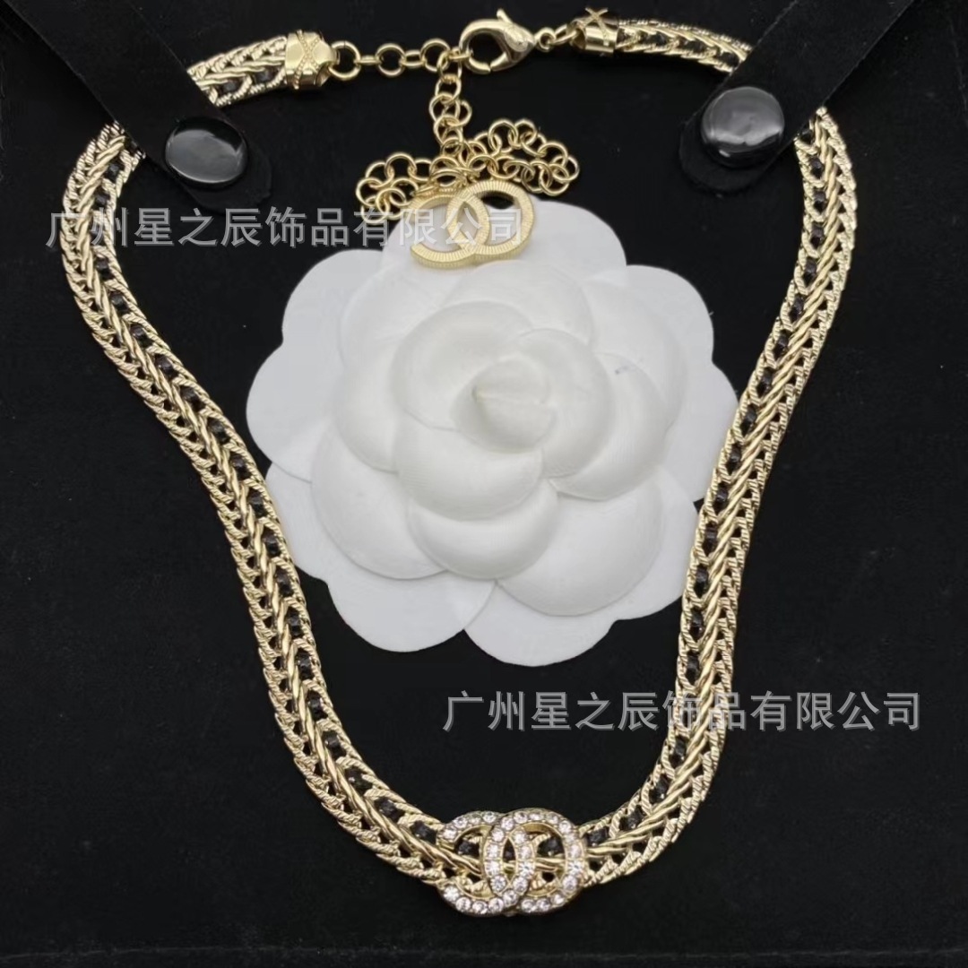 Real Shot of Xiangjia's Double C Black and White Leather Rope Snake Bone Chain with Label, Female Fragrance Grandma Full Diamond Necklace Female Factory Wholesale
