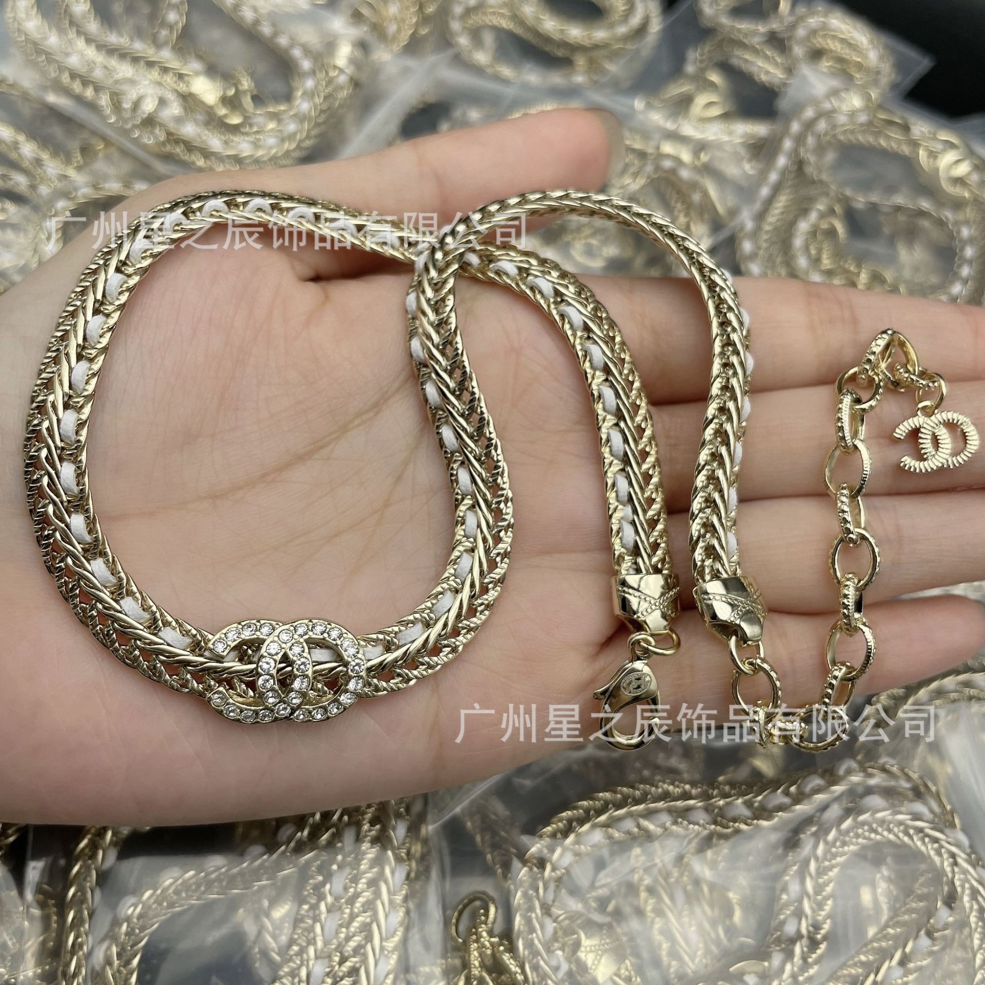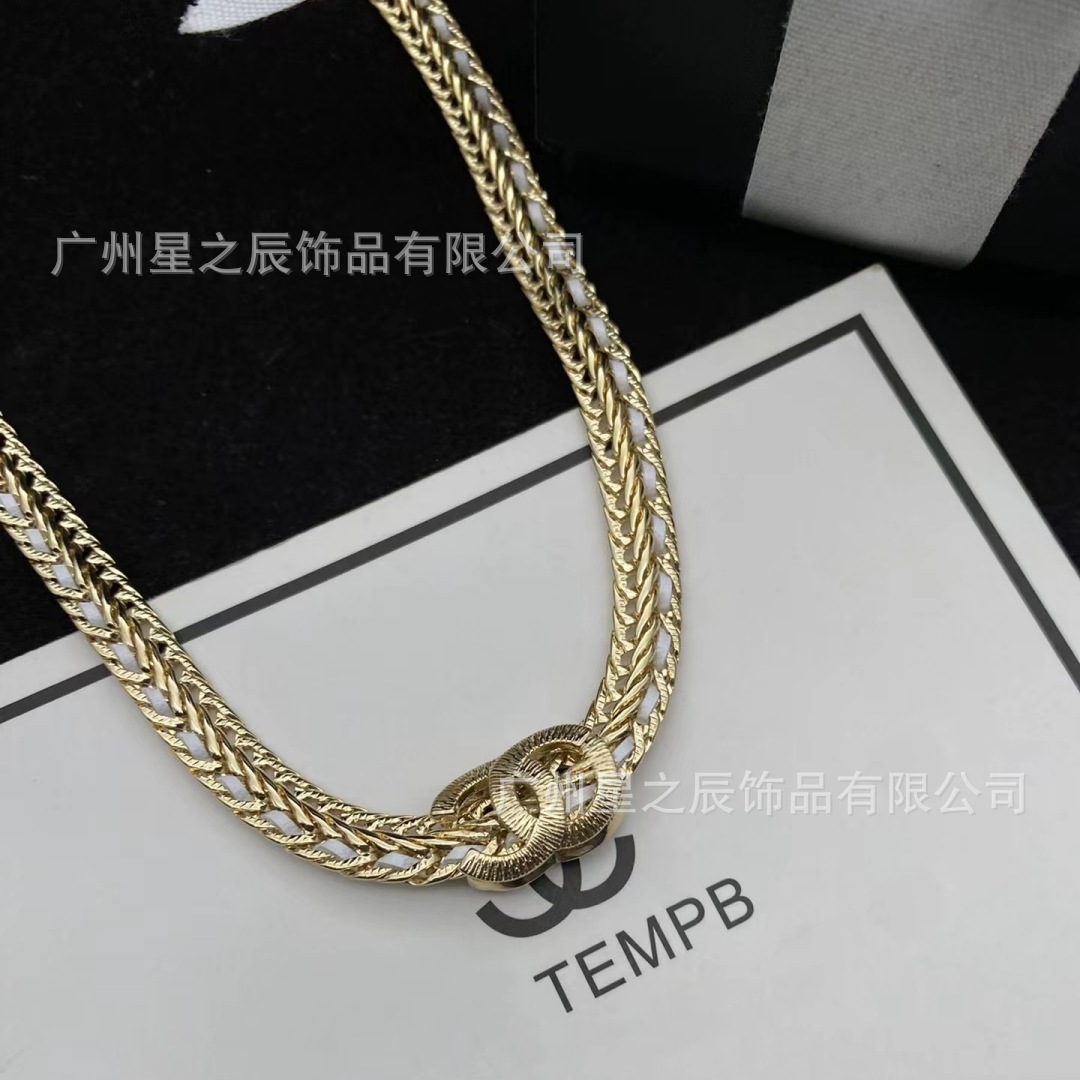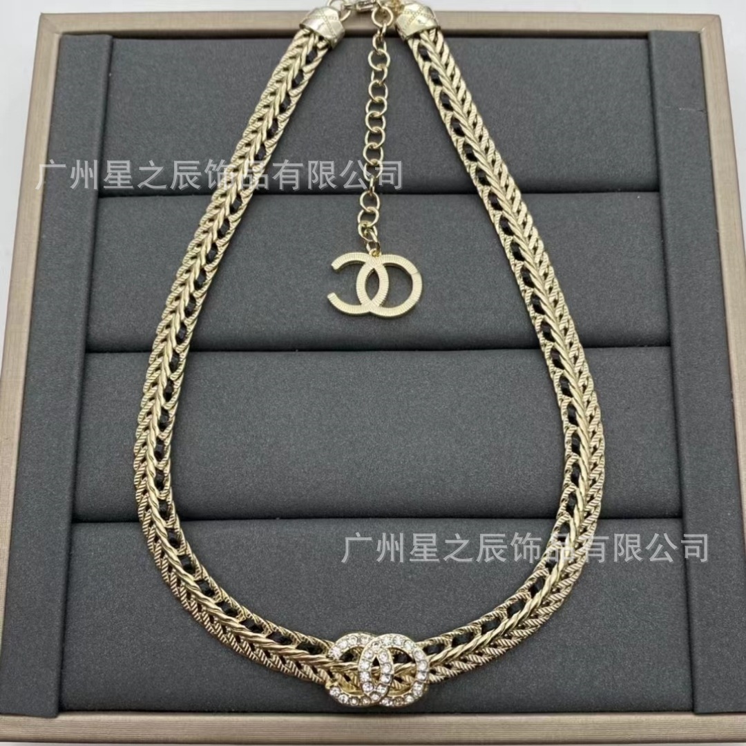Real Shot of Xiangjia's Double C Black and White Leather Rope Snake Bone Chain with Label, Female Fragrance Grandma Full Diamond Necklace Female Factory Wholesale
