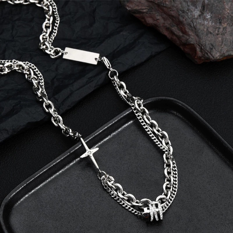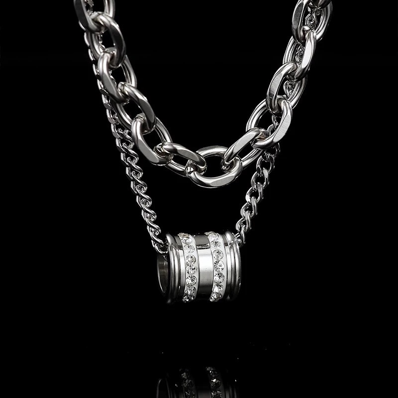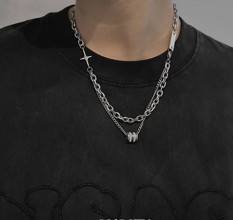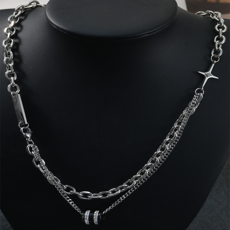 New Double-Layer Stacked Diamond-Encrusted Transfer Beads Titanium Steel Necklace Men's Hip-Hop Trendy Cool High-End Clavicle Chain Versatile Accessories
