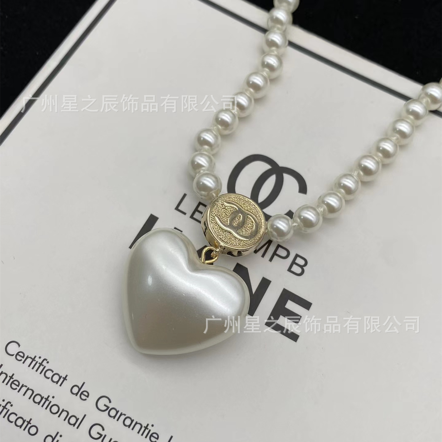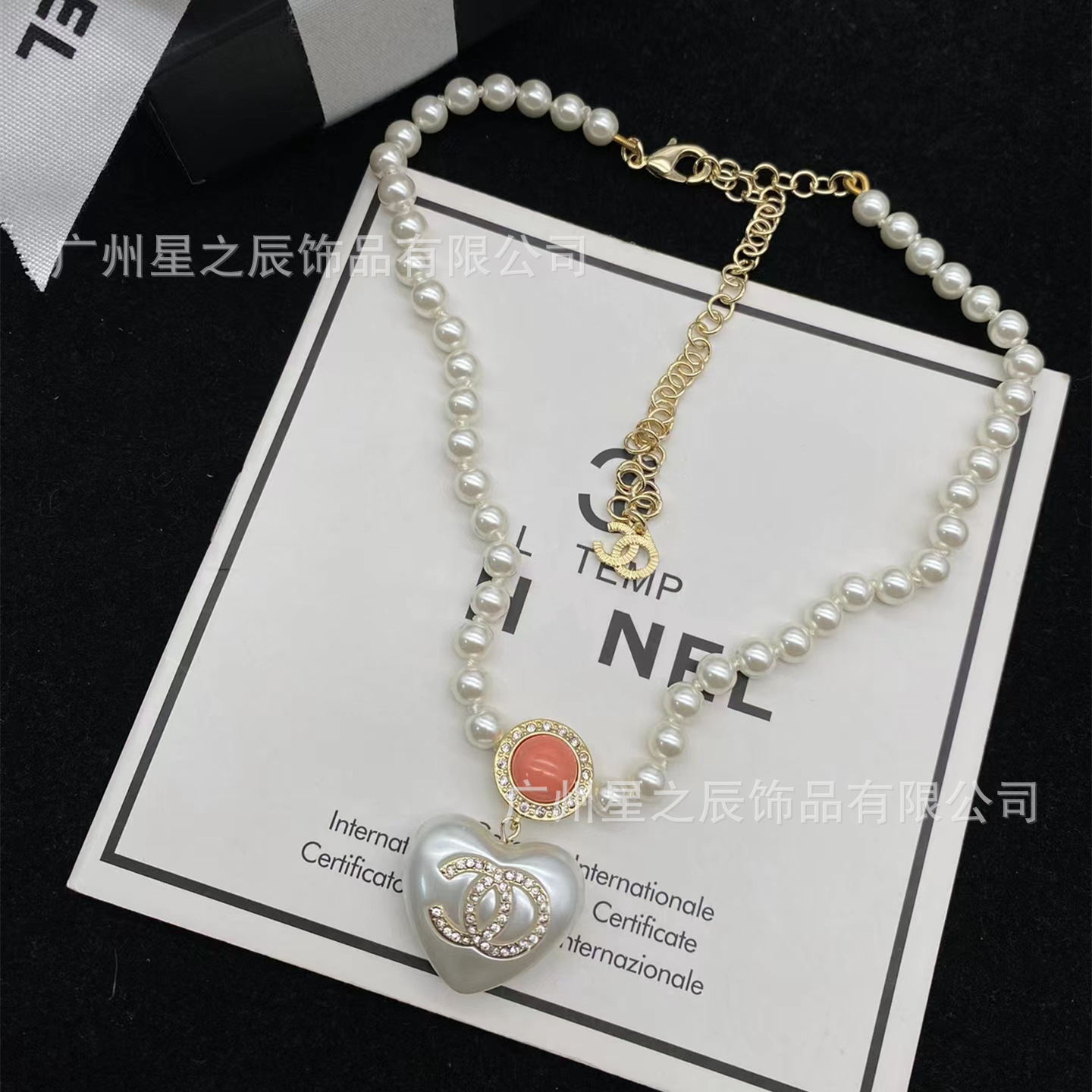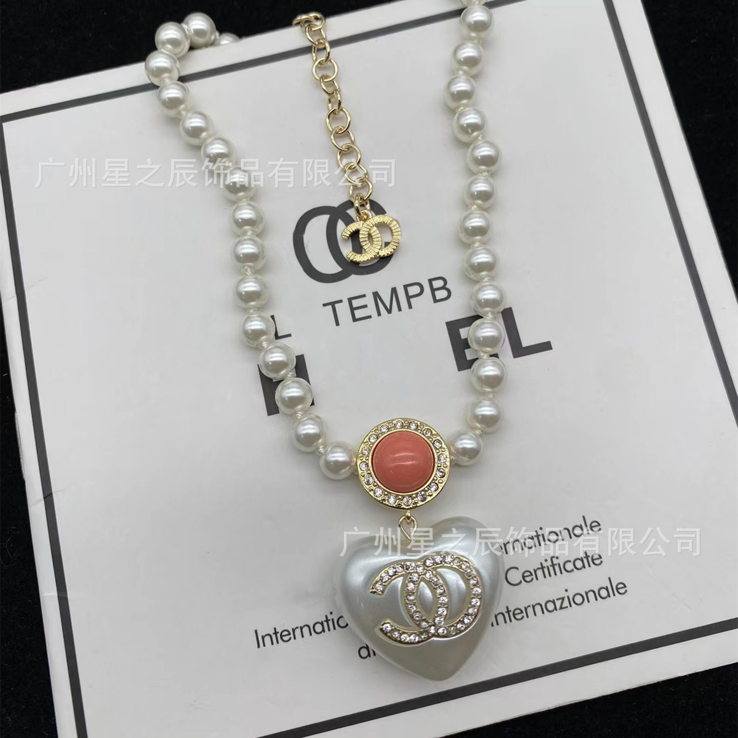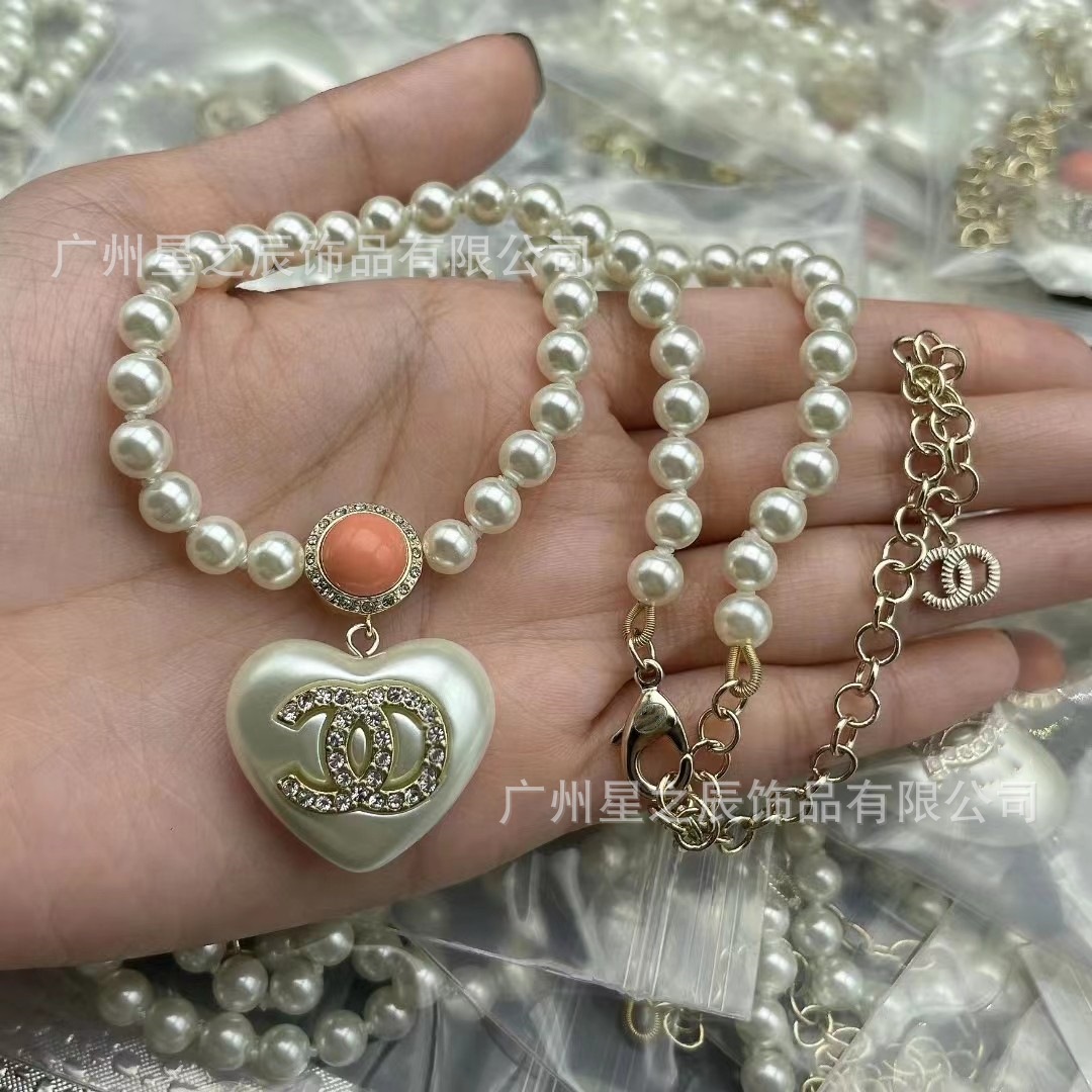 Real Shot of Xiangjia's Double C Pearl White Peach Heart Necklace with Label, Women's Pink Beads and Diamond Heart Clavicle Chain for Women Wholesale