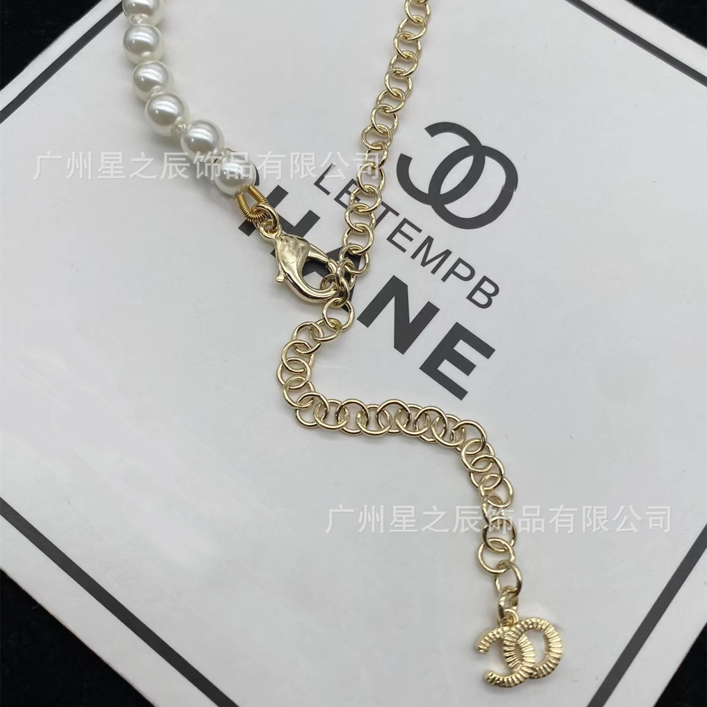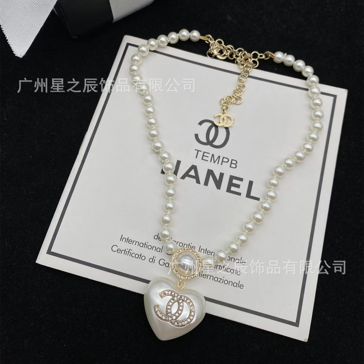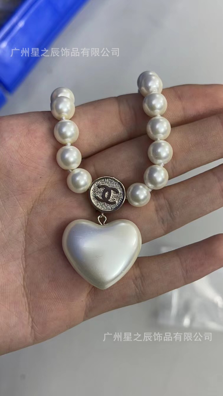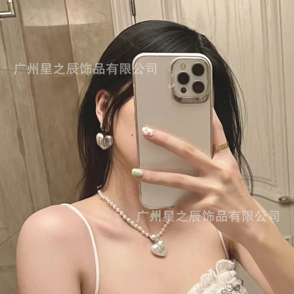 Real Shot of Xiangjia's Double C Pearl White Peach Heart Necklace with Label, Women's Pink Beads and Diamond Heart Clavicle Chain for Women Wholesale