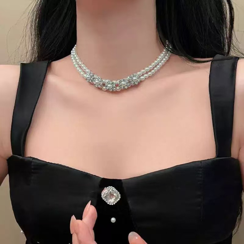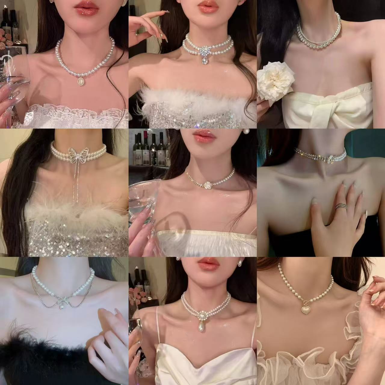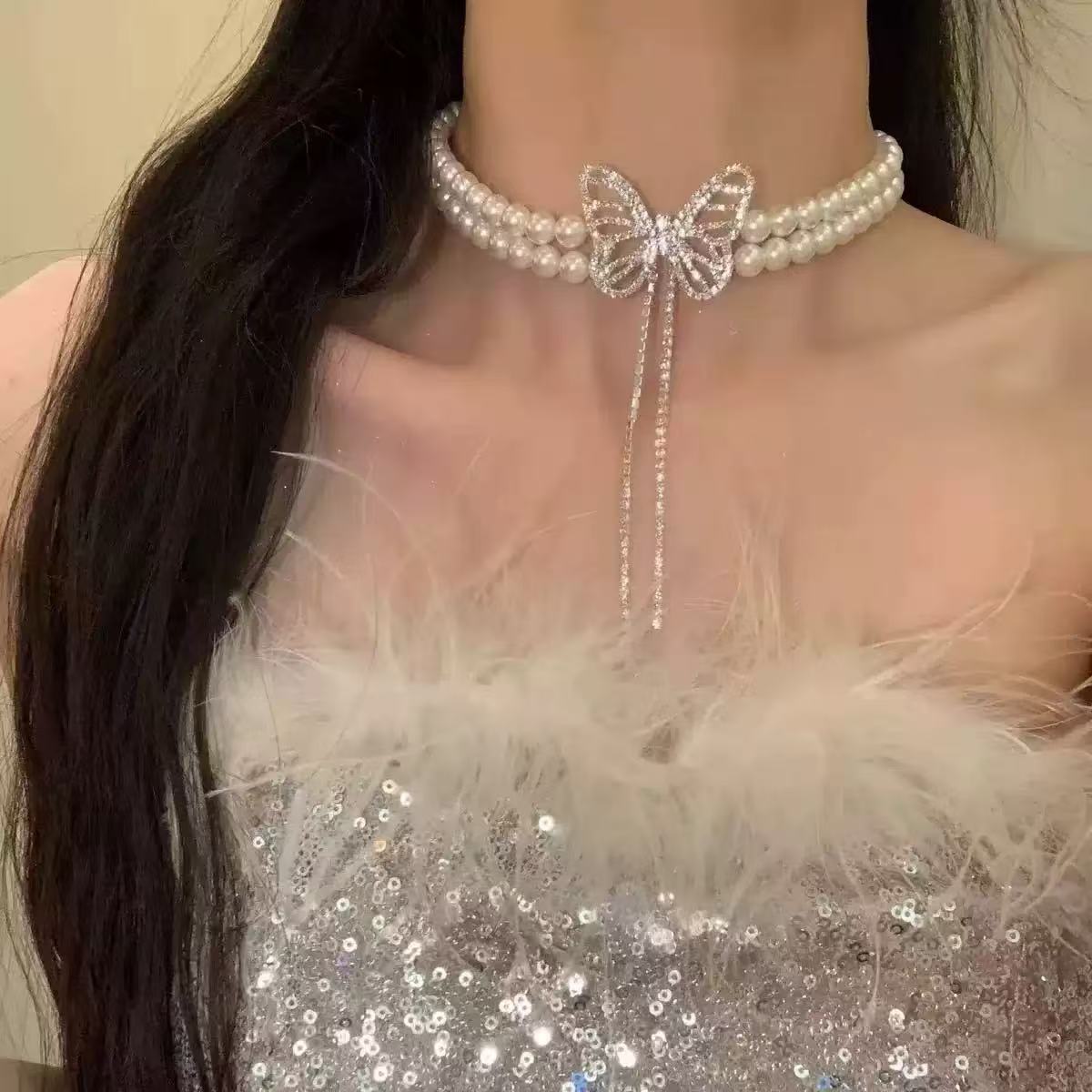 Sparkling Diamond Butterfly Pearl Necklace for Women, Niche Retro Sweet Cool Hot Girl Light Luxury Collarbone Chain New Accessories Wholesale