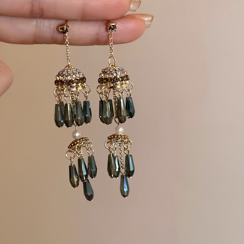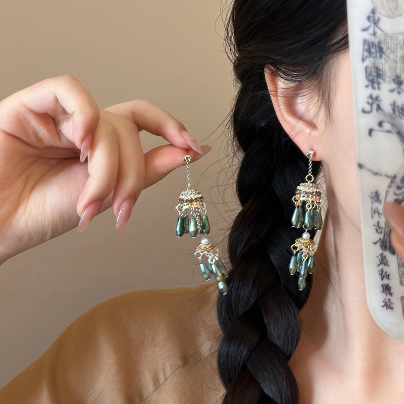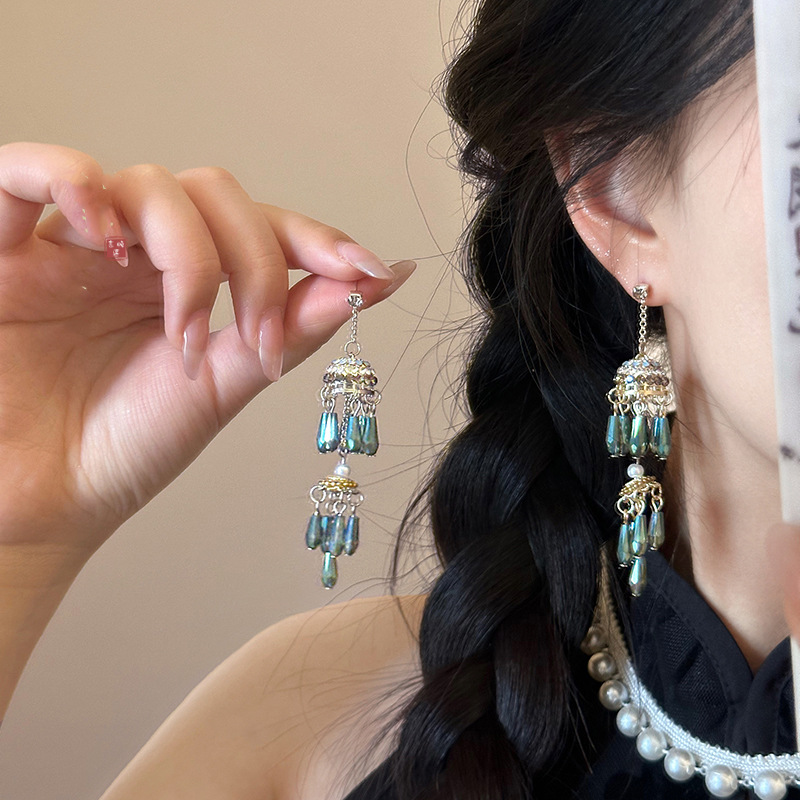 925 Silver Needle Vintage Ethnic Style Tassel Blue Wind Bell Earrings Women's New Chinese Niche Design High-grade Earrings