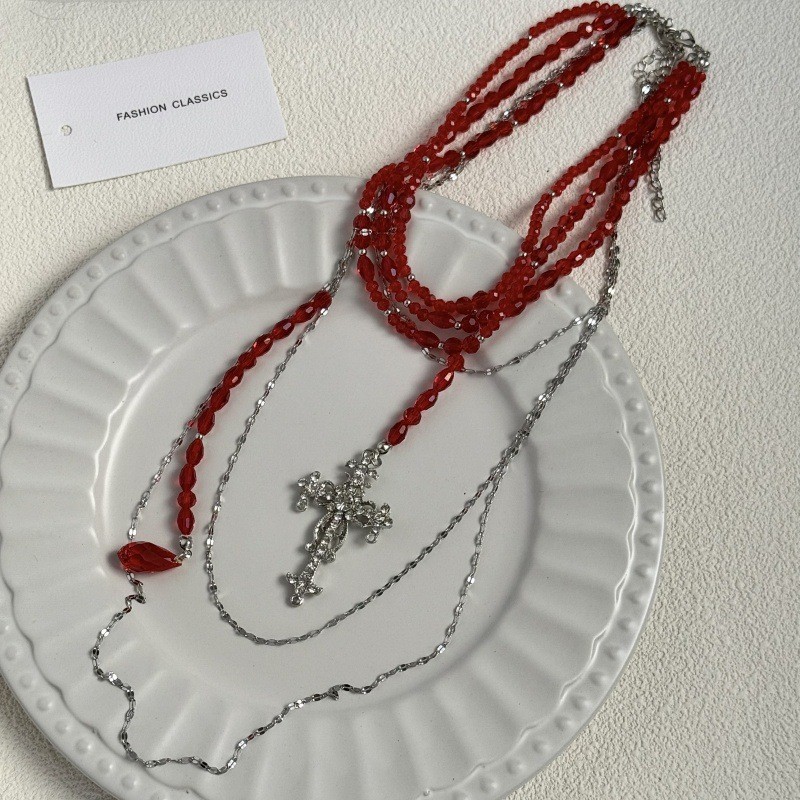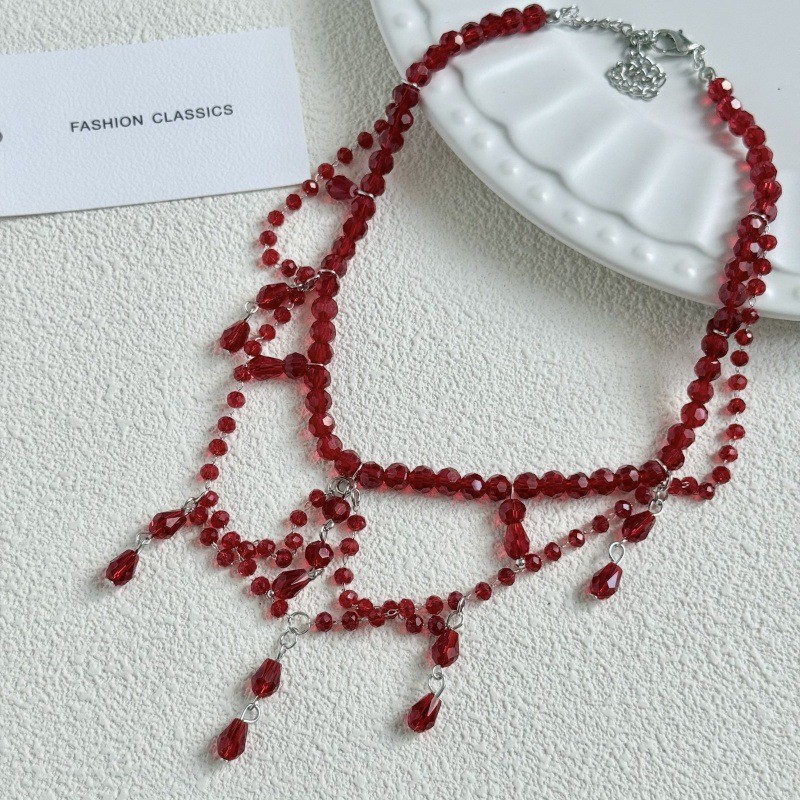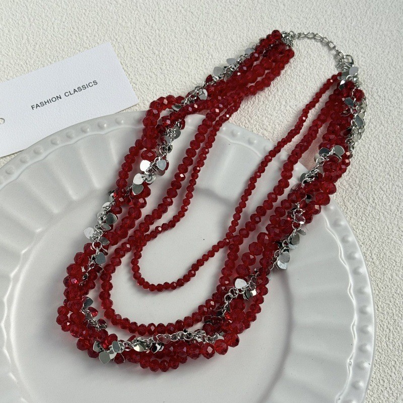 Fashion European and American Style Niche Red Crystal Layered Necklace for Women New Trendy Elegant Light Luxury High-End Clavicle Chain