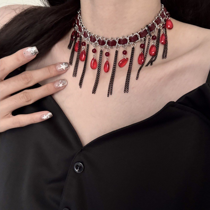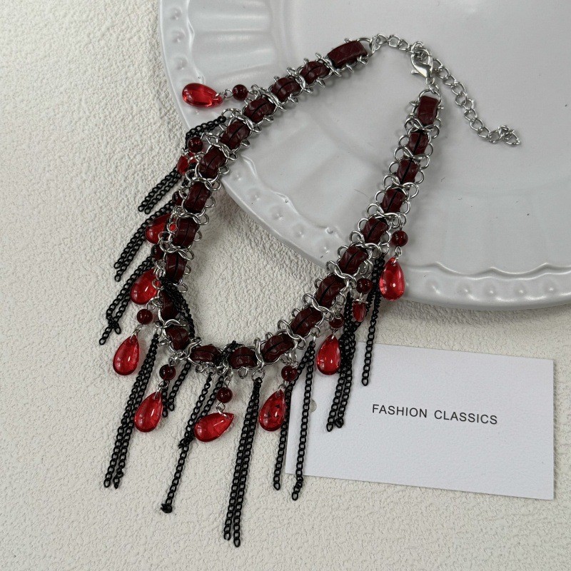 Color: Red water drop tassel necklace (w3953)