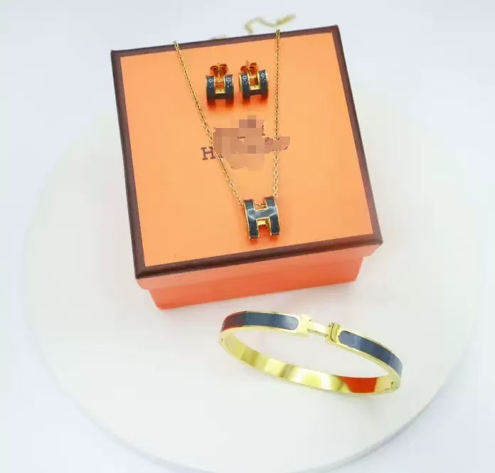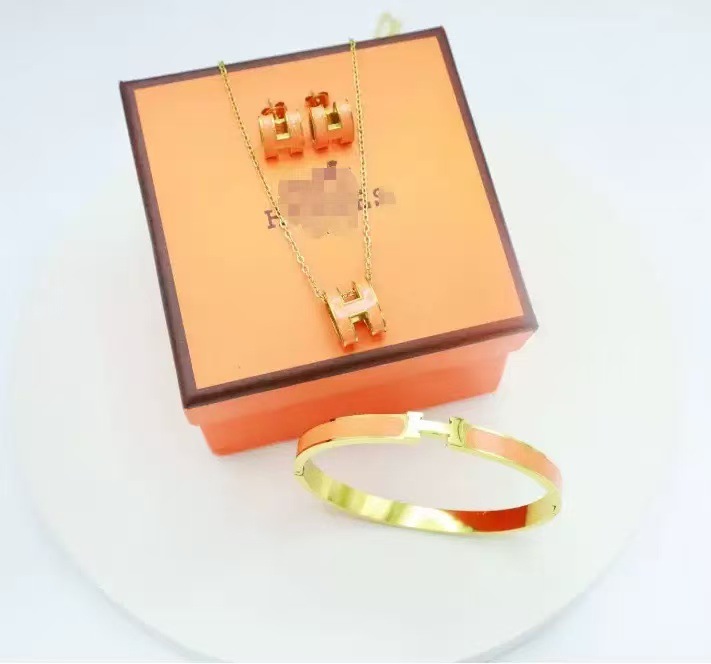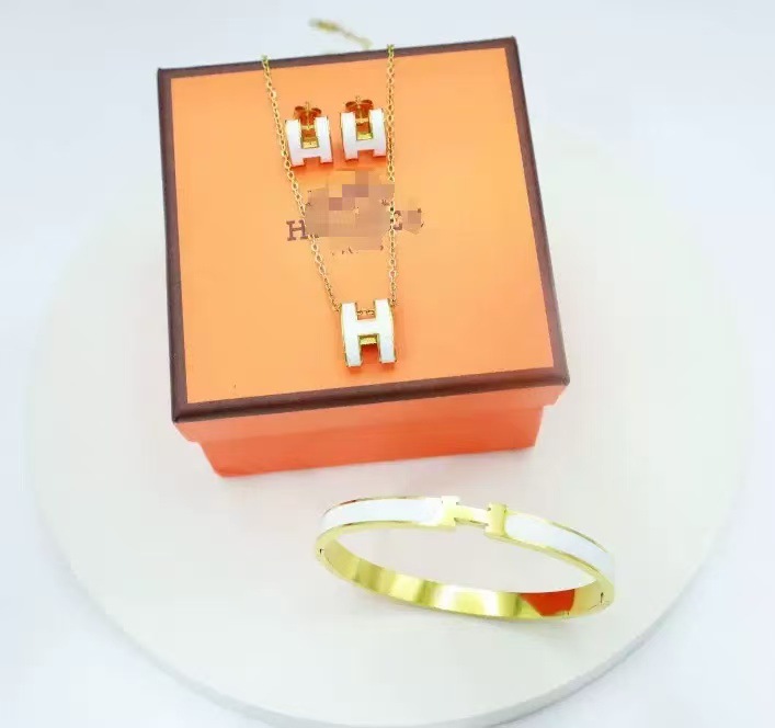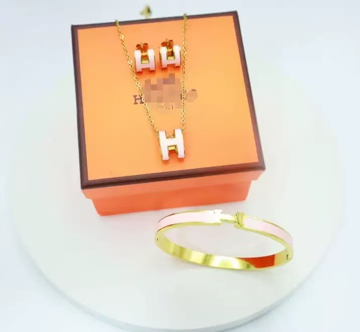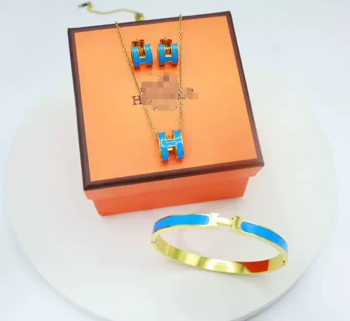 H Letter Necklace Titanium Steel European and American Enamel Pendant Stainless Steel Bracelet Earrings Necklace Set Clavicle Chain Popular