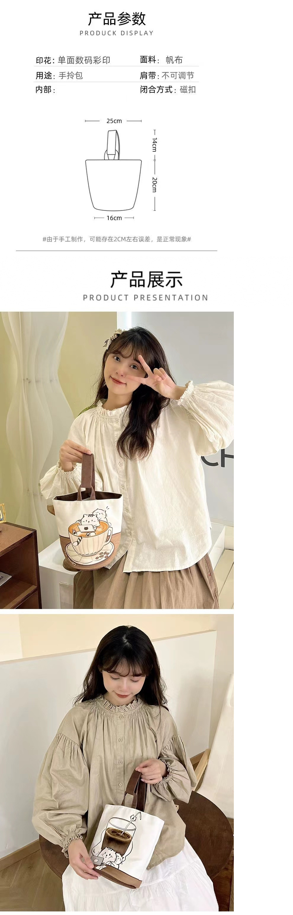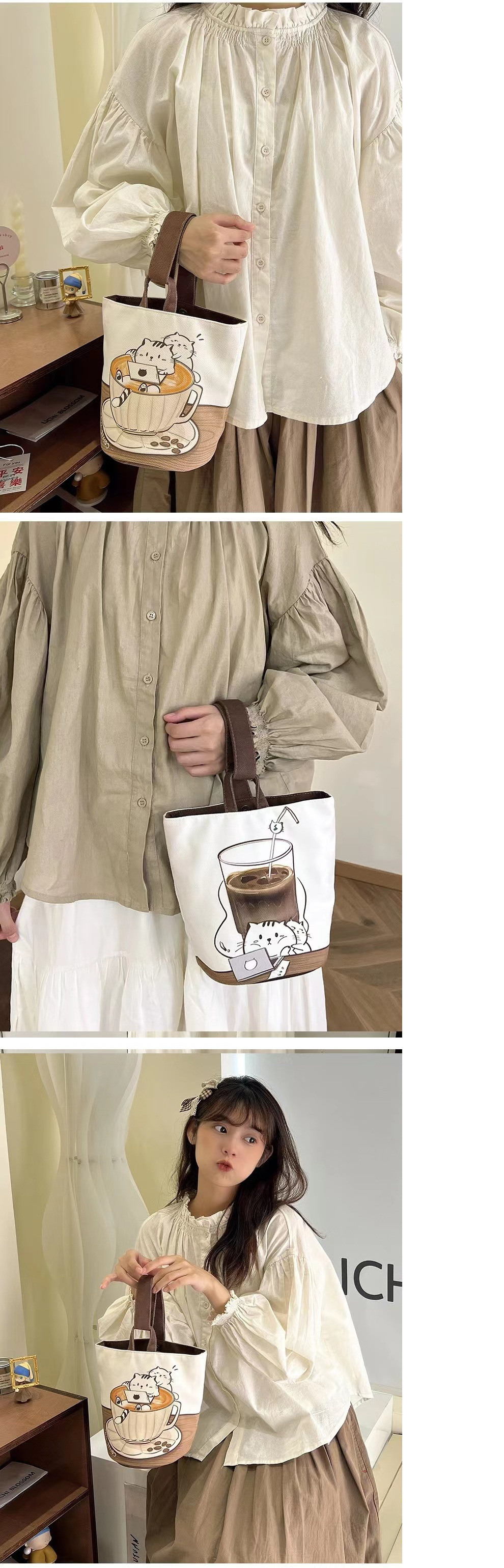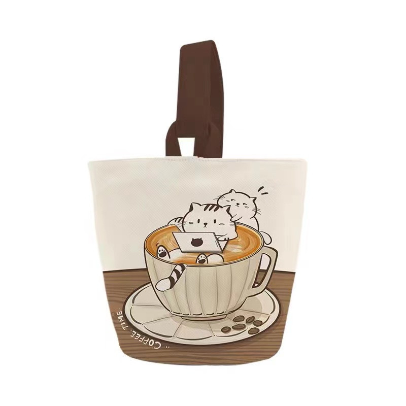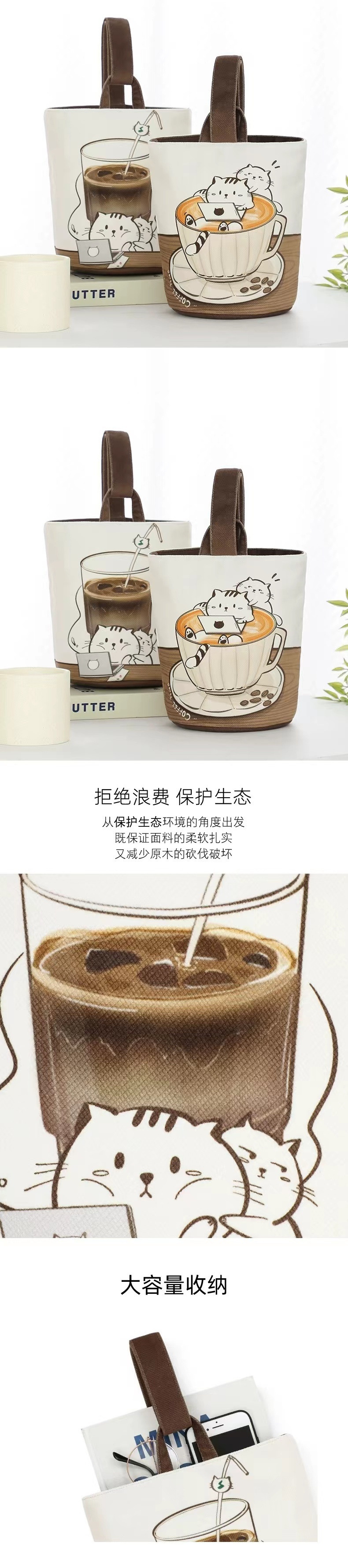 Cute Coffee Cat Portable Mommy Canvas Bag Shopping Student Cute Bucket Type Hand Lunch Box Handbag for Women