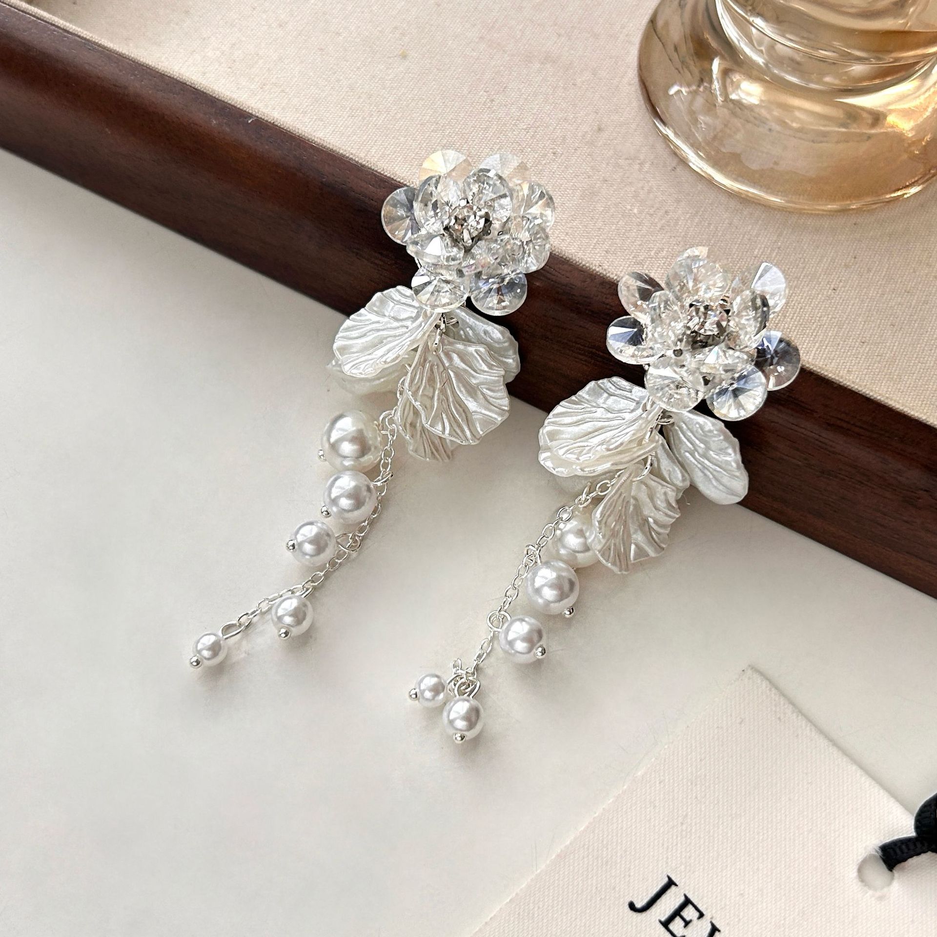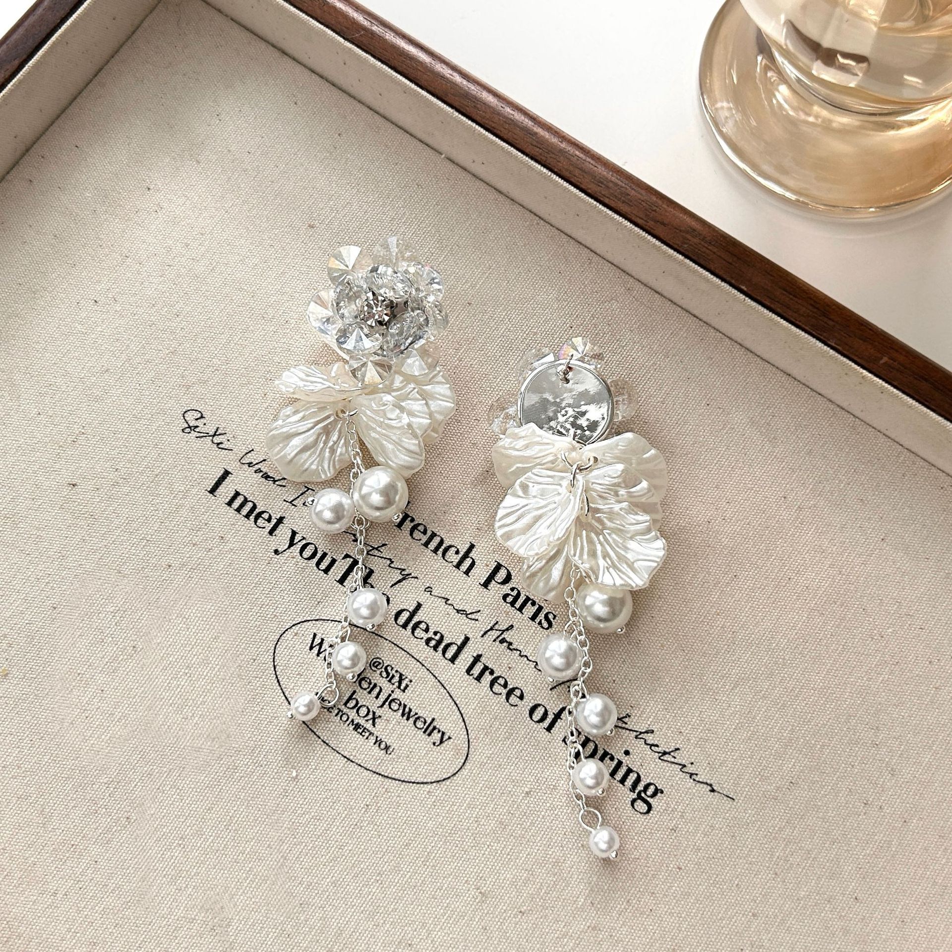 French Retro Tassel Earrings White Super Fairy Petal Pearl Pendant Exquisite Accessible Luxury Banquet Versatile Earrings for Women