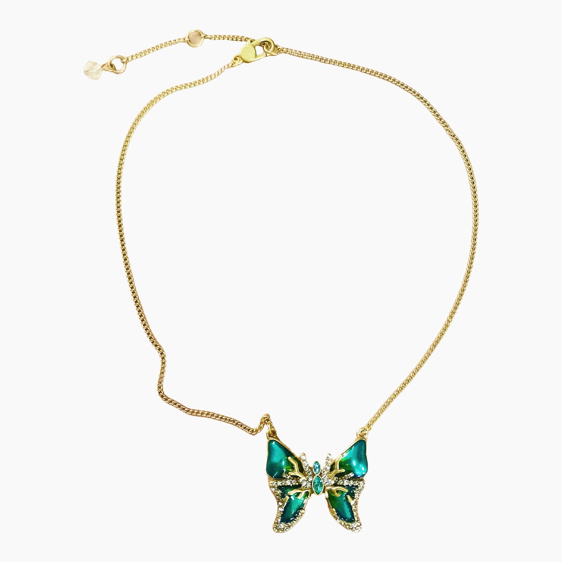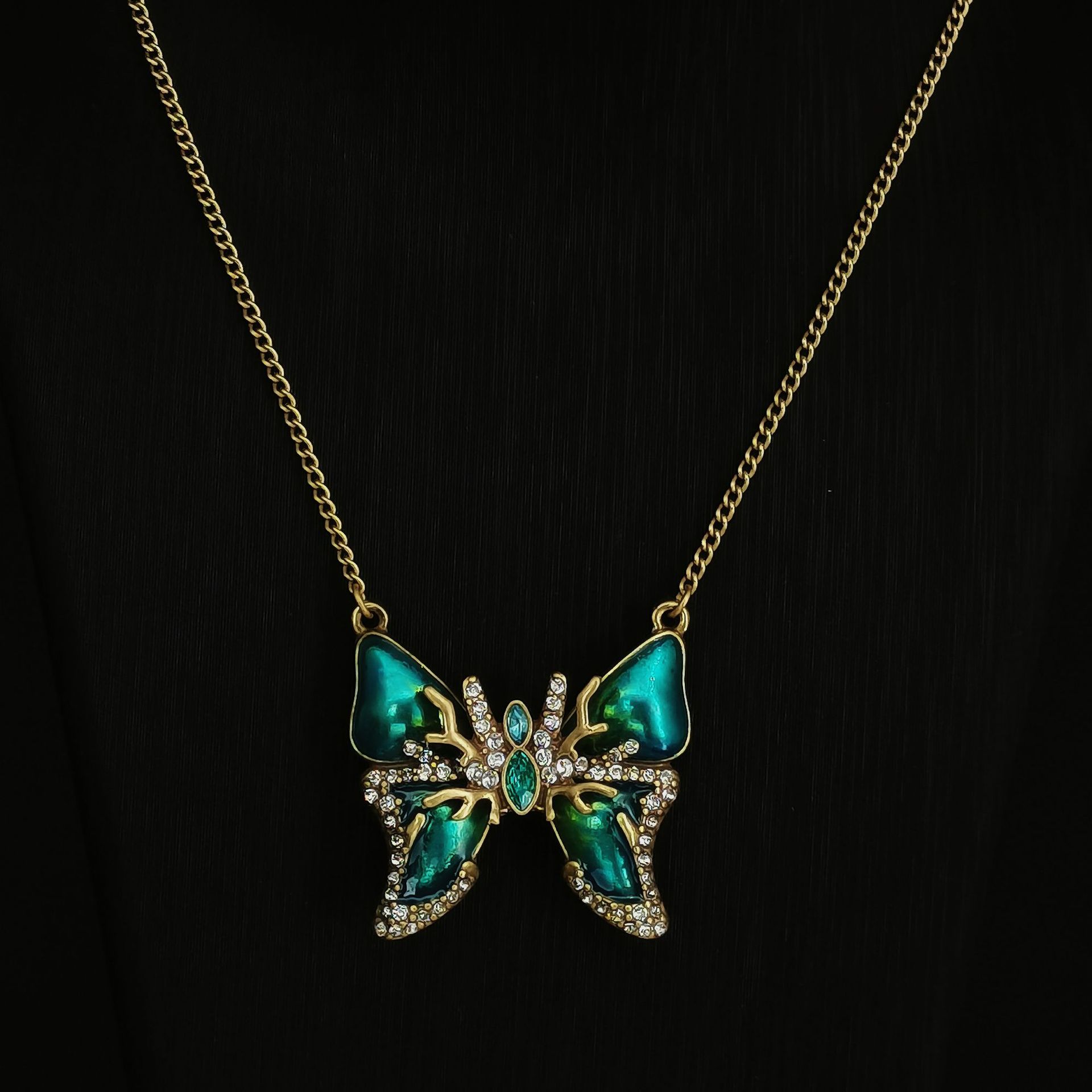 Medieval Style Vintage Inlaid Zirconium Green Gradient Enamel Butterfly Ear Hook Necklace Fashion Women's Jewelry Set