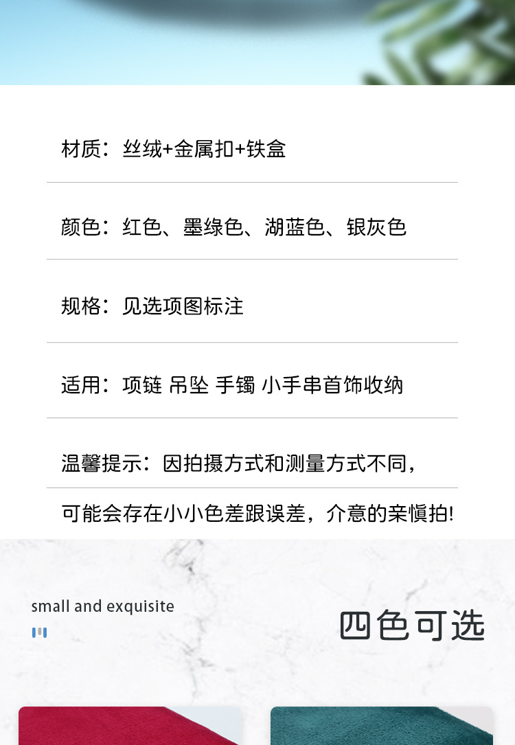 Specifications and models: Dark green velvet-small pendant box; 6.5*6.5*3.5cm