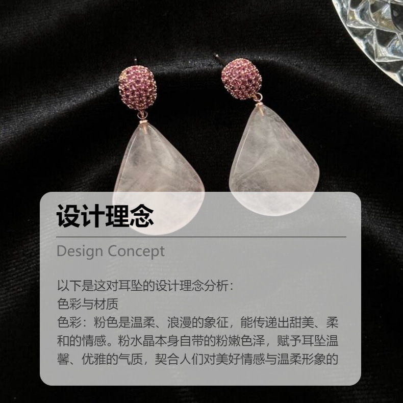 European and American Fashion Big-Name Drop-Shaped Natural Rose Quartz Earrings, Simple and Niche Design Pink Inlaid Earrings