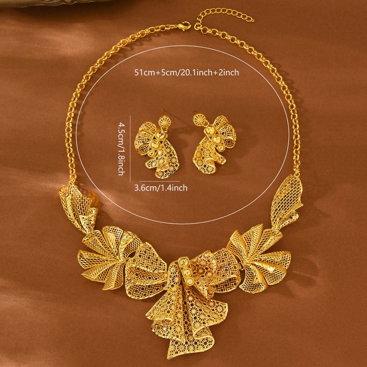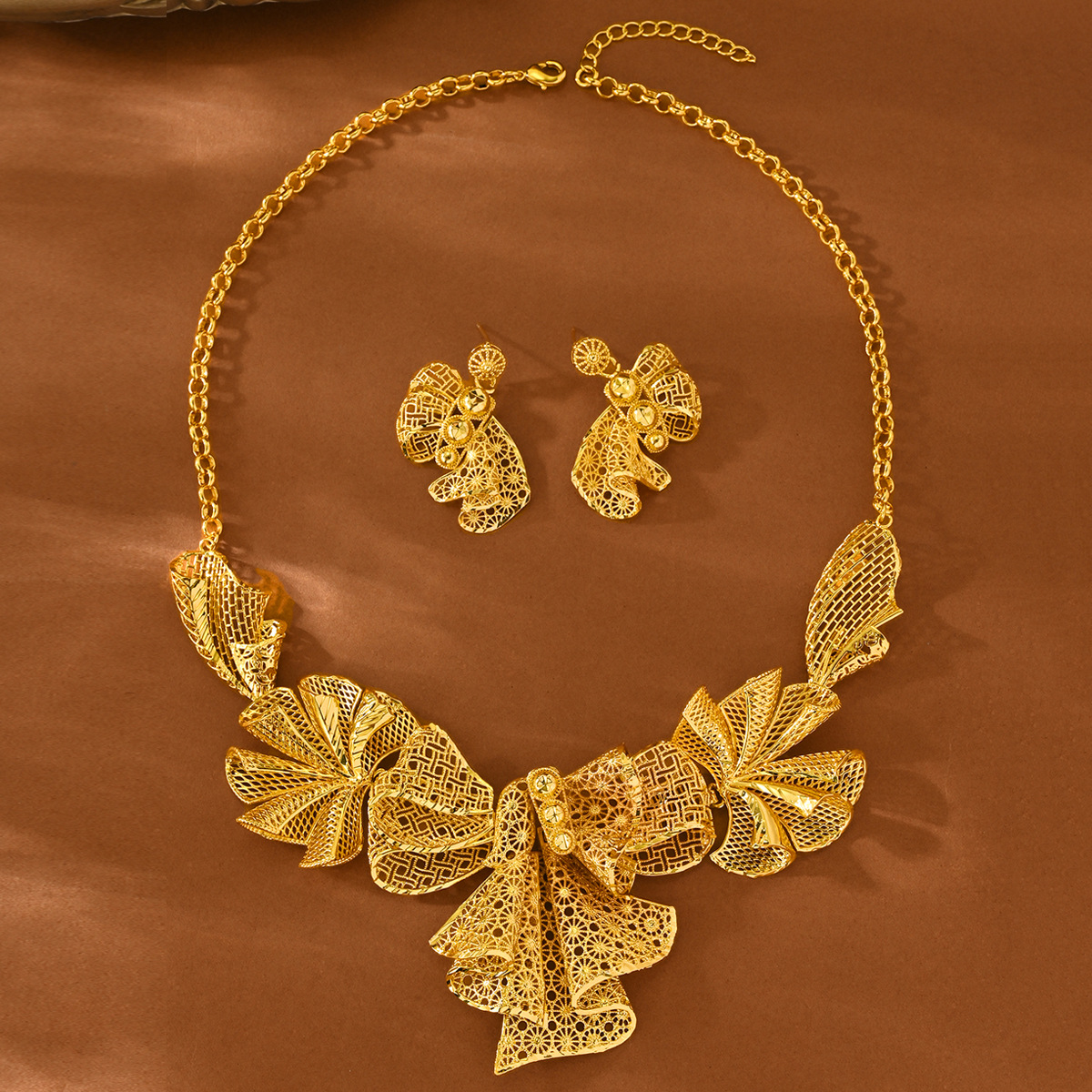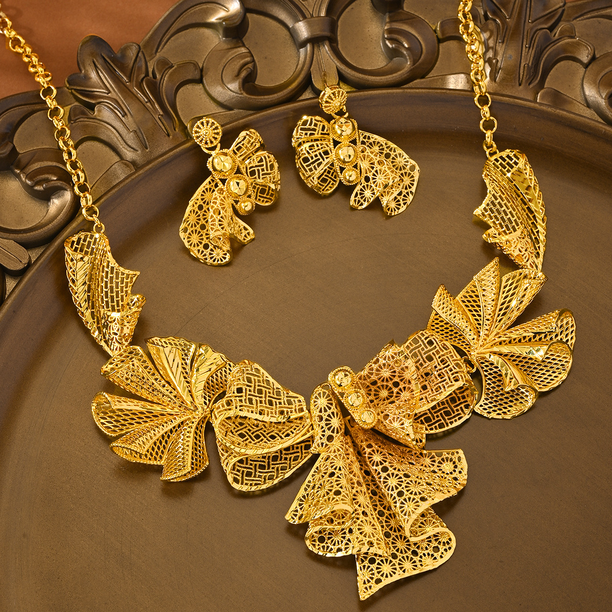 Cross-Border Hot-Selling 2-Piece Set of Indian Dubai Sand Gold Jewelry Necklace Bracelet Ring Earrings Bridal Wedding Jewelry