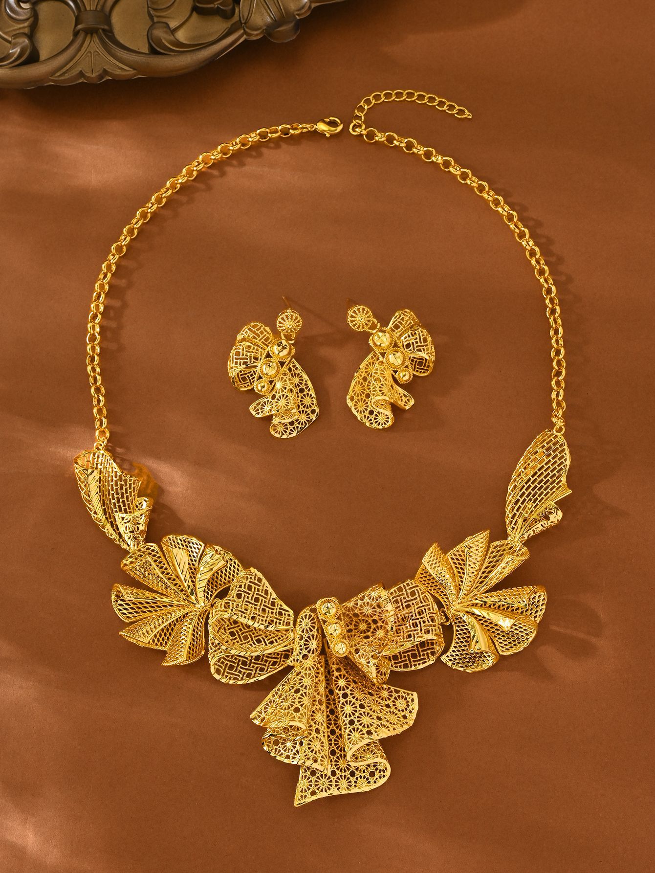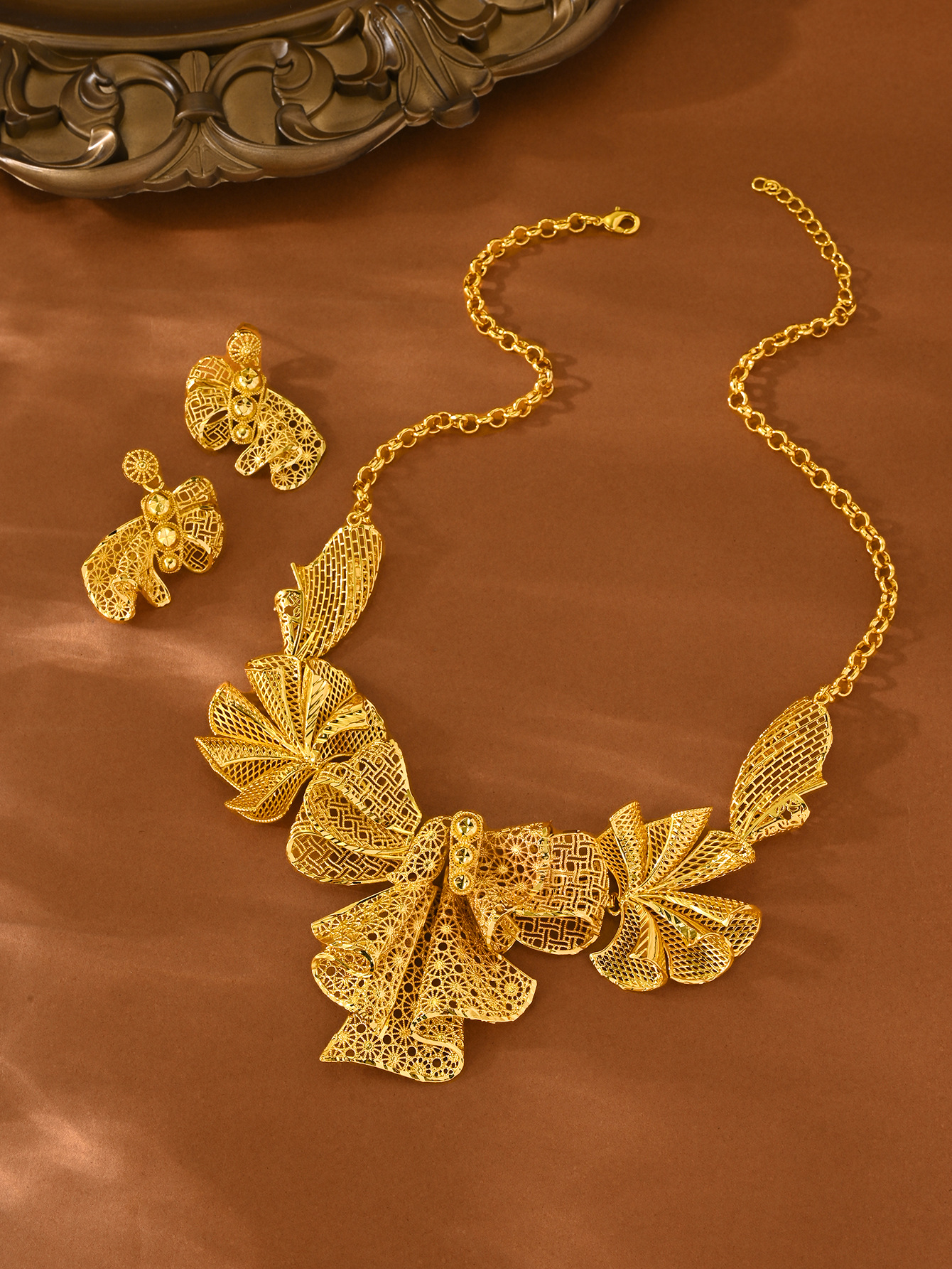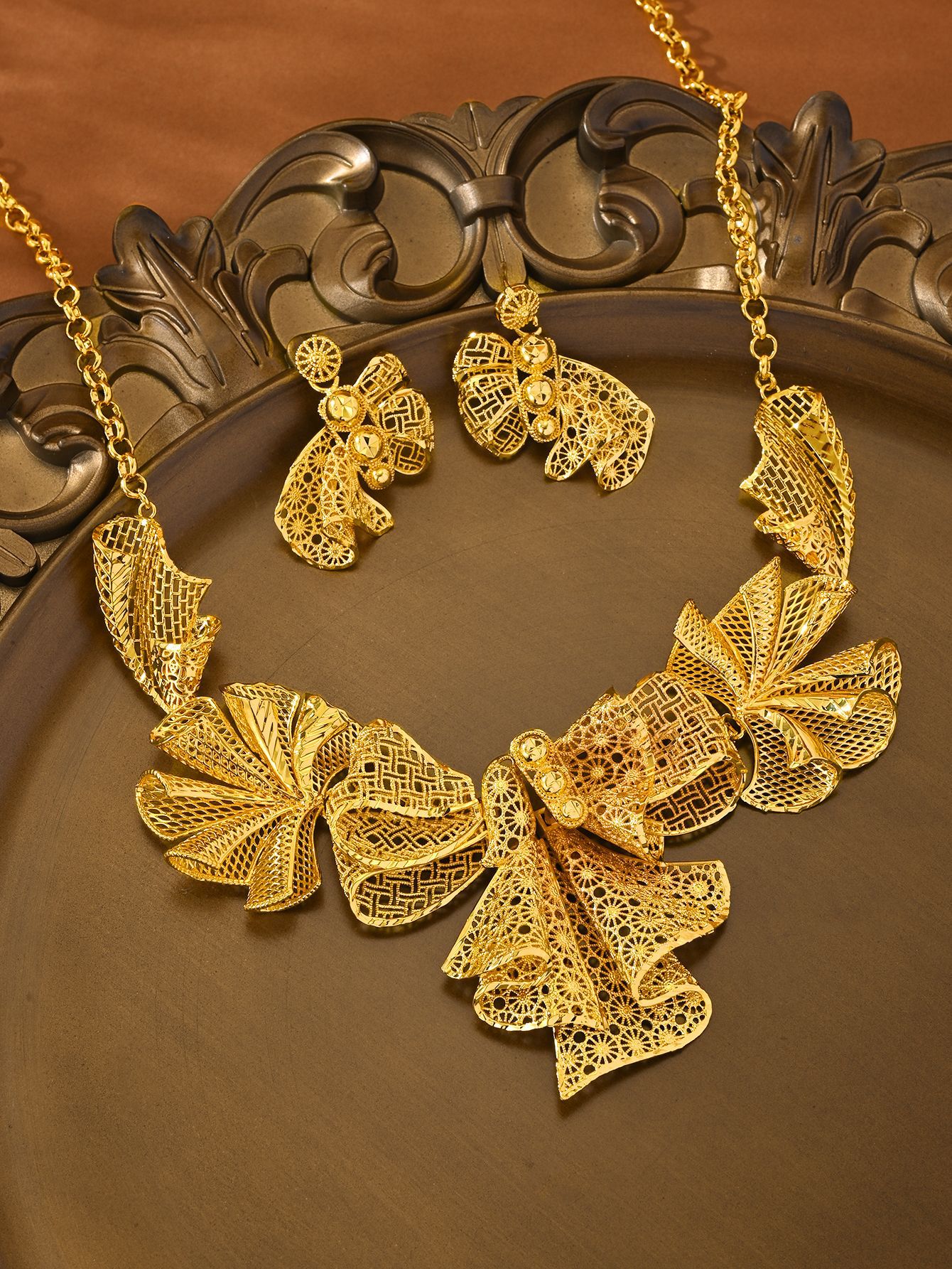 Cross-Border Hot-Selling 2-Piece Set of Indian Dubai Sand Gold Jewelry Necklace Bracelet Ring Earrings Bridal Wedding Jewelry