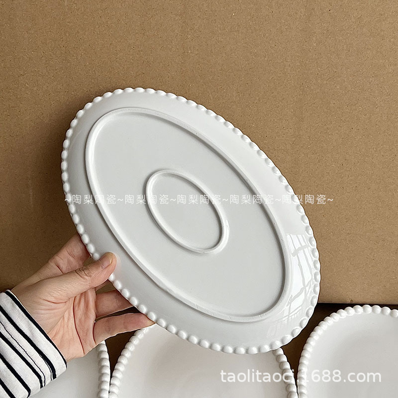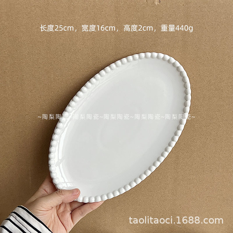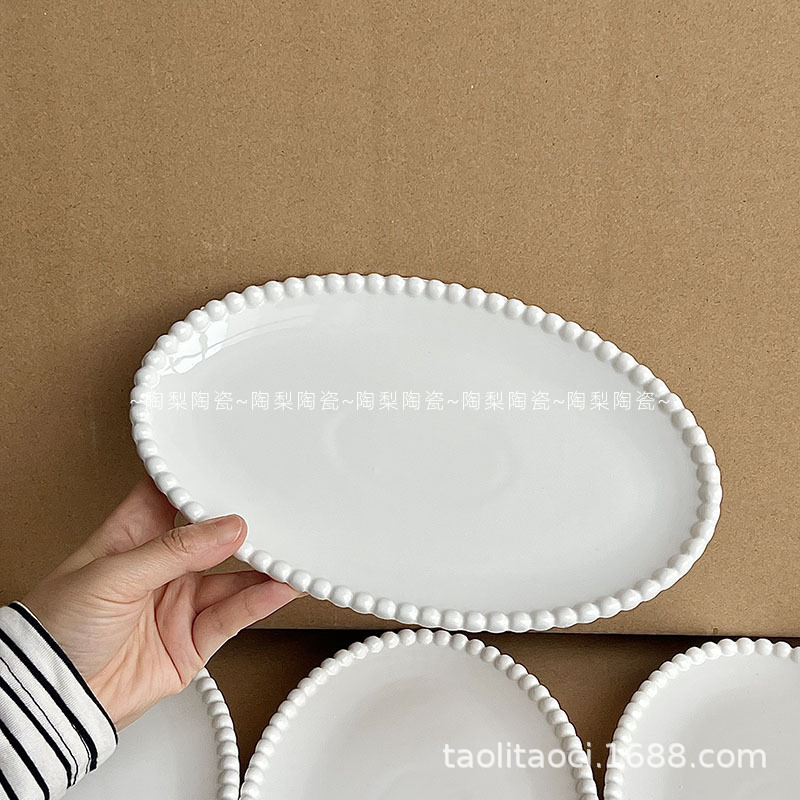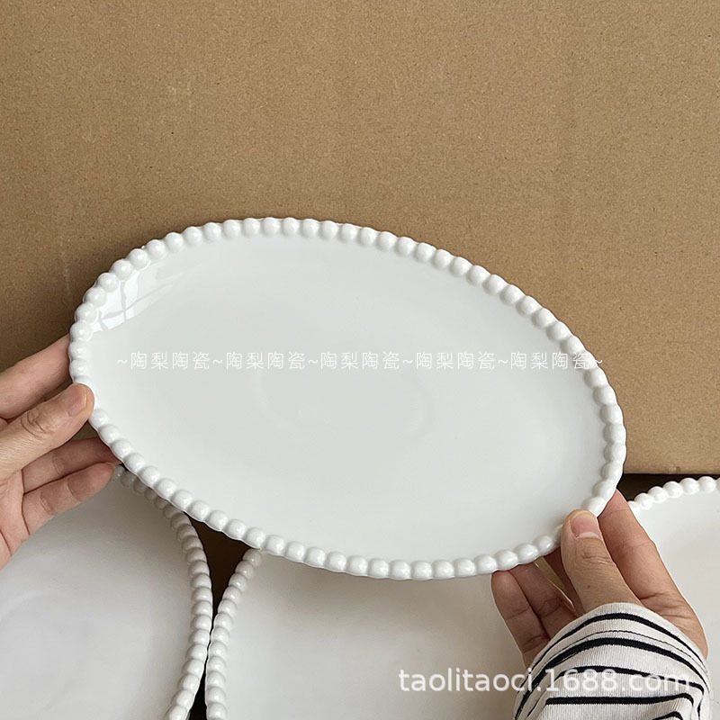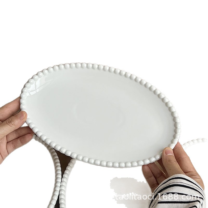 French Pearl Edge Oval Ceramic Plate Ins Korean Pure White Dessert Plate Western Food Plate Breakfast Plate Storage Plate
