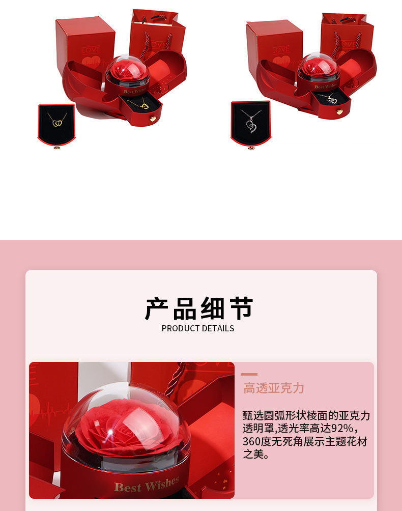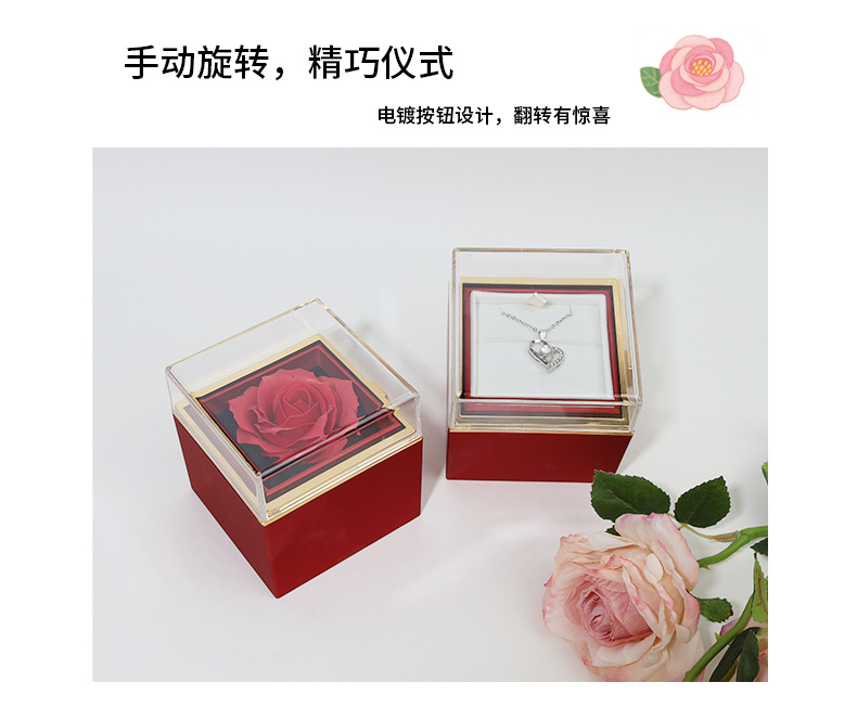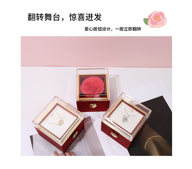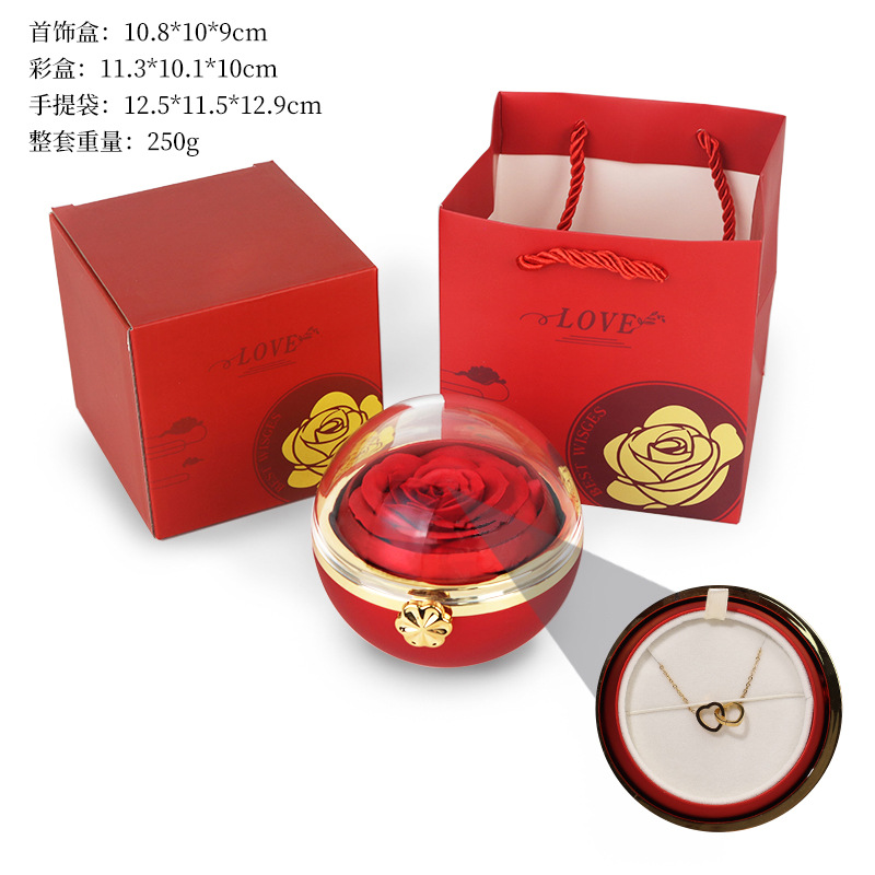 Specifications and models: Round rotate+double heart necklace; soap flower jewelry box+color box+satchel bag