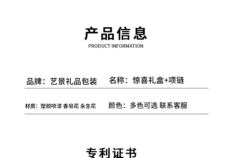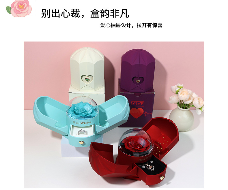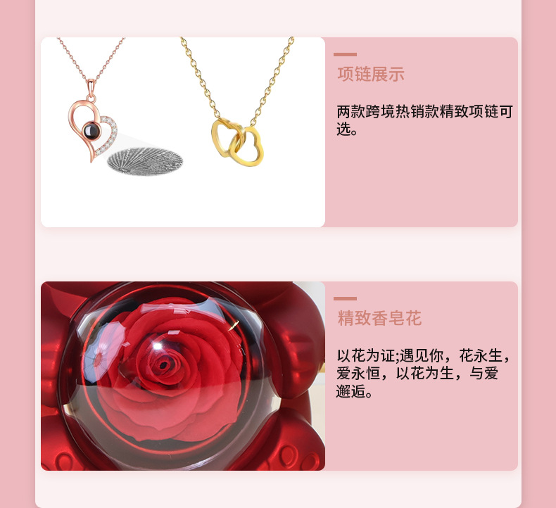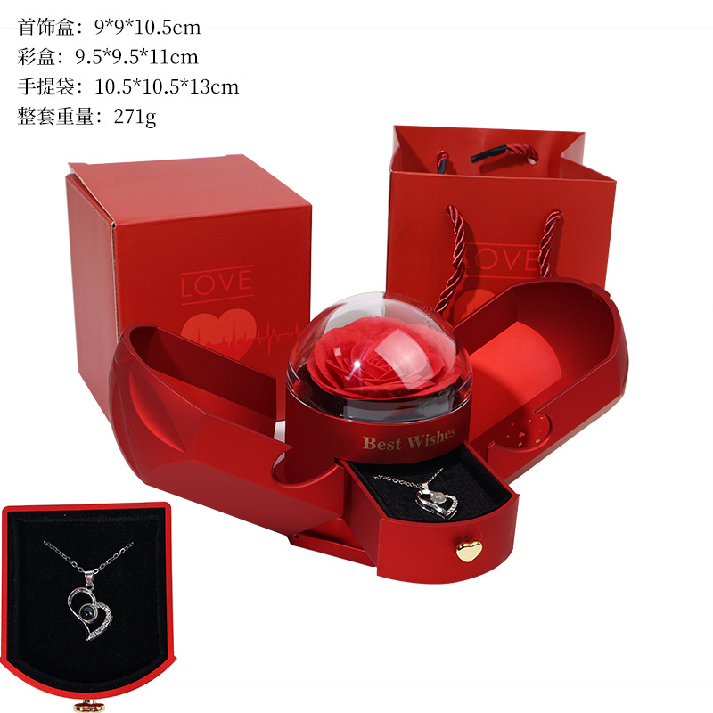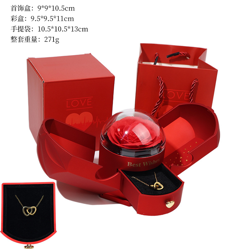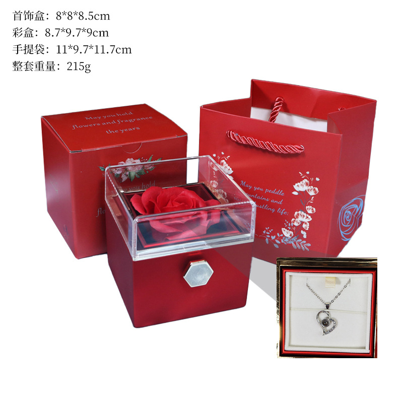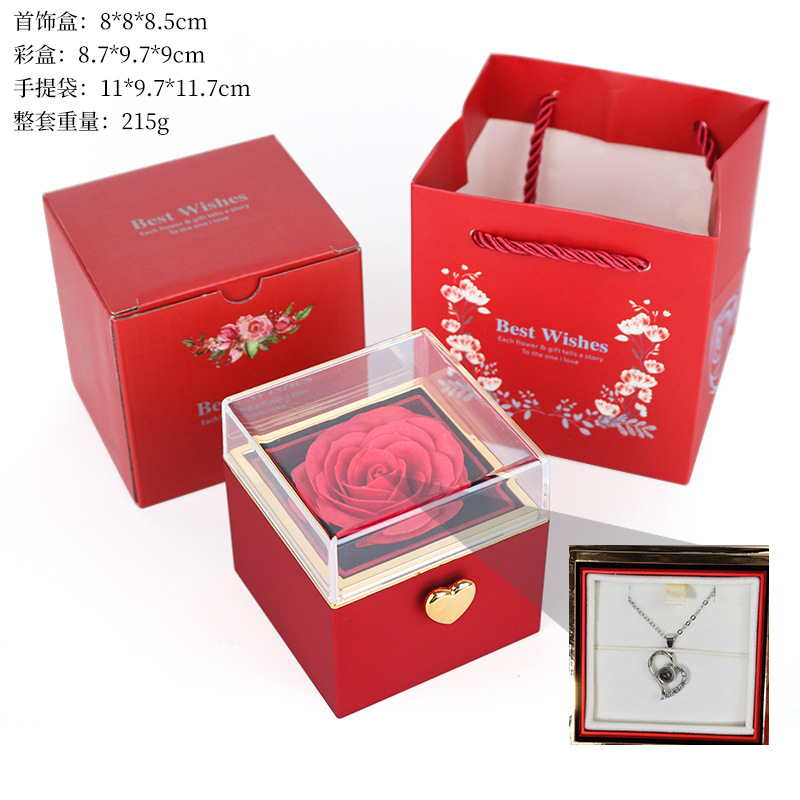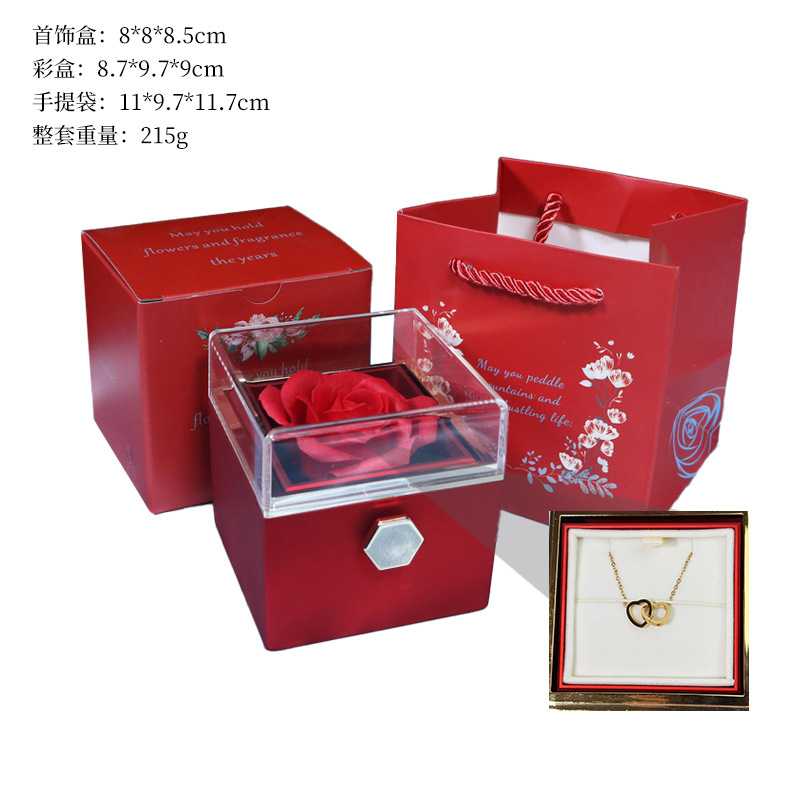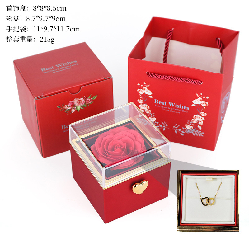 Specifications and models: Small rotate+double heart necklace; soap flower jewelry box+color box+satchel bag