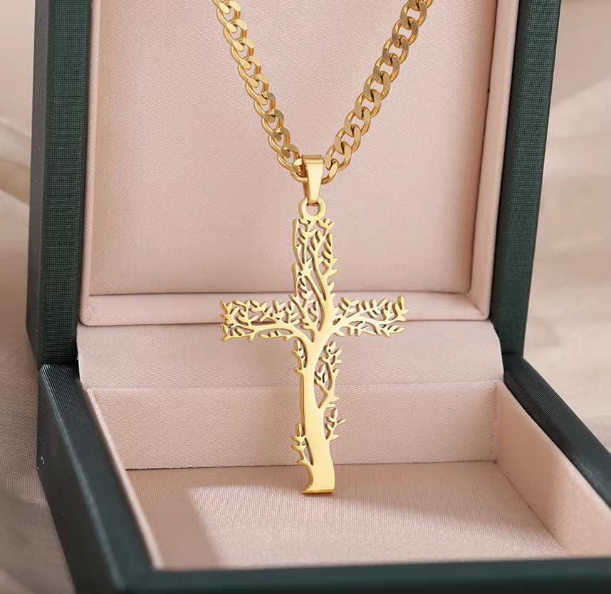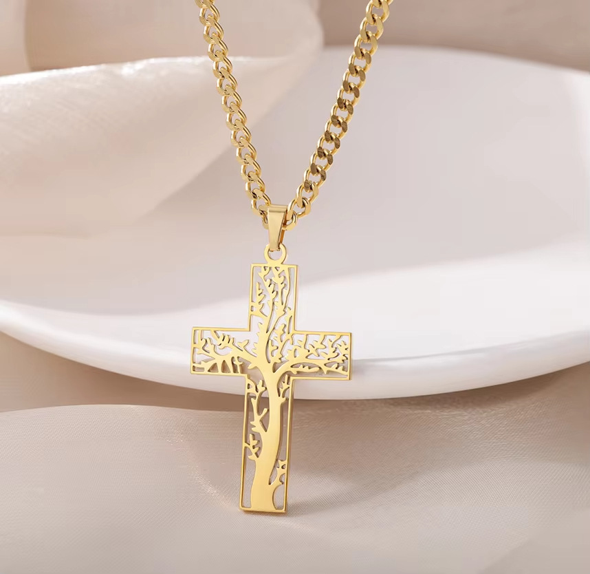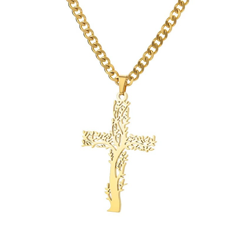Temu Hot Selling Cross-Border New Titanium Steel Men's Tree of Life Cross Necklace Personalized Trendy Brand Stainless Steel Necklace
