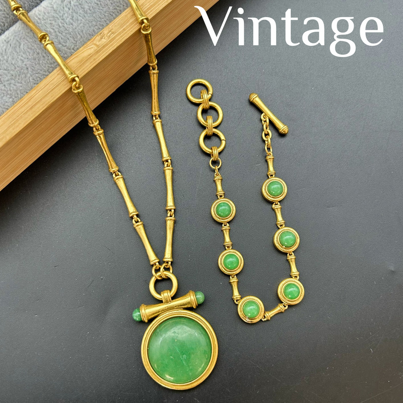 Vintage Copper Plated Real Gold Bamboo Green Aventurine Inlaid Pendant Long Necklace Bracelet Ring Earrings Set