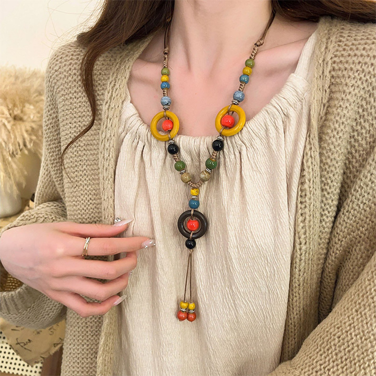 Color: Colorful bead ceramic ring braided rope necklace - about 104cm