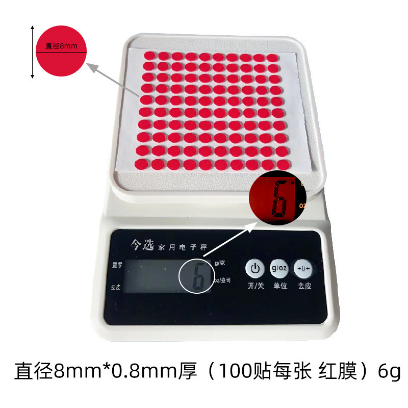 Specifications and models: Red film; round 8mm, thick 0.8mm, 100 pieces/sheet