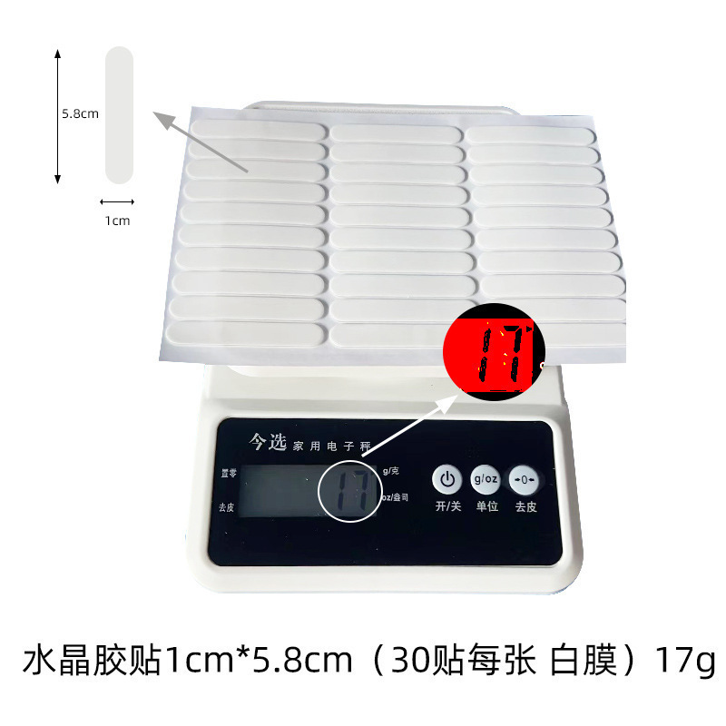 Specifications and models: White film; crystal adhesive sticker 10mm*58mm 30 pieces/sheet white