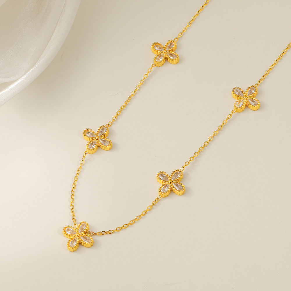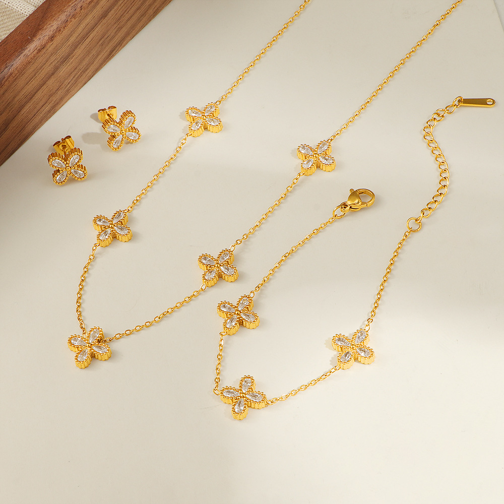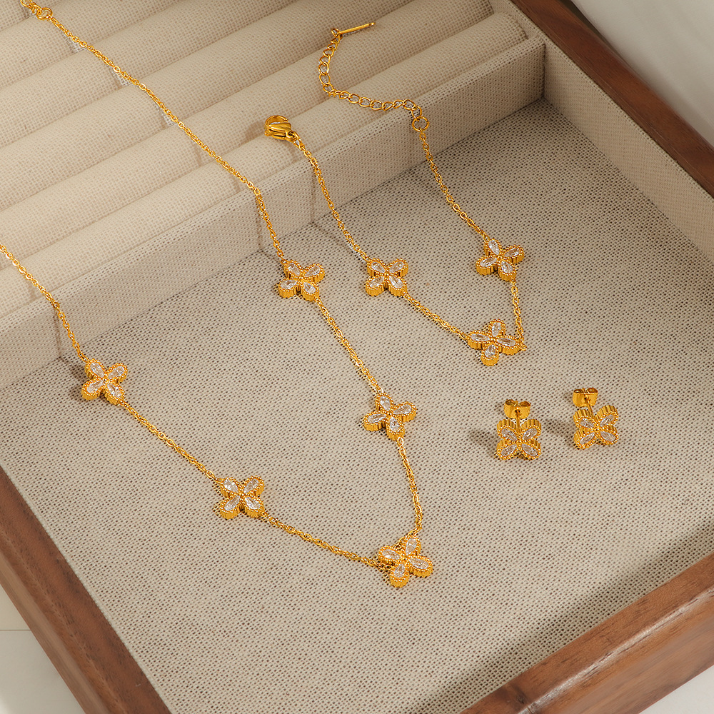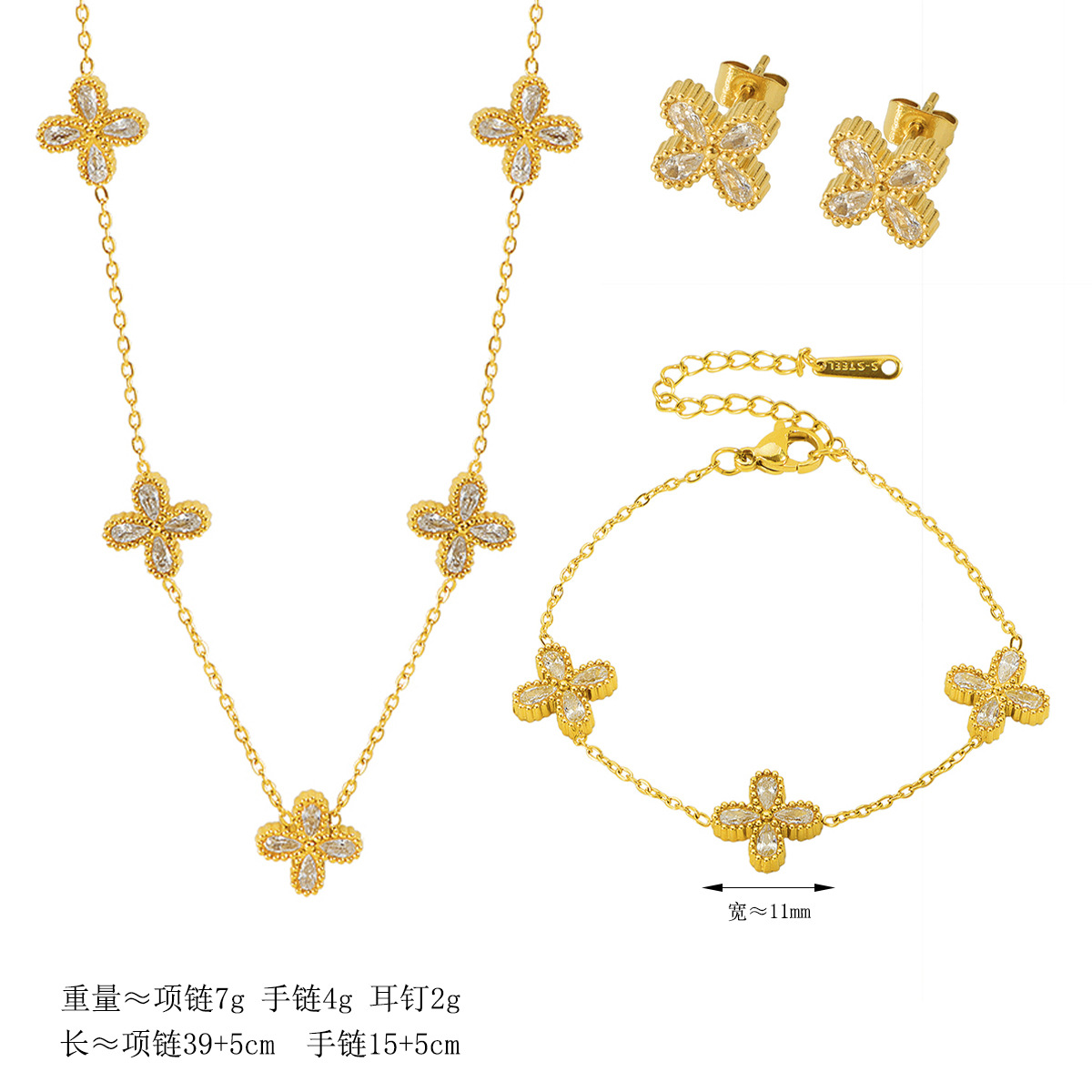 New Titanium Steel Four-Leaf Clover White Diamond Non-Fading Fresh and Sweet Flower Necklace Fashion Bracelet Jewelry Set Trend