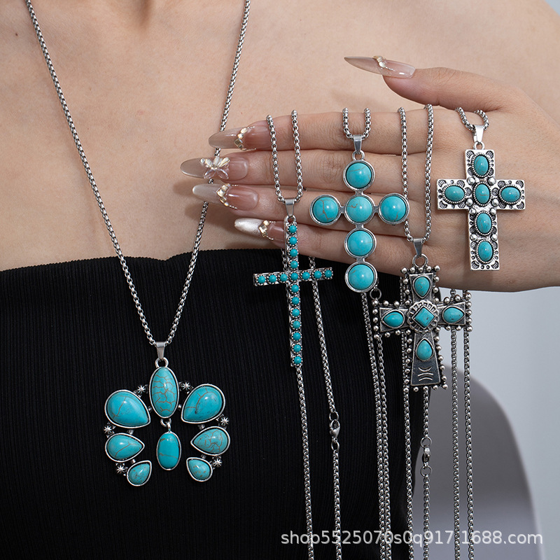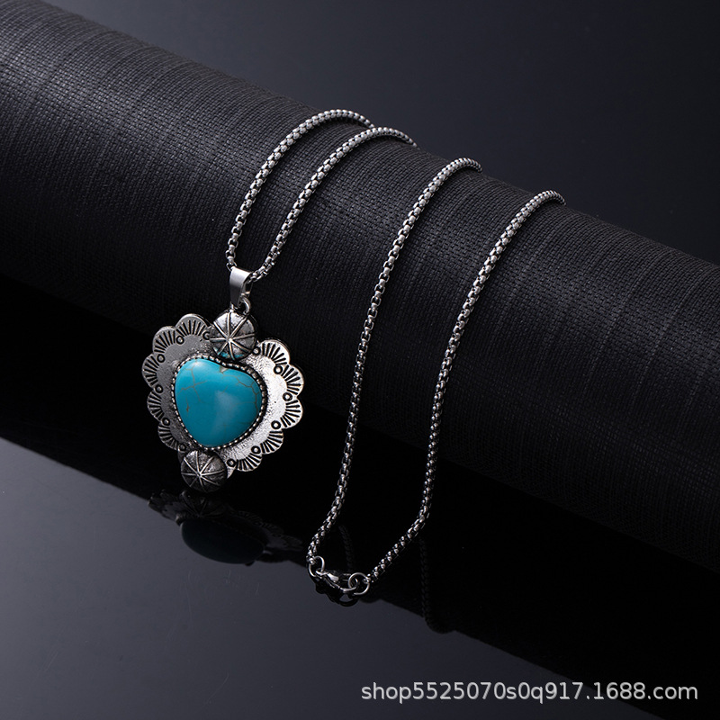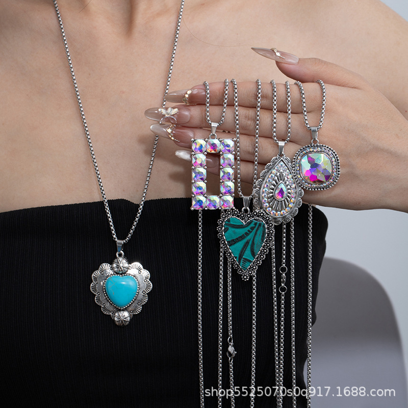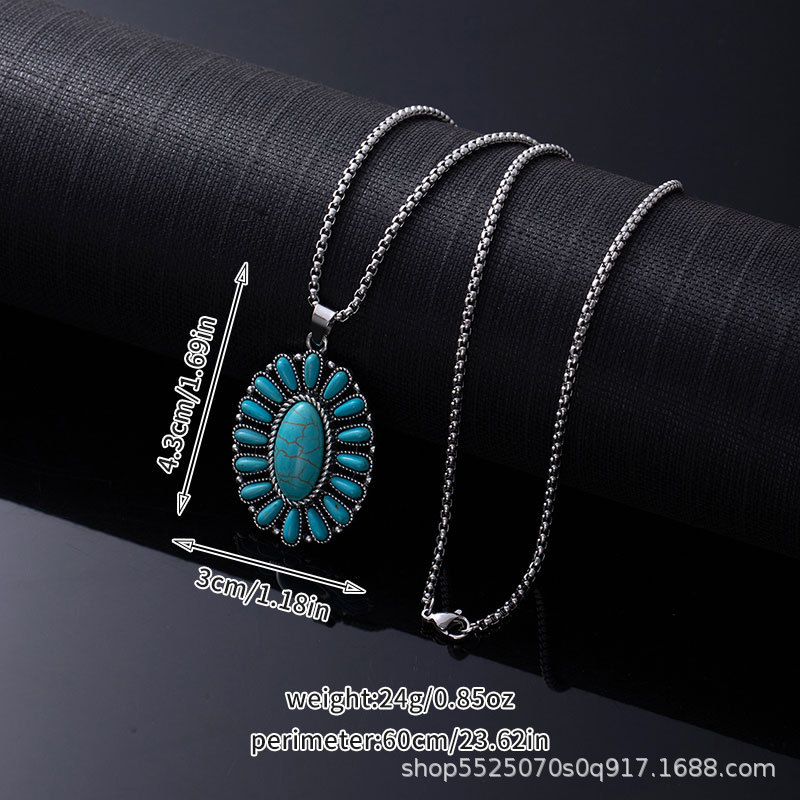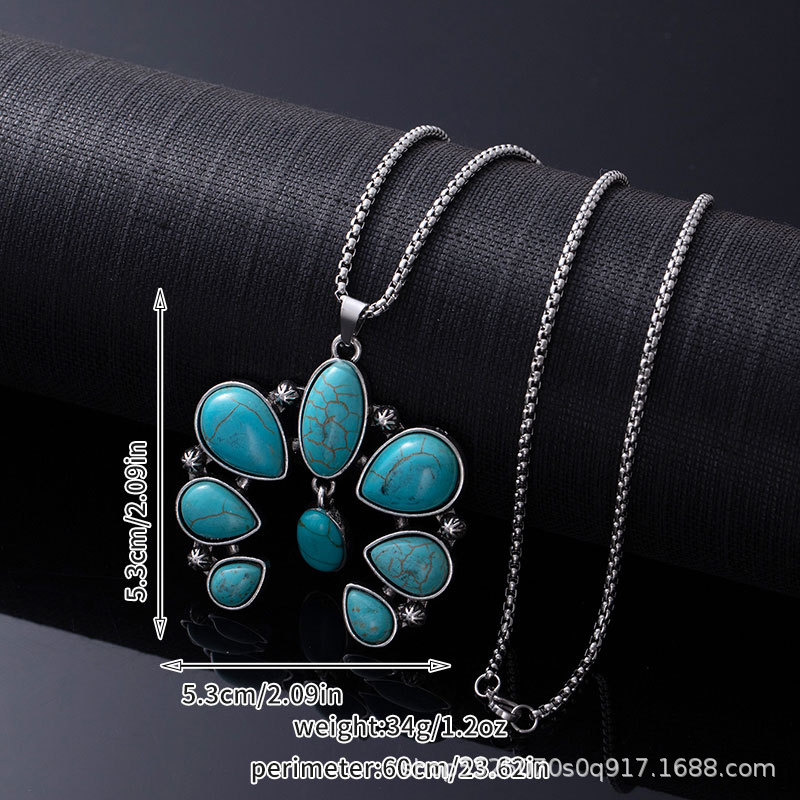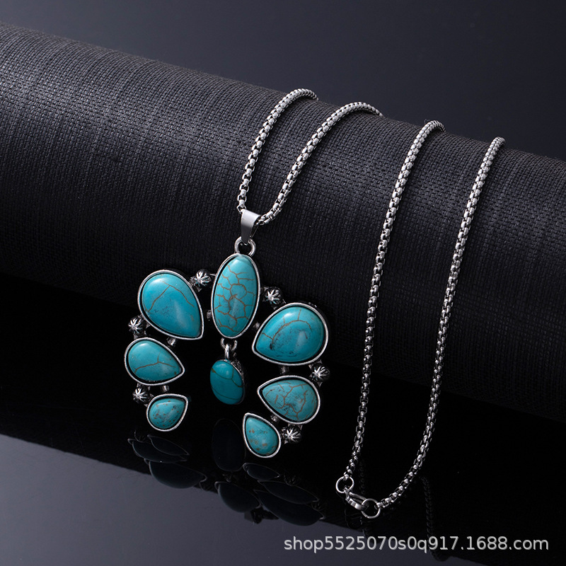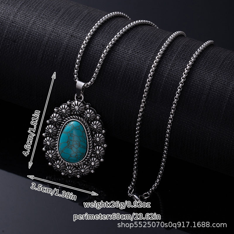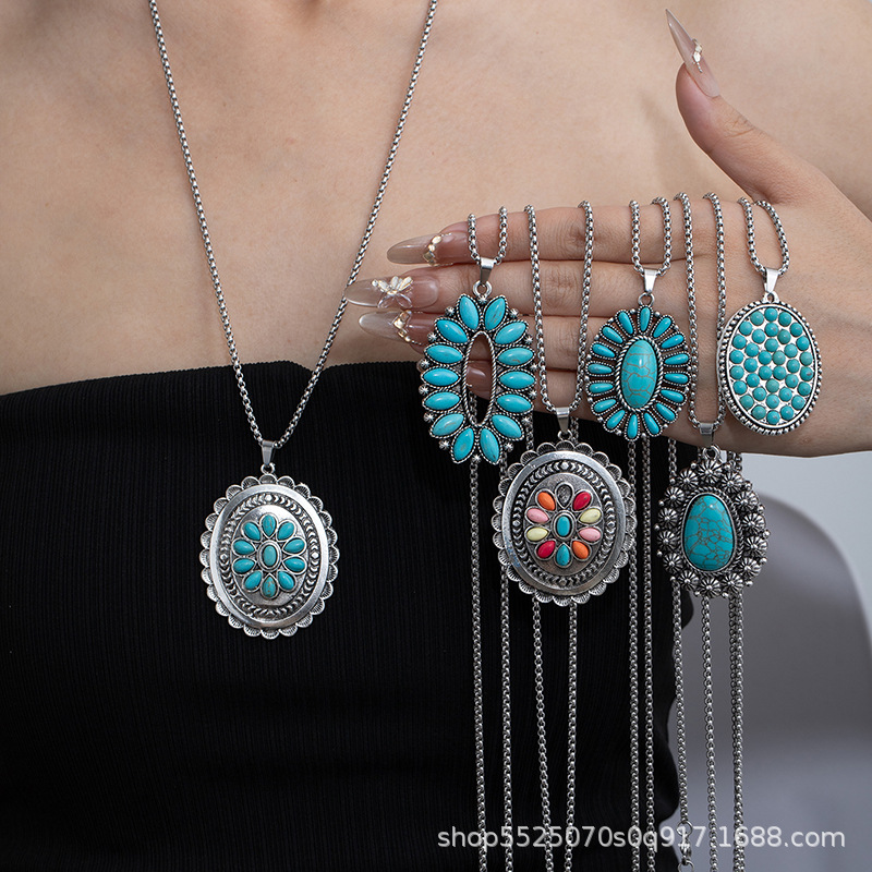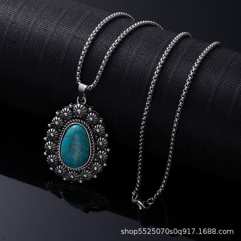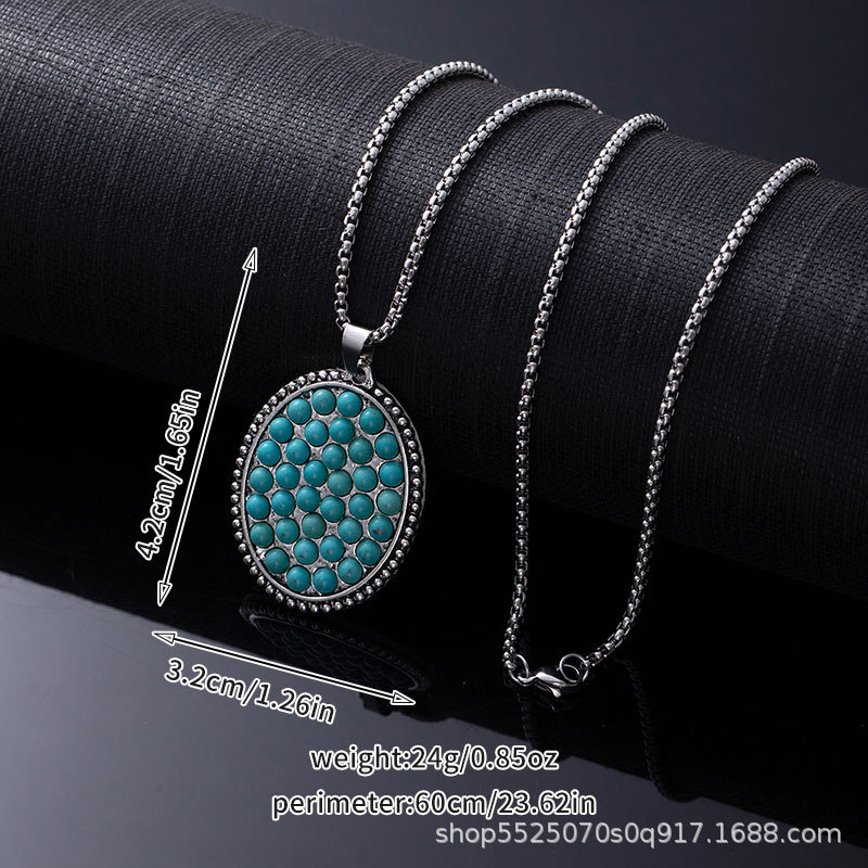 欧美跨境热卖镶绿松石项链女复古百搭波西米亚风时尚几何项链饰品批发货源