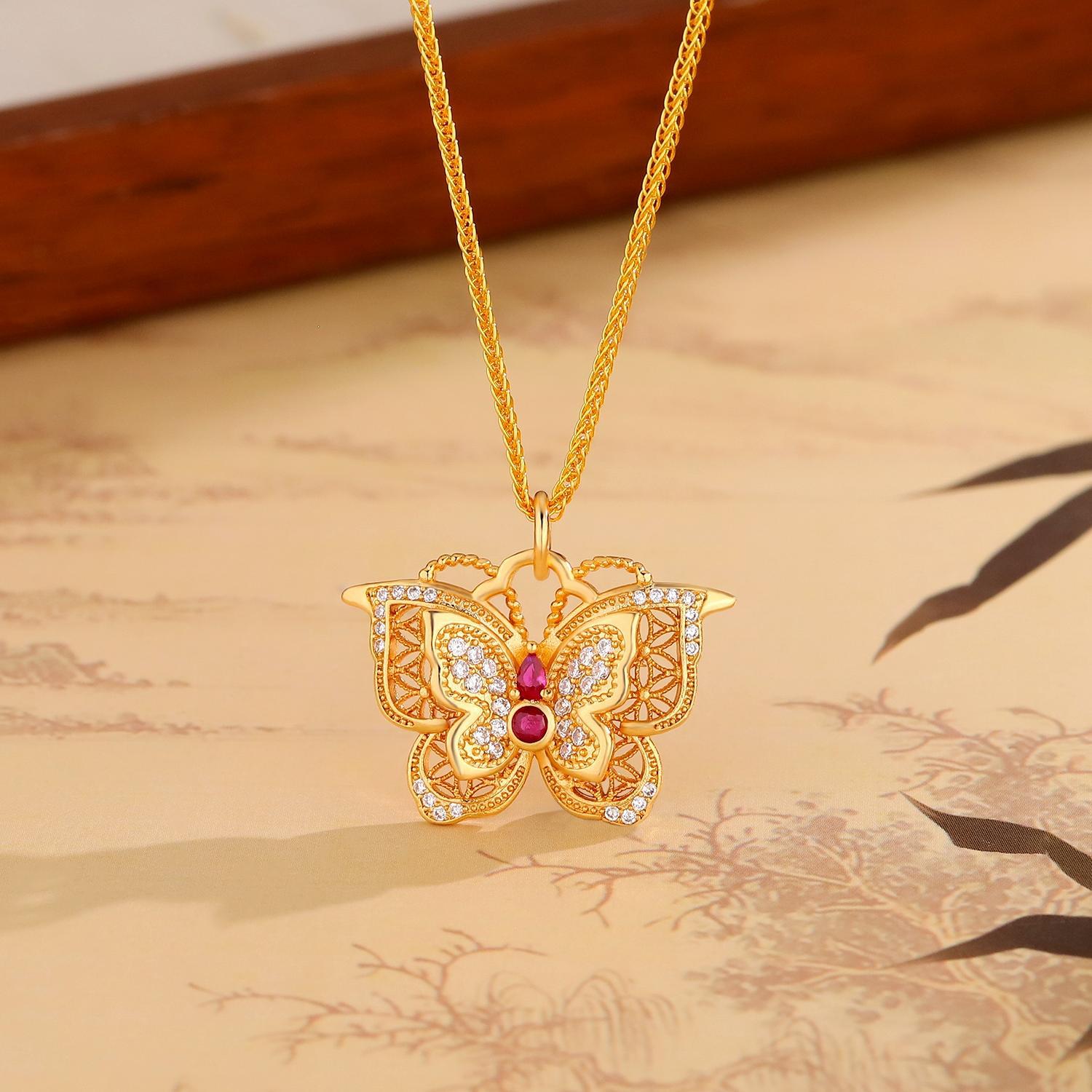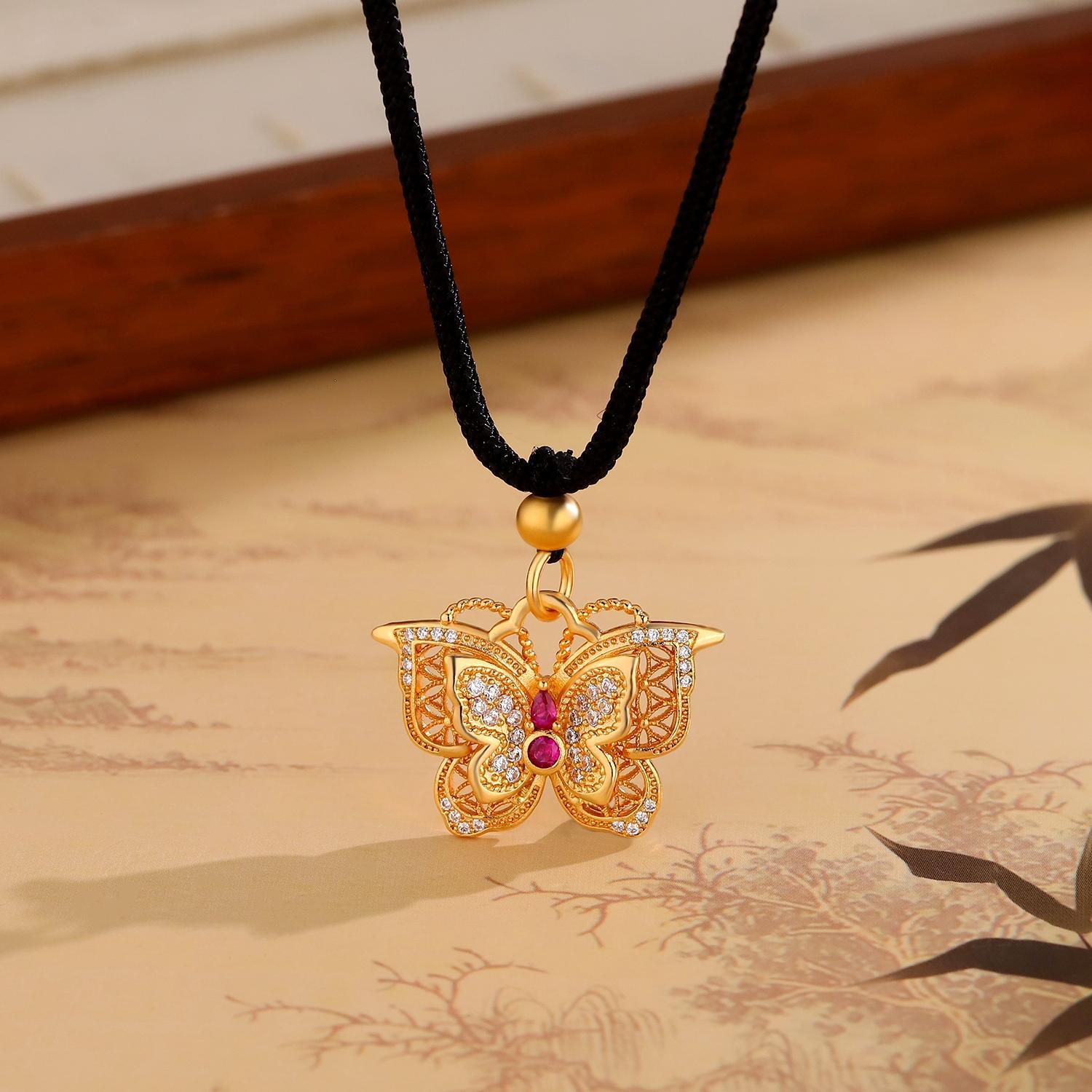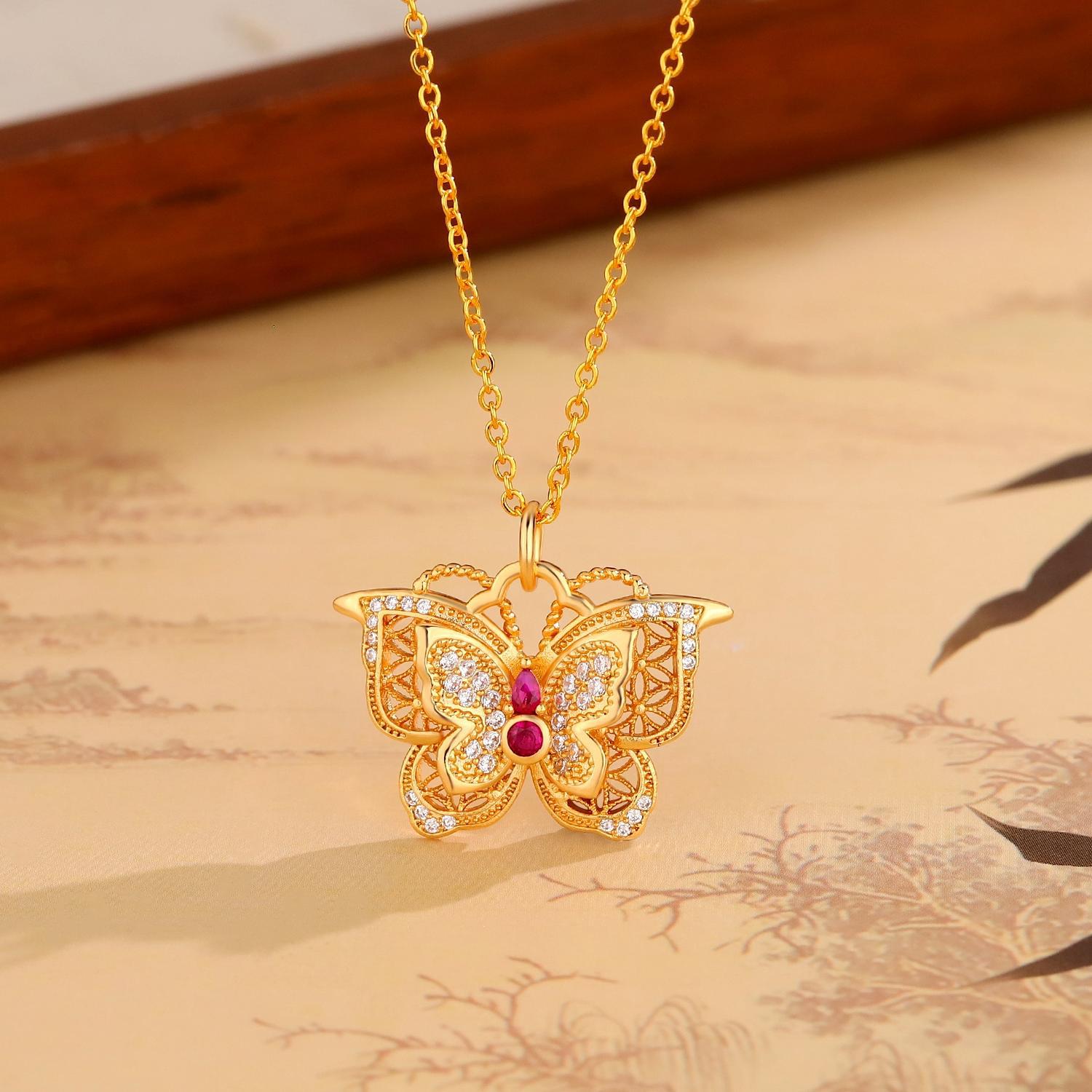 Pointed Diamond Exquisite Flower Butterfly Necklace for Women, New Chinese Style Hollow Design Filigree Double-Layer Butterfly Clavicle Chain as a Gift for Your Girlfriend