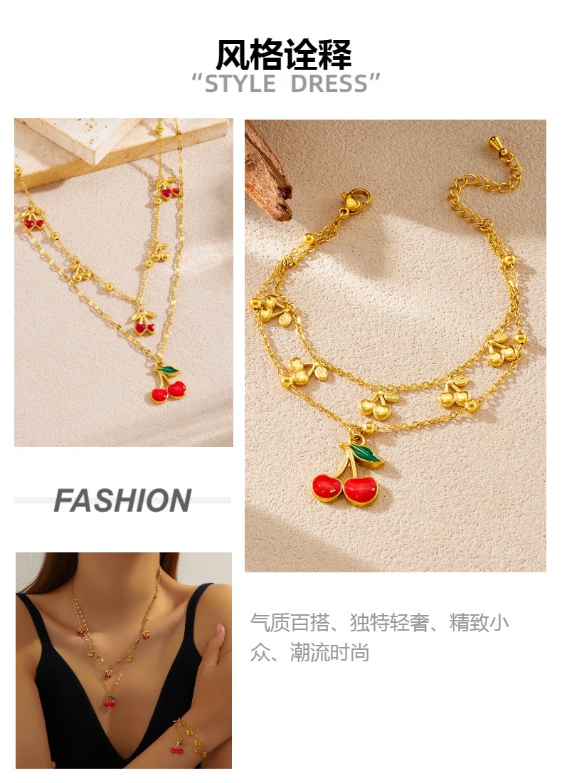 Korean-Style Minimalist Ins-Style Oil-Drip Diamond-Studded Cherry Fruit Pendant Accessories Stackable Stainless Steel Gold-Plated Set