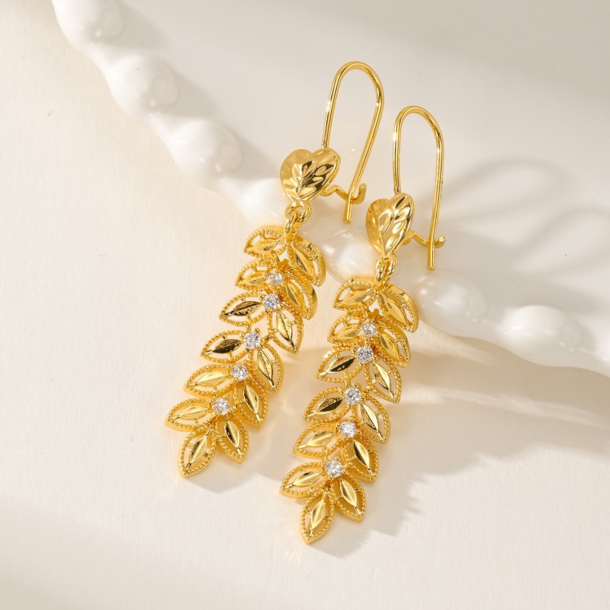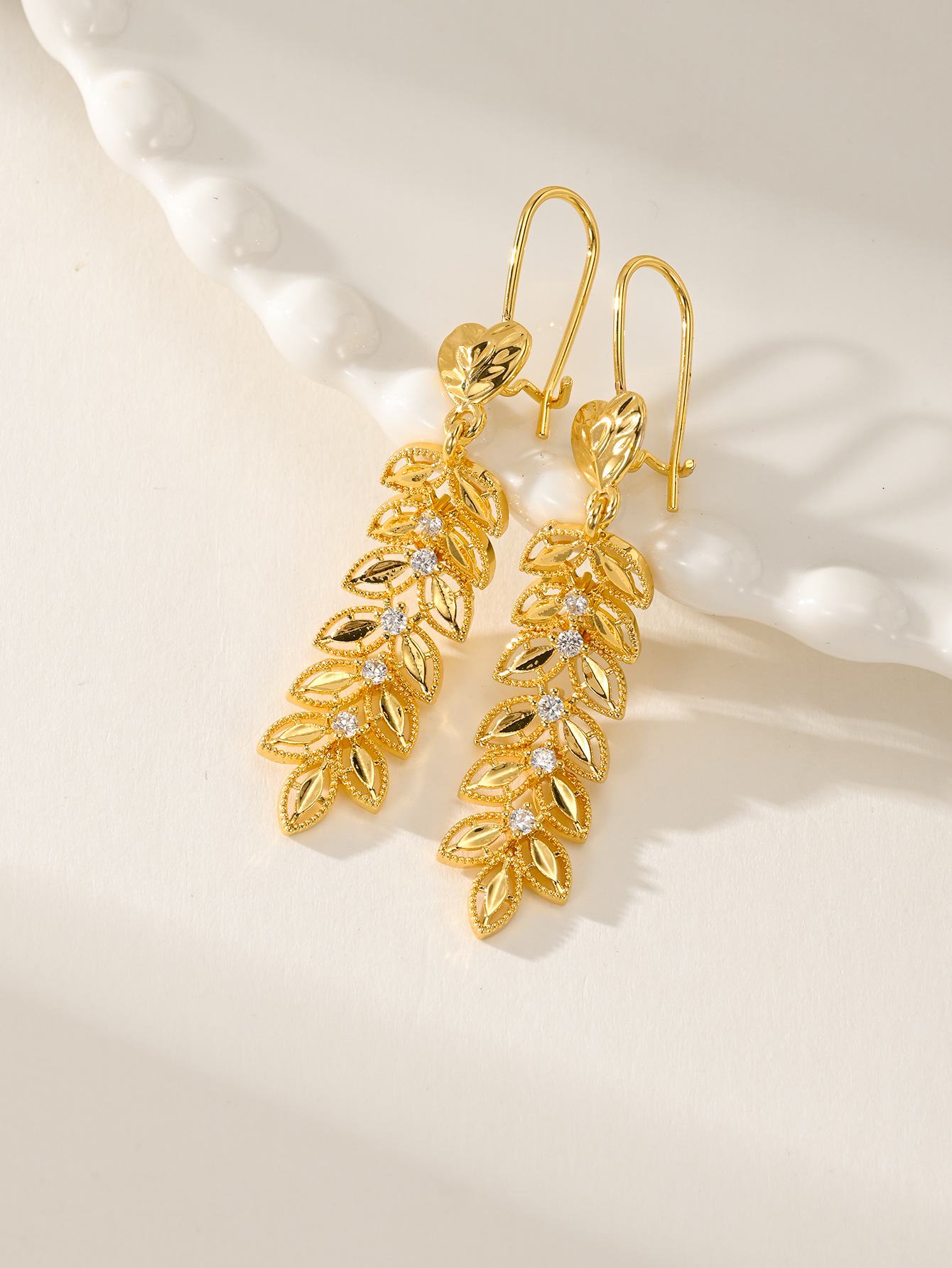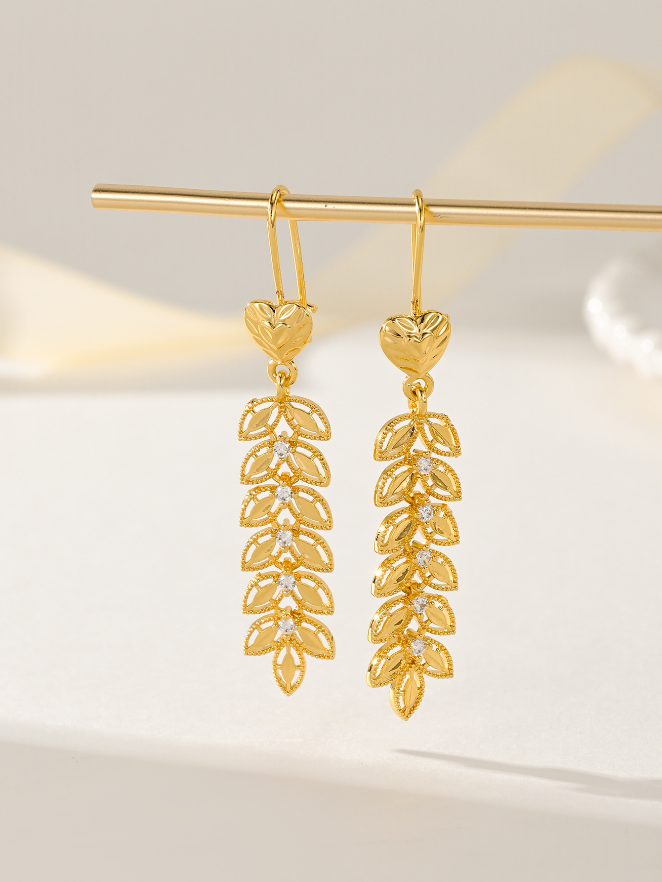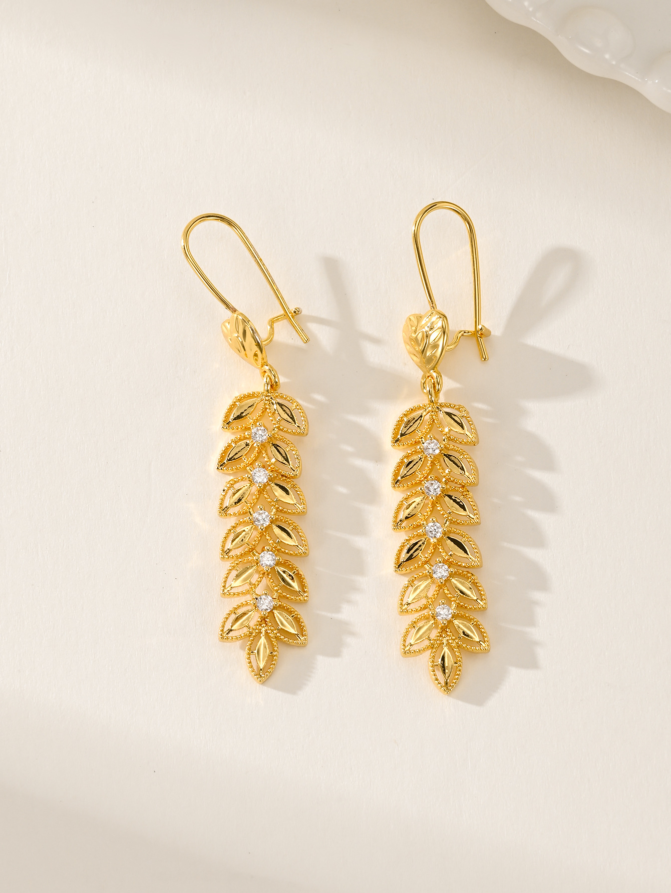 Cross-Border Golden Wheat Leaf Tassel Earrings Inlaid with Zircon French Fashion Earrings Women's Niche Earrings Light Luxury and High-End
