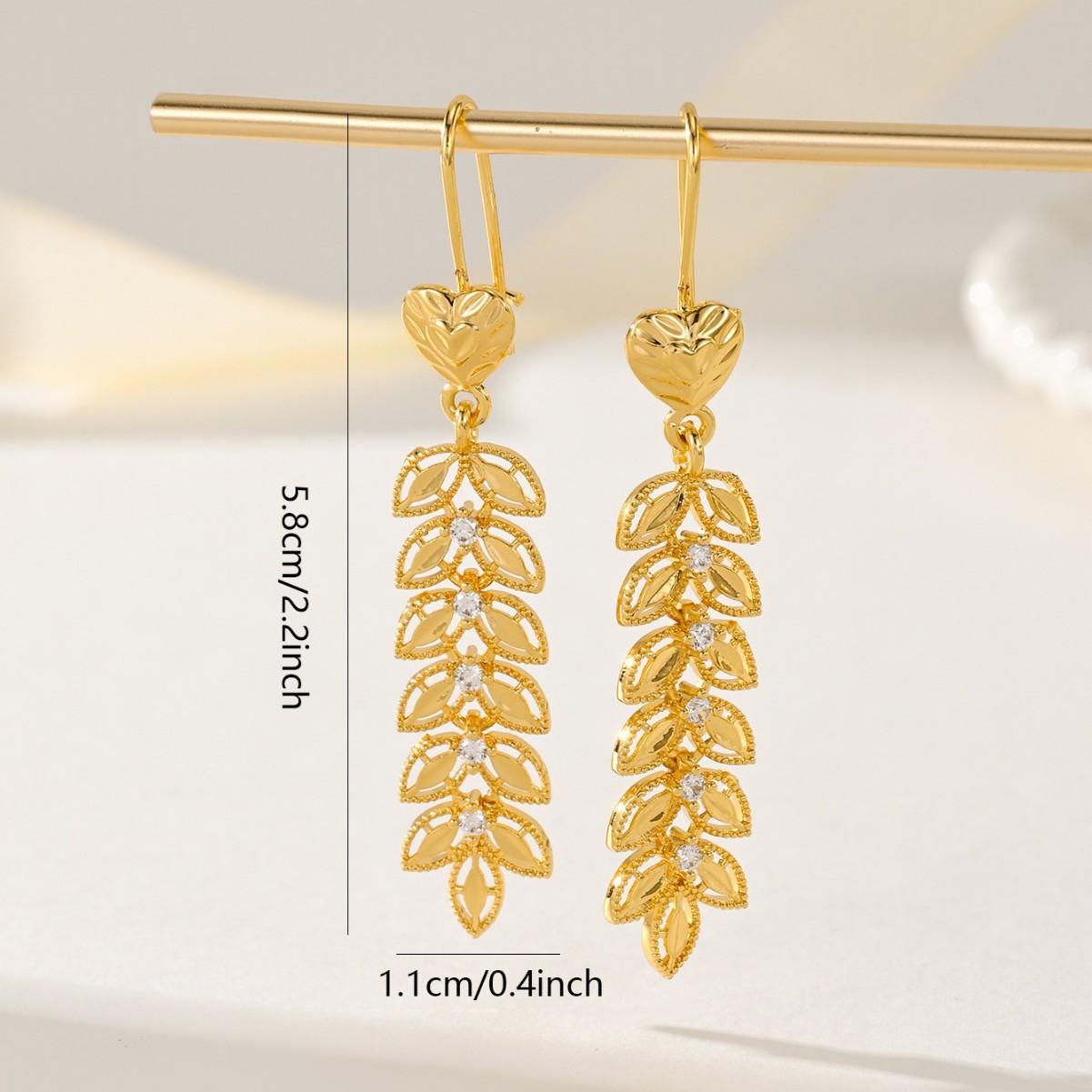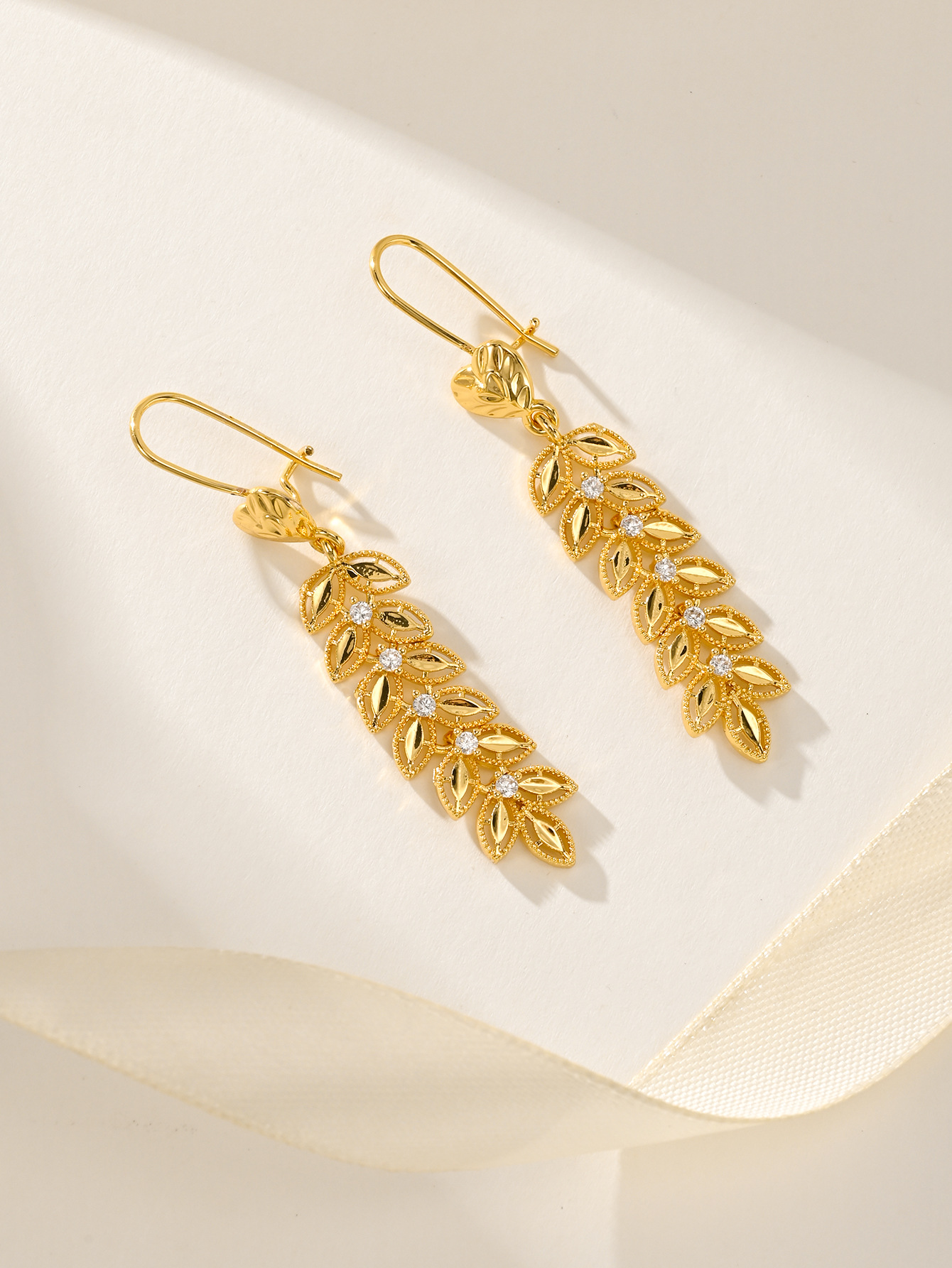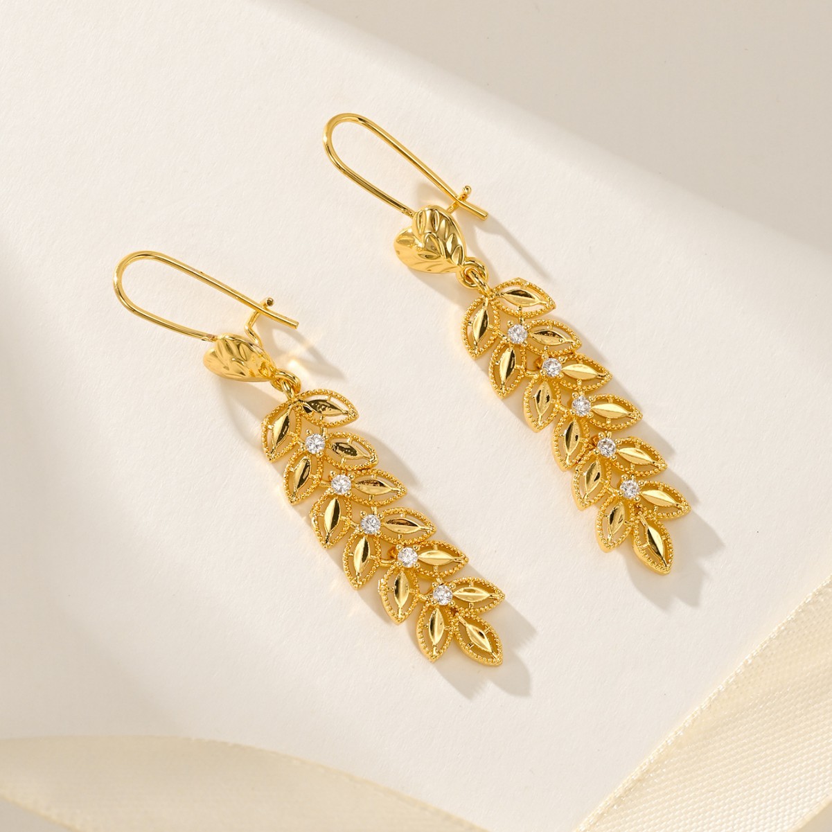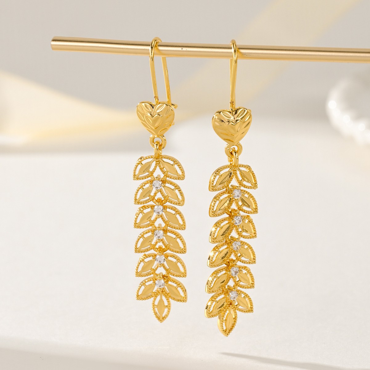 Cross-Border Golden Wheat Leaf Tassel Earrings Inlaid with Zircon French Fashion Earrings Women's Niche Earrings Light Luxury and High-End