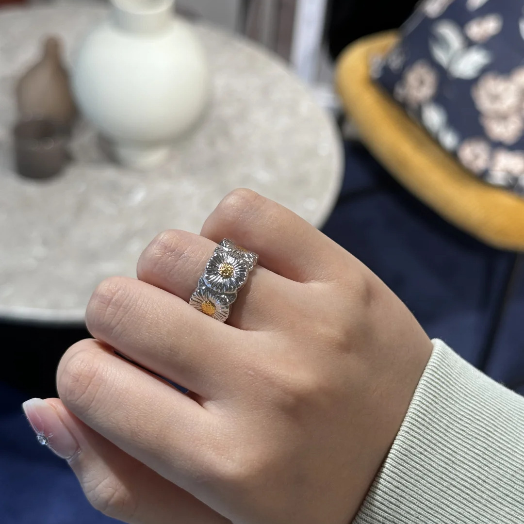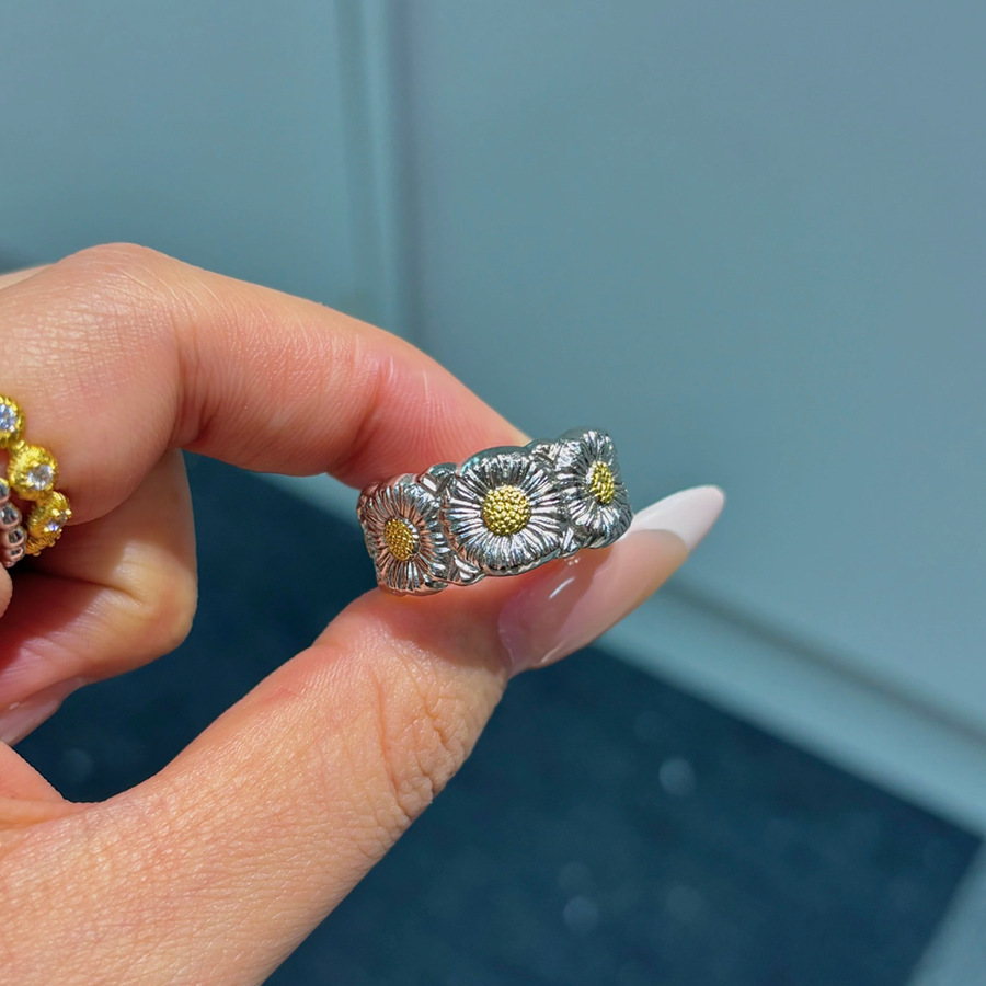 Italian Handmade Brushed Fabric Two-Tone Gold Daisy Ring, Same Style as G-Dragon's Couple Adjustable Women's Ring