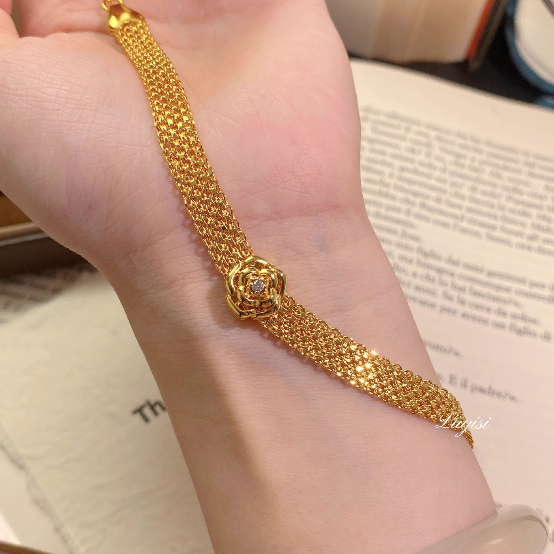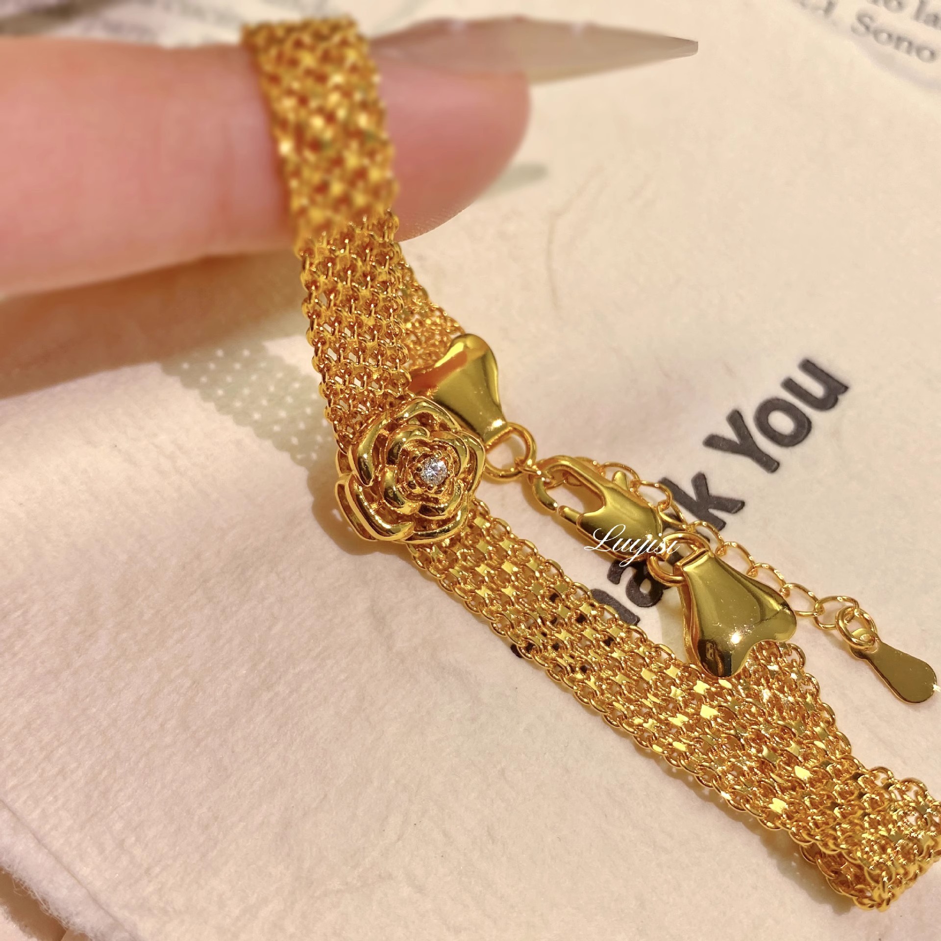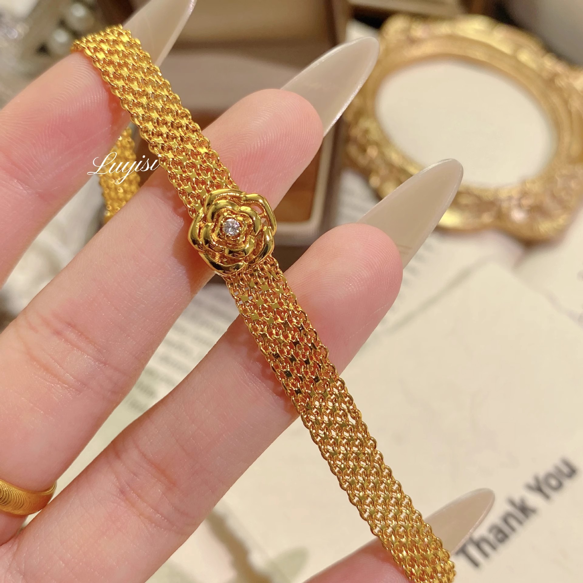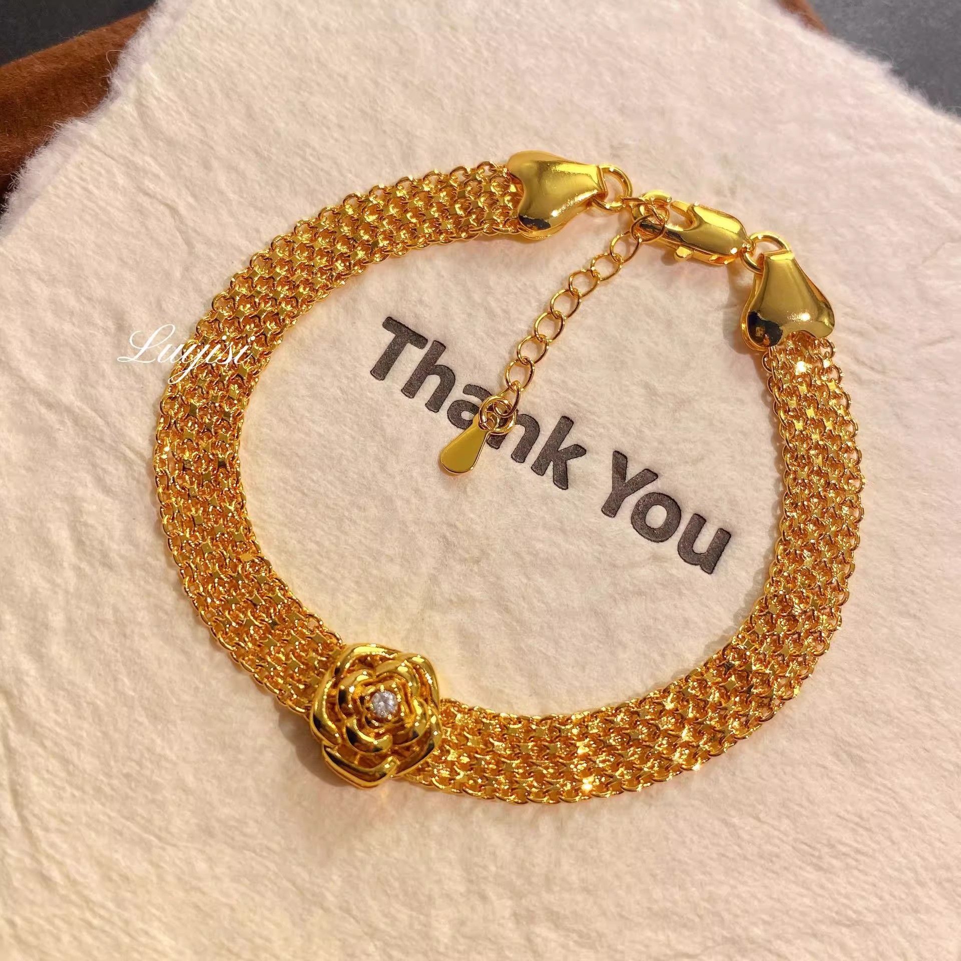 Vintage Rose Flower Bracelet with a Light Luxury Retro Satin Inlaid with Diamonds, High-End Exquisite Chanel-Style Jewelry