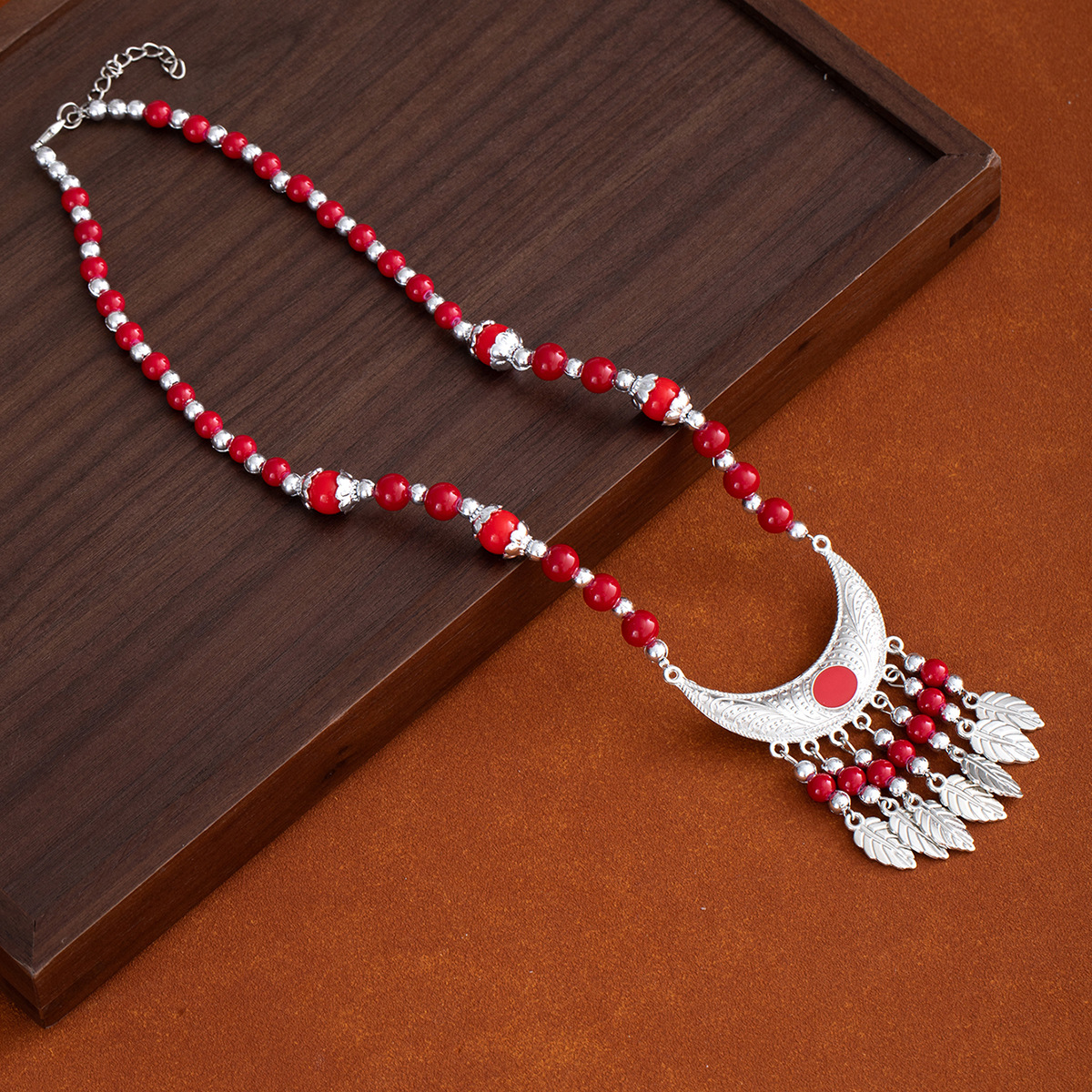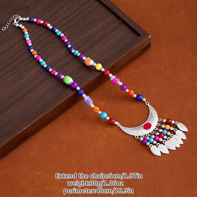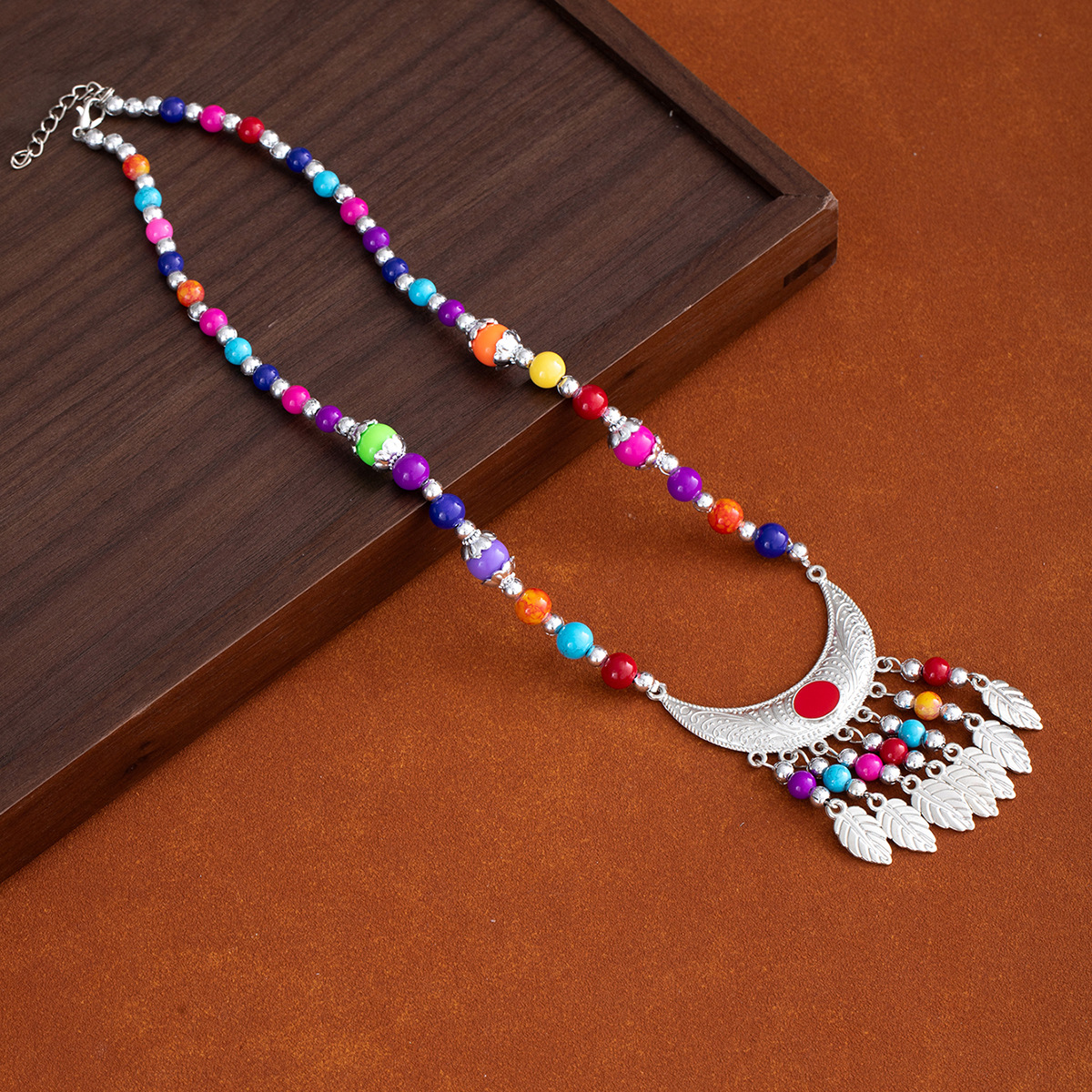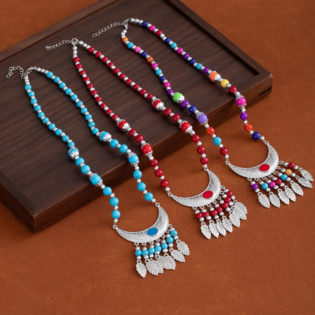 仿苗银复古藏式民族风手工项链波西米亚额链月亮叶子流苏彩珠头饰女饰品批发货源
